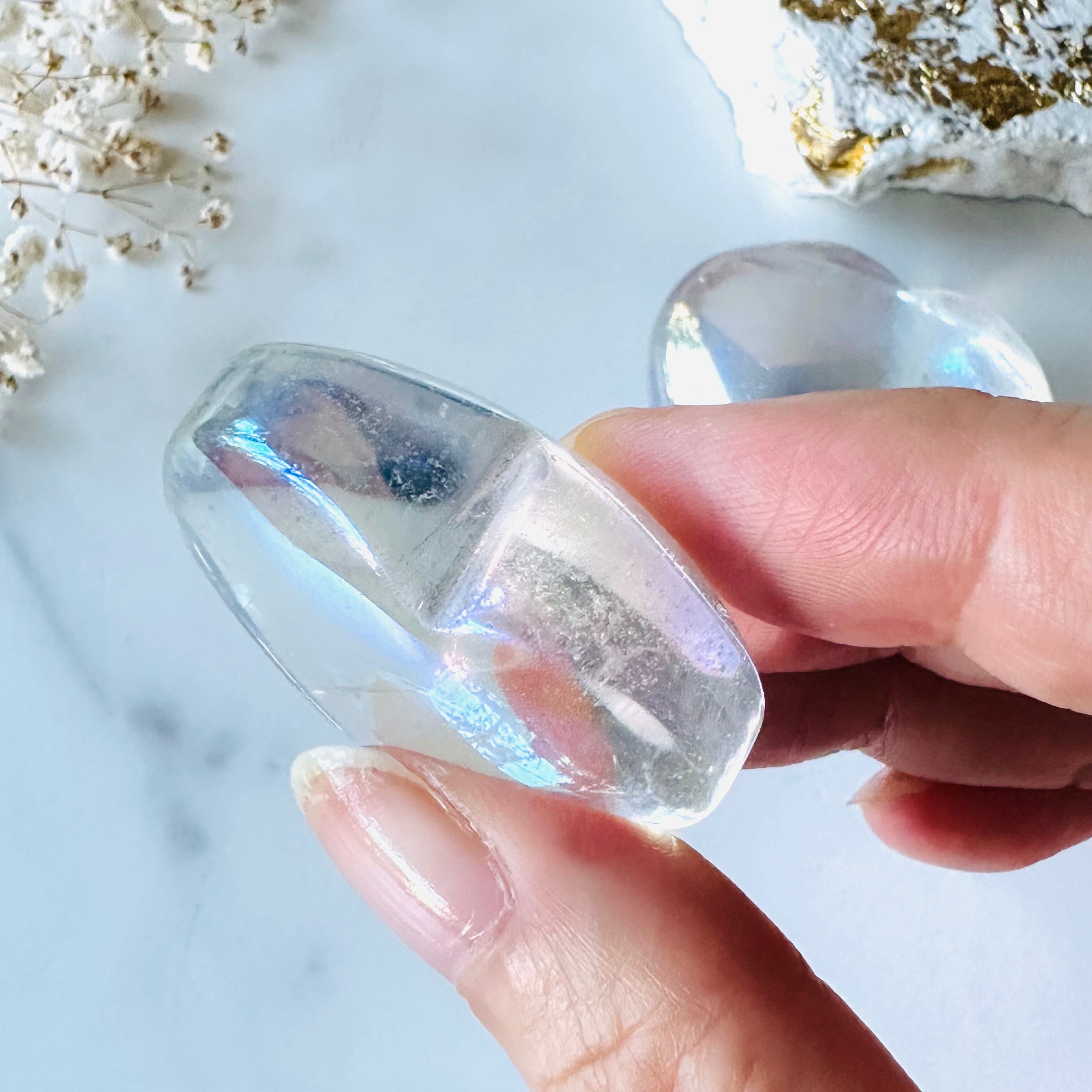 天然水晶に金属の膜を蒸着させたもので、虹のように七色の光を放ちます。神秘的で美しいだけでなく、水晶の持つ浄化力やエネルギーをより強化すると言われています。