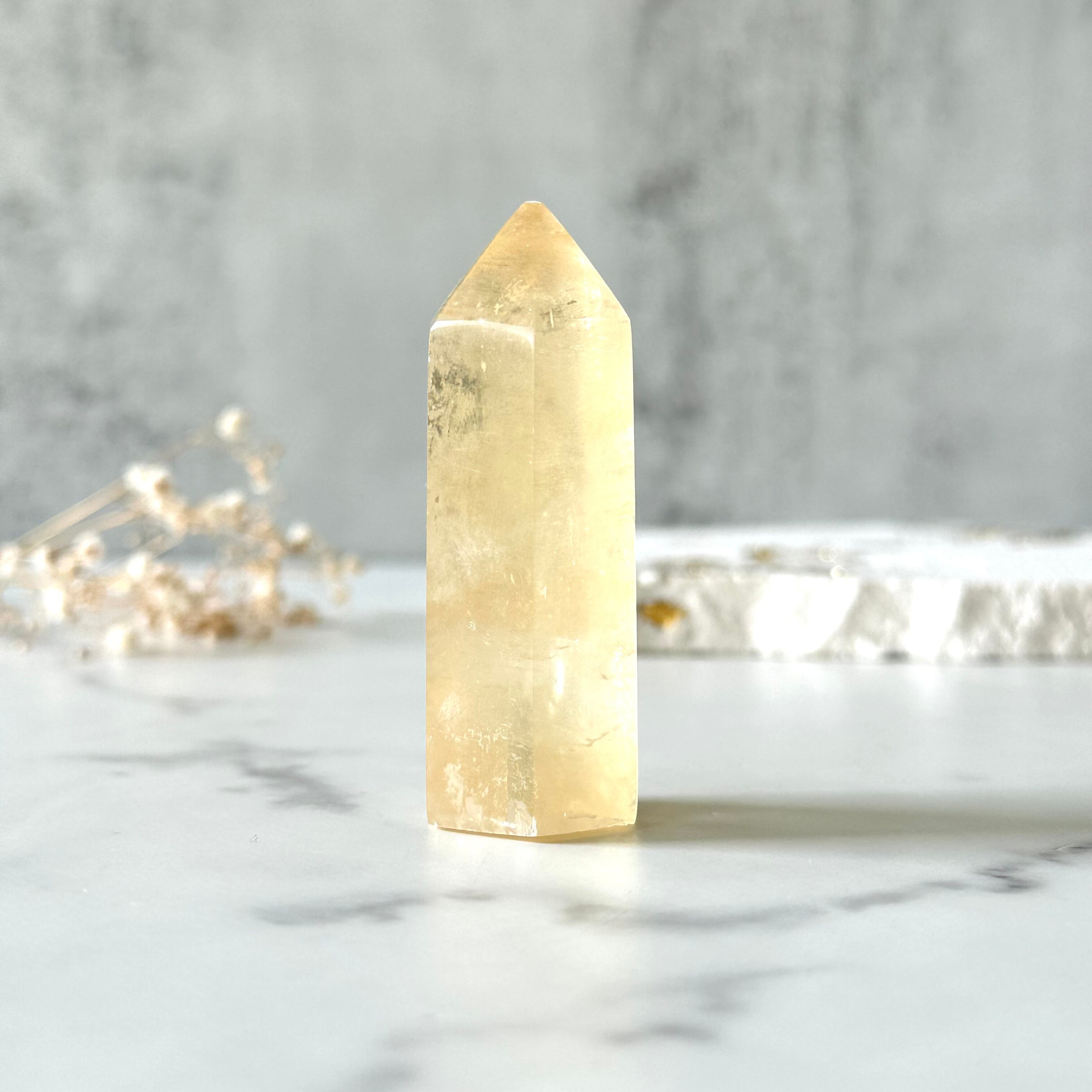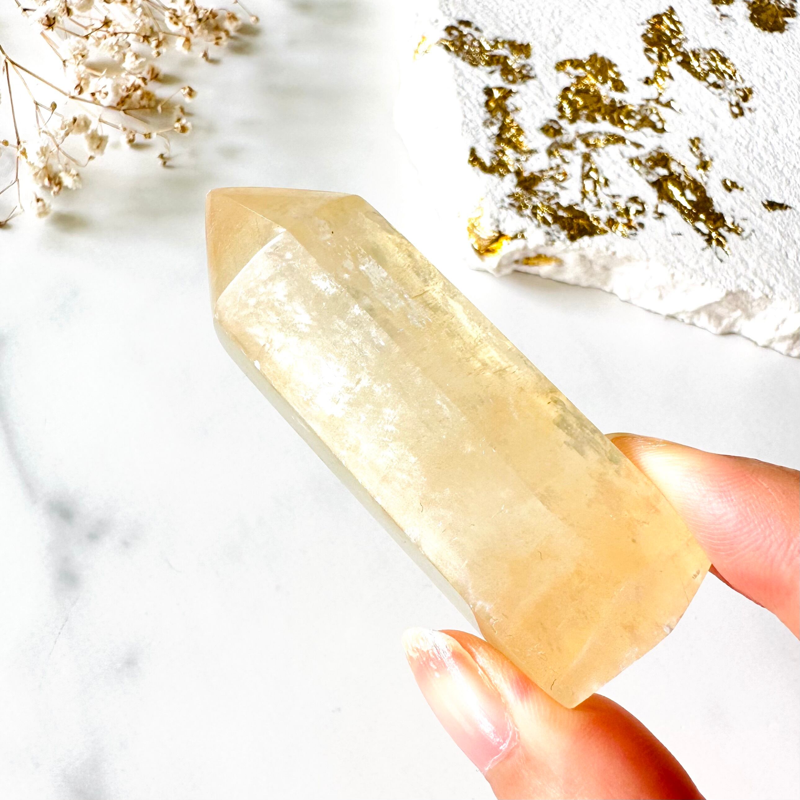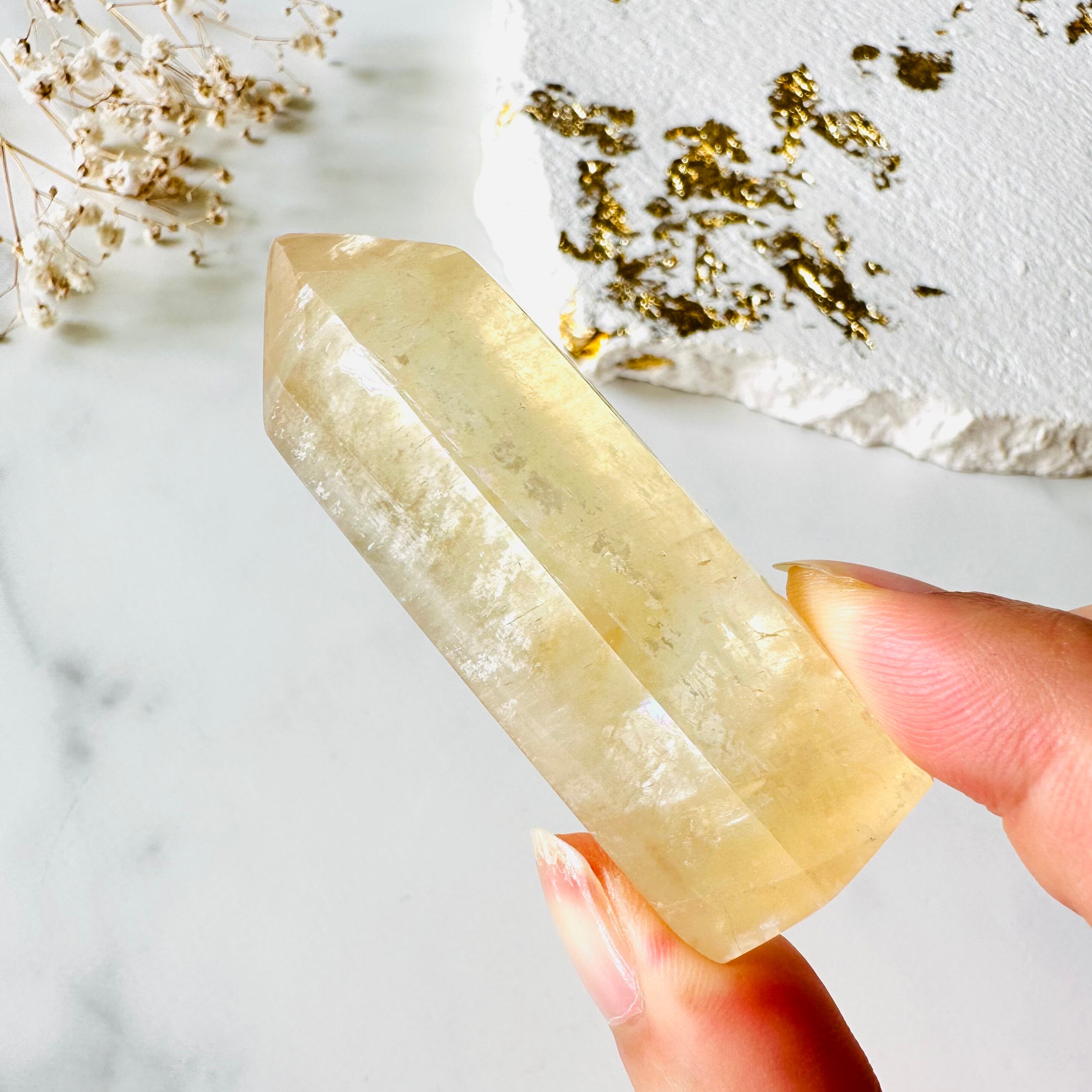 花の蜜のようにとろりと艶のある美しい色調に、光がたっぷり入ってキラキラ輝きとても綺麗です。ところどころに虹も見られます。カルサイトは波動が穏やかで、心身に優しい癒しを届けてくれます。
