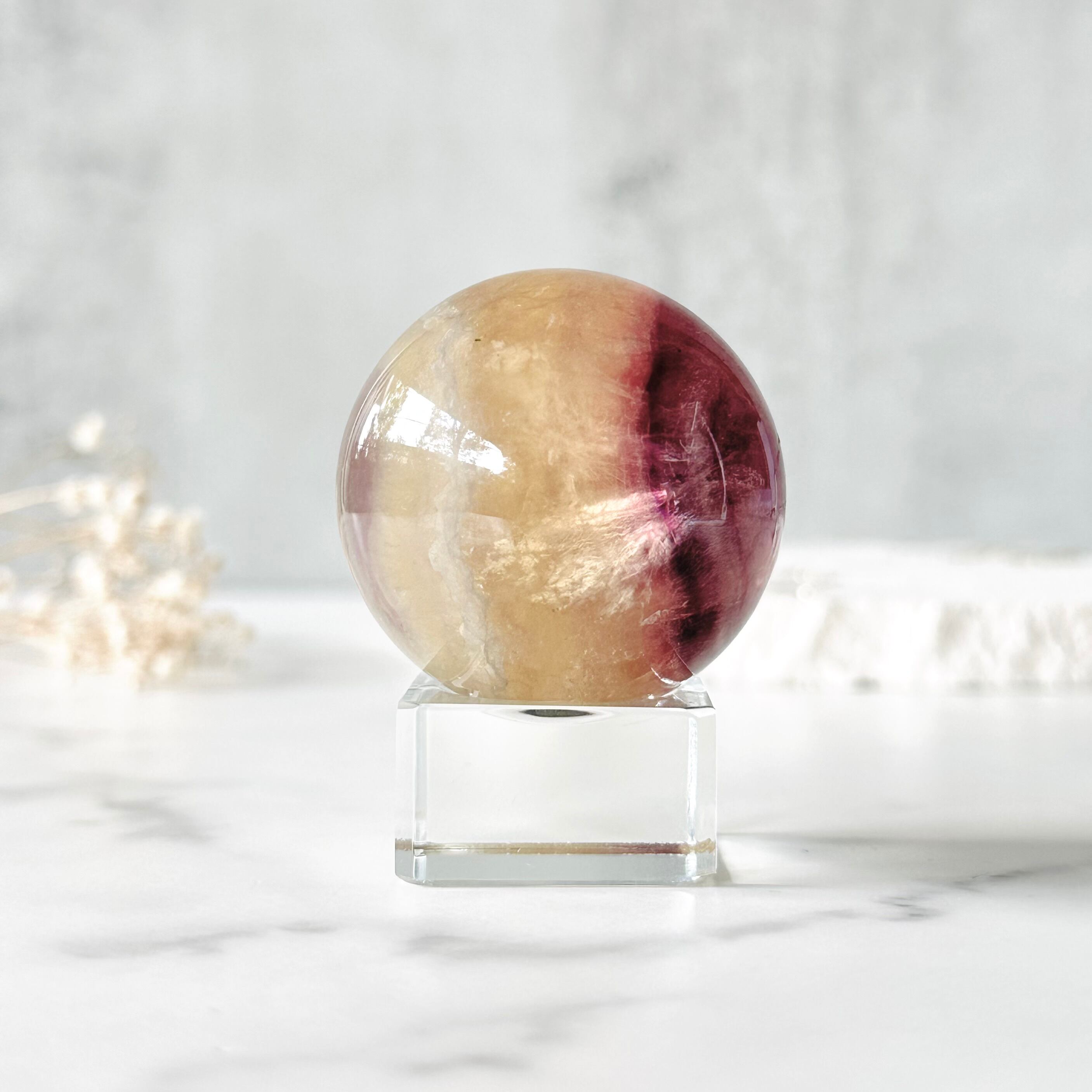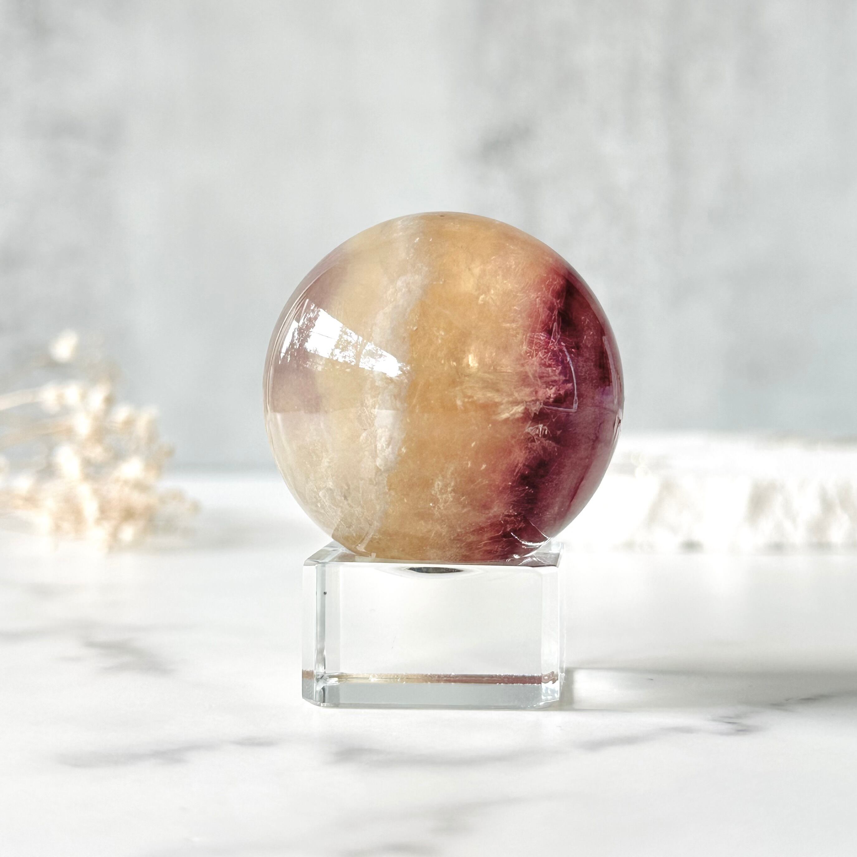 透き通った石の中に氷の柱のようなフローライトの質感が綺麗で、内部に虹も映し出します。パープルとイエローのバイカラーが魅力のキャンディフローライトスフィア。手の中でくるくる回していつまでも眺めていたいアイテムです。