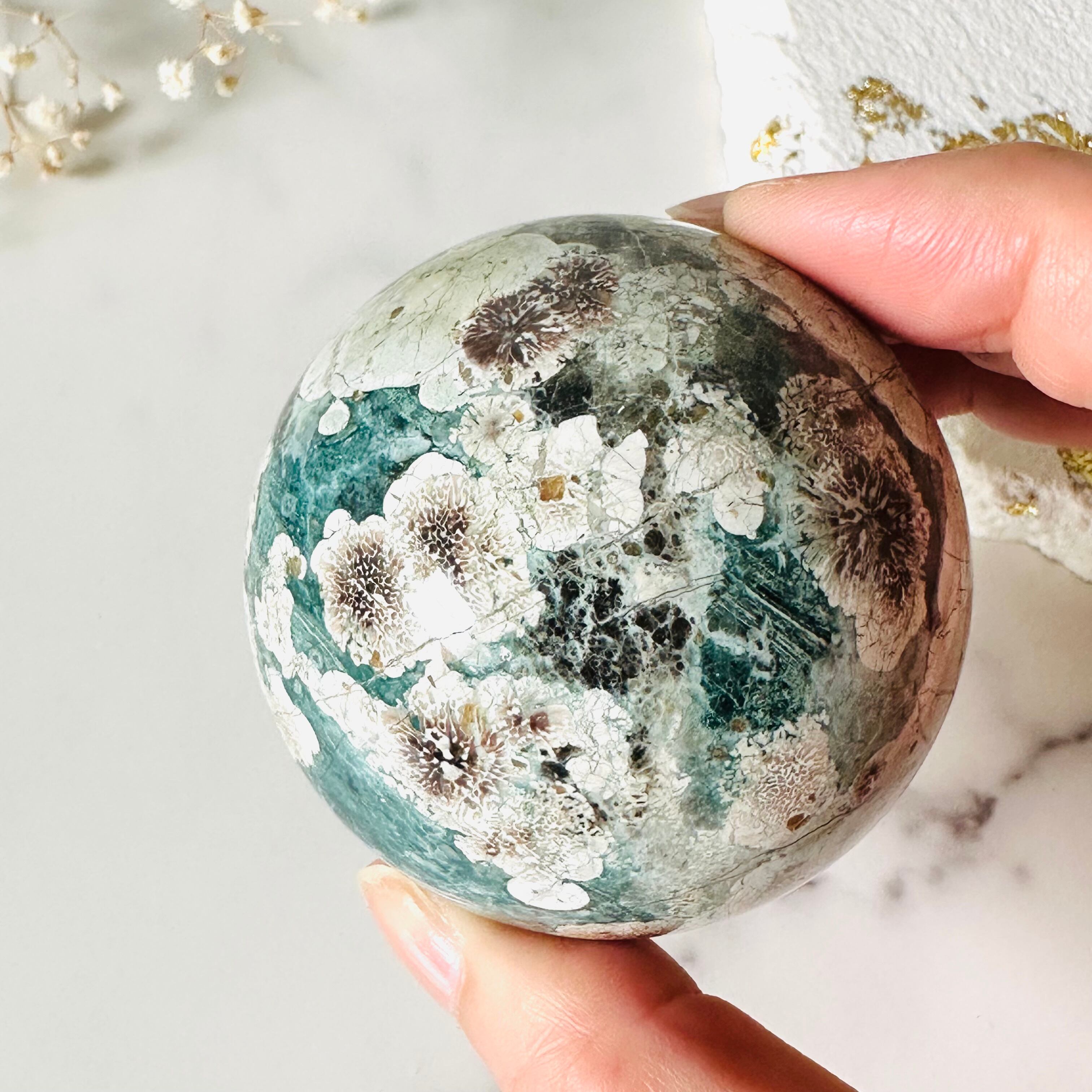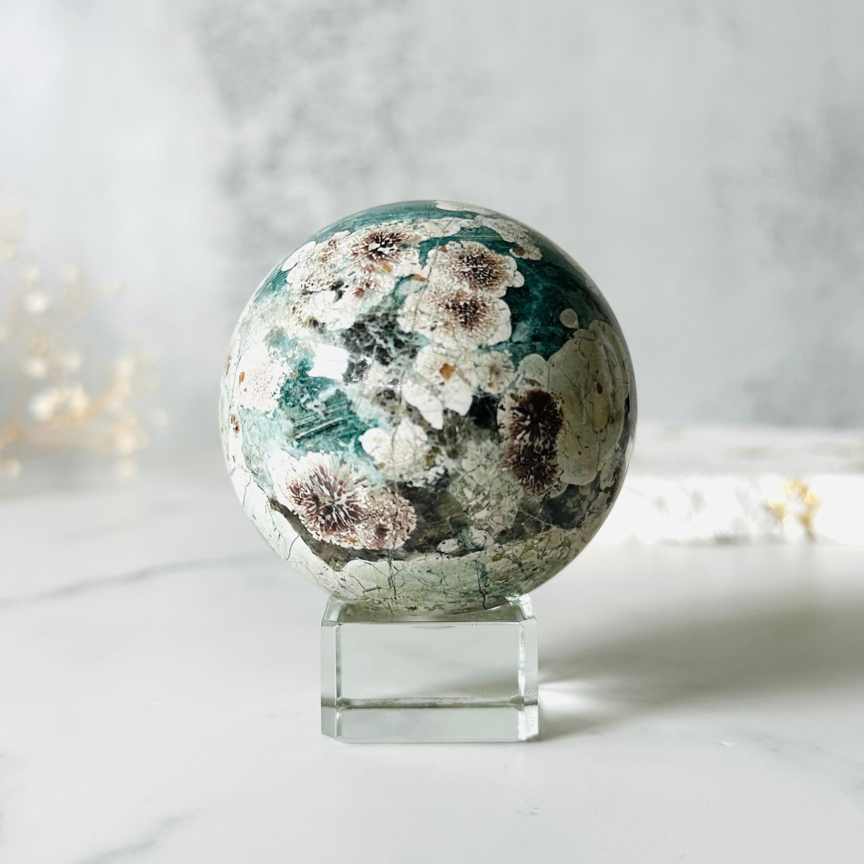 自然の美しさを感じながらこのスフィアを手に取ると、自然と一体化したような癒しや安らぎを感じられ、肩の力が解け、ほっと緊張が緩むような感じがします。