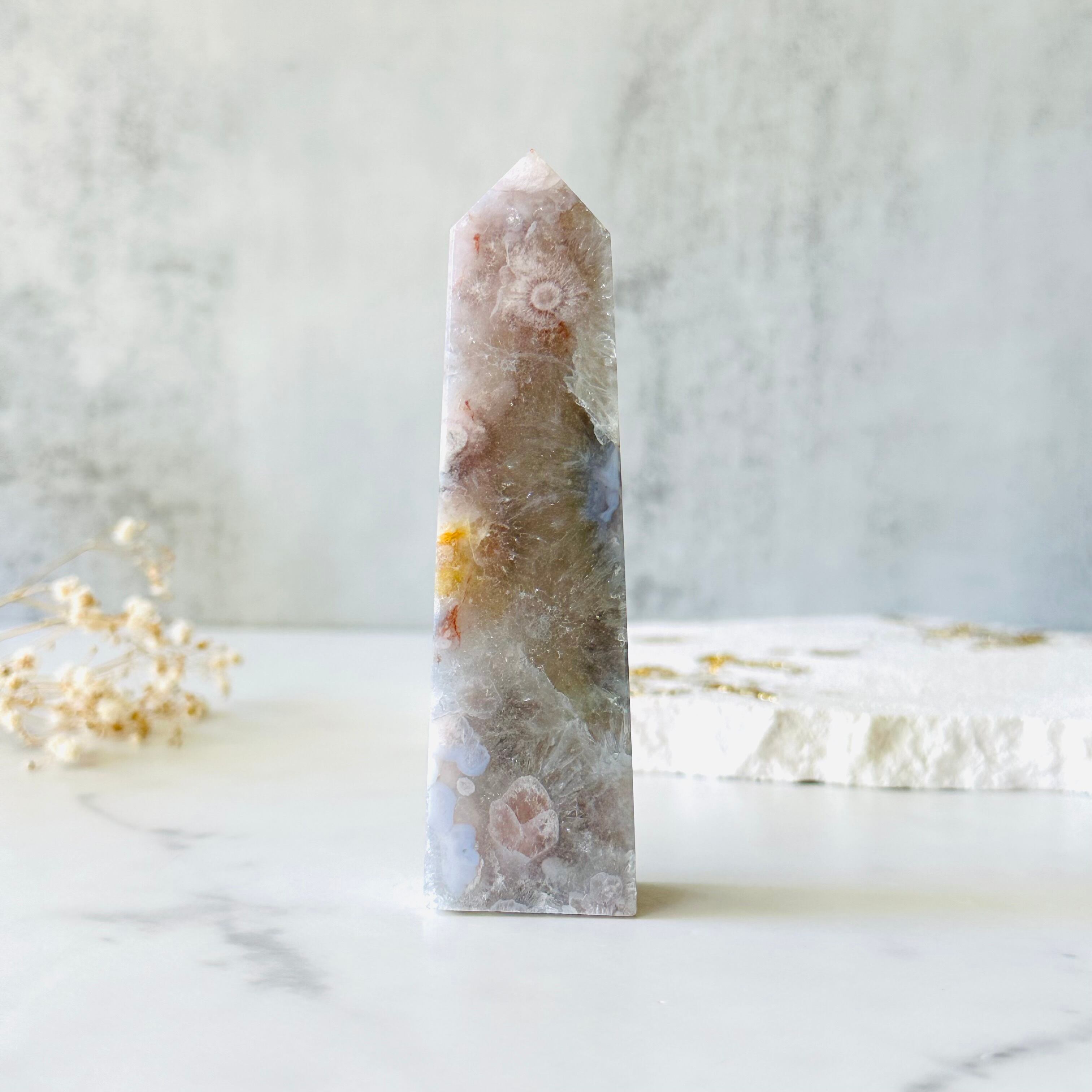 色味を抑えたライトグレーのアメジストがザクザクした質感のタワーで、侵食するアゲートは陶器のような質感です。水に浮かぶようにふんわりと淡いピンク色のお花が咲いています。フラワーアゲートは可愛らしい印象ですが、この個体は大人女子に馴染む自然な可愛らしさがあります。アメジストの結晶が光を受けキラキラしてとても綺麗なタワーです。