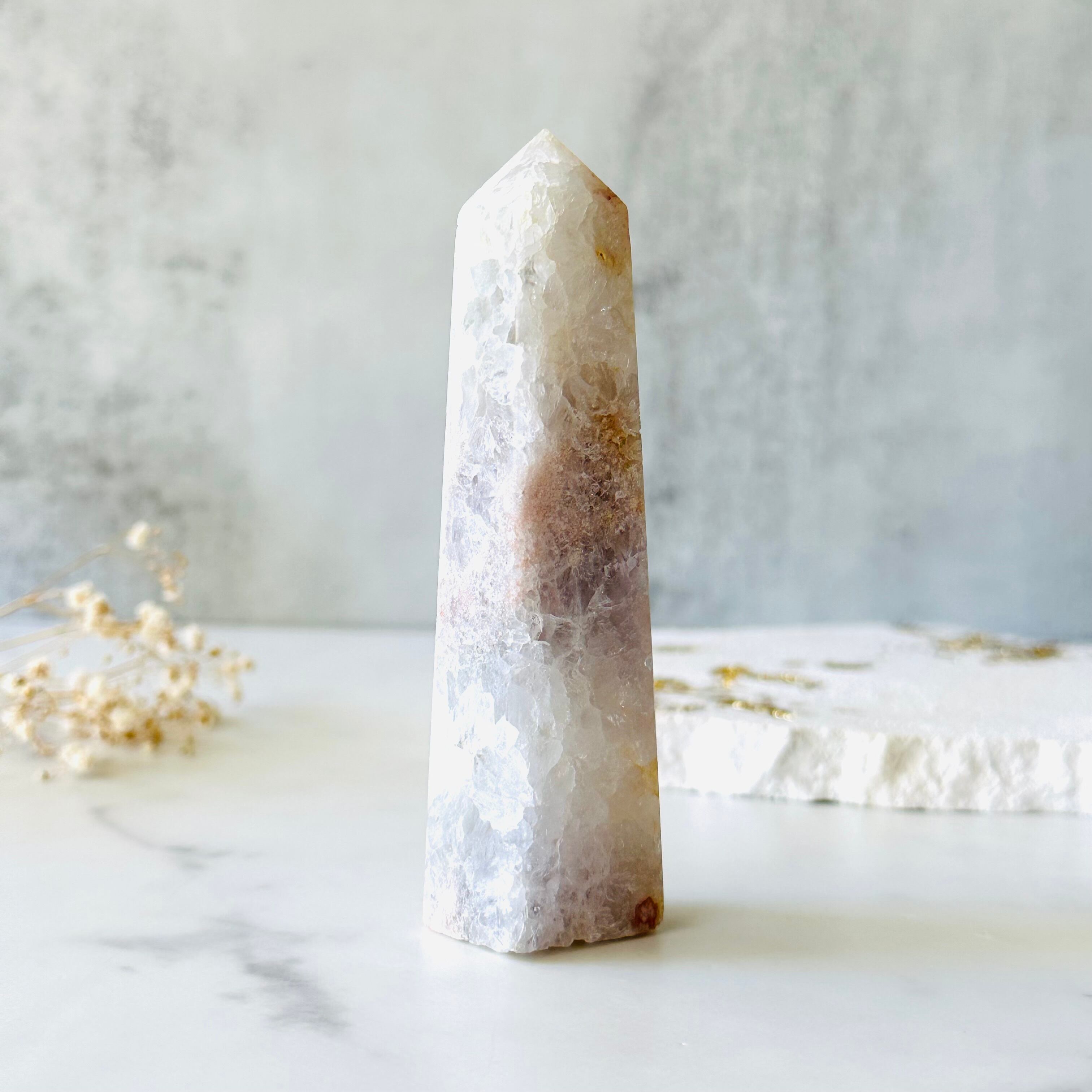 サーモンピンク色のお花たちと、落ち着いたライトグレーのクォーツの模様が綺麗なアイテムです。回すと銀粉のような内包物がキラキラと光ります。ホール付近にはクォーツが小さな虹を宿しています。