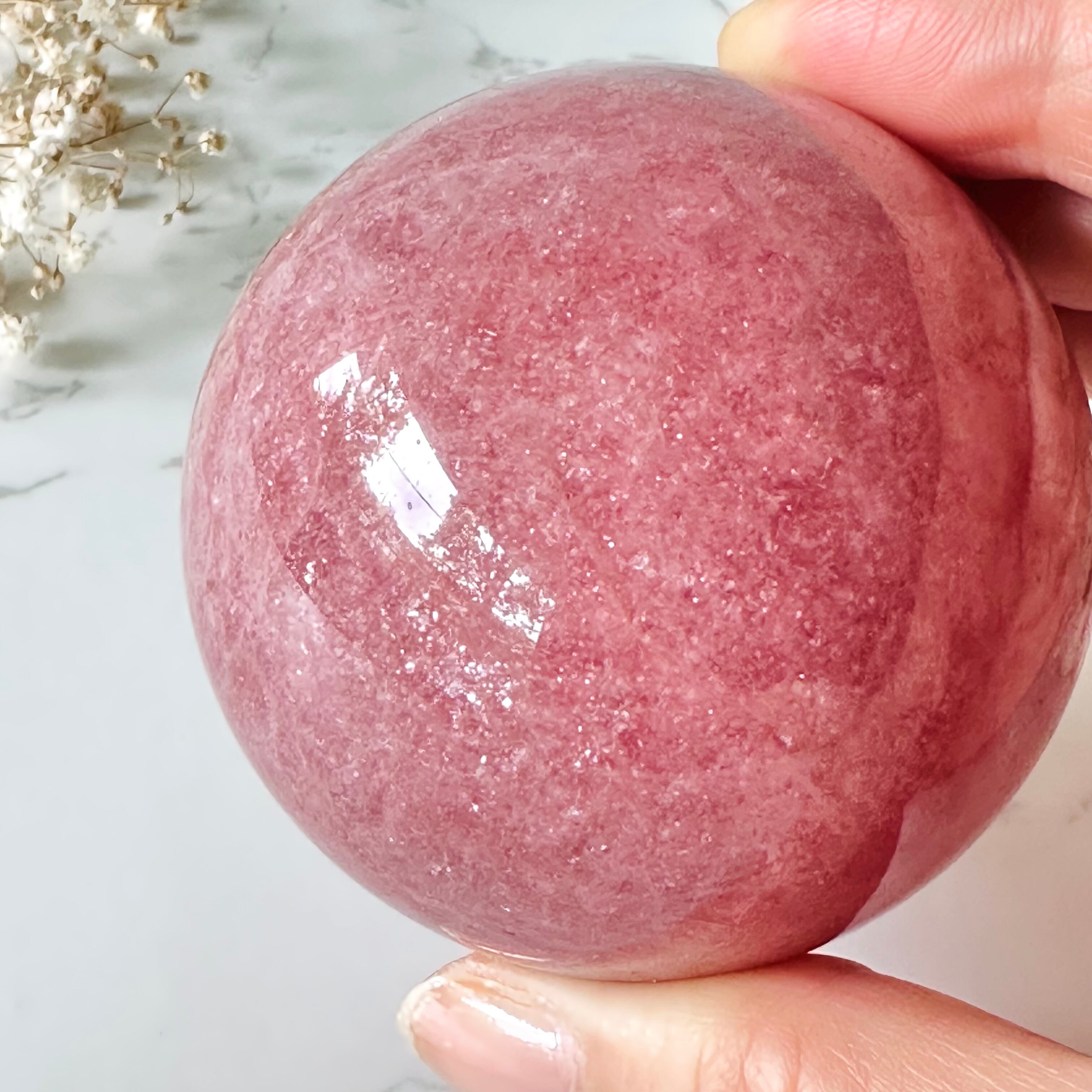綺麗なピンク色の発色とマイカの煌めきが魅力のストロベリークォーツスフィアです。