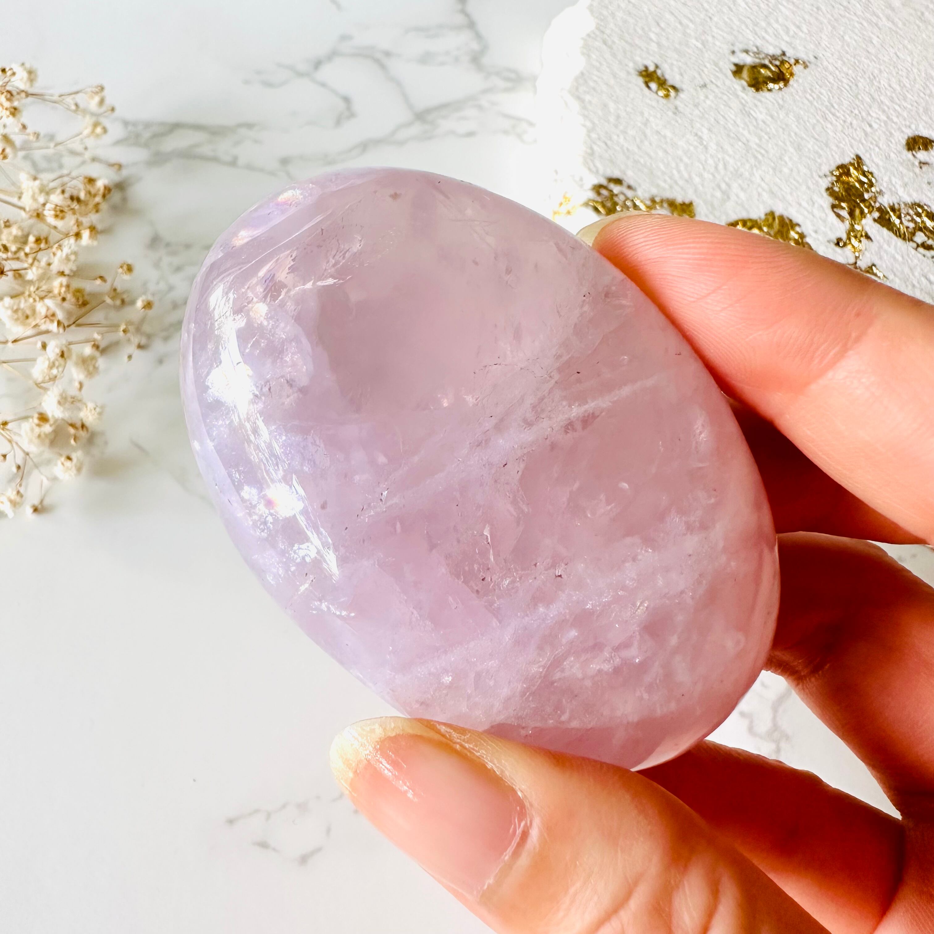 透明感のあるピンクが美しいラベンダーローズクォーツのパームです。