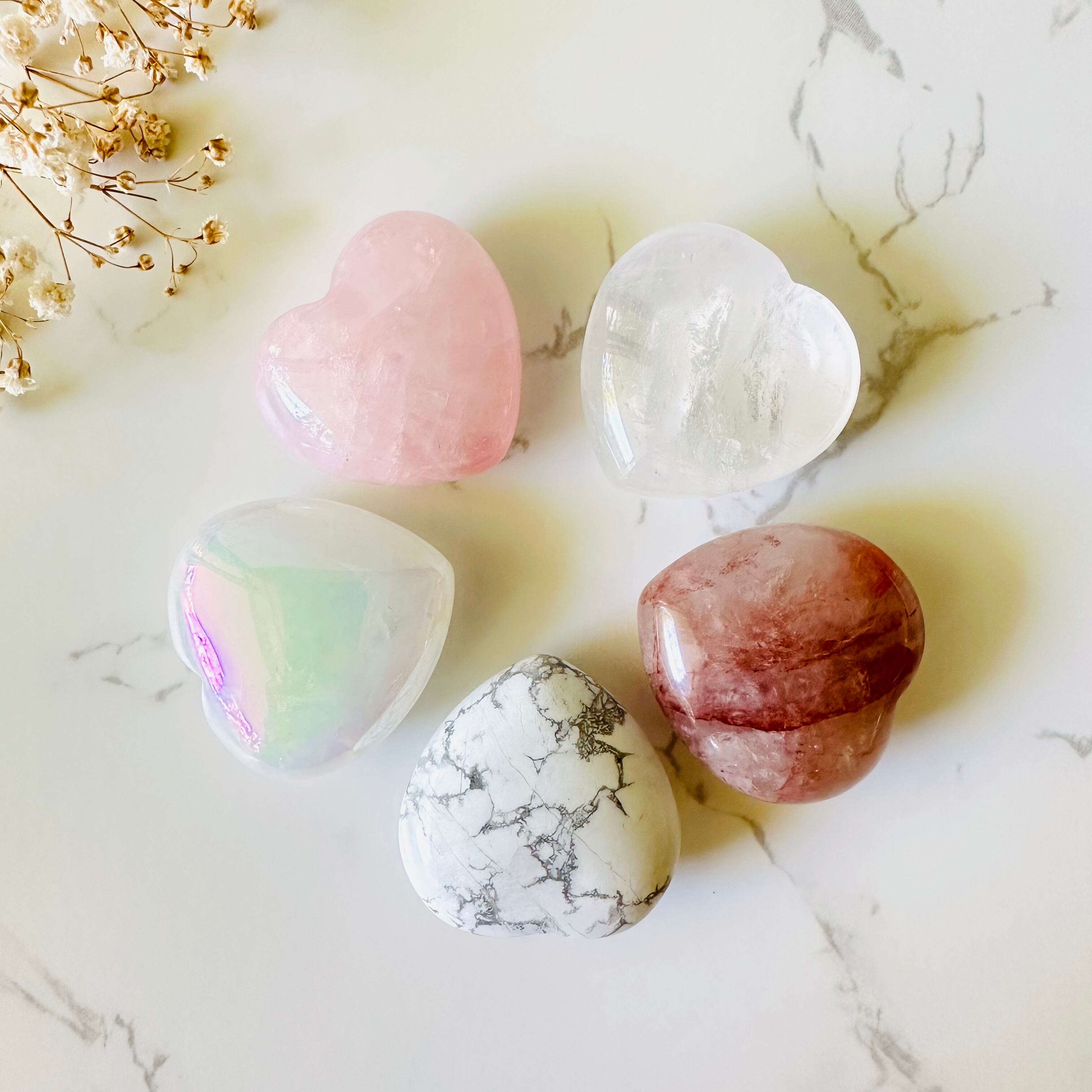 ローズクォーツ、オーラクォーツ、ファイヤークォーツ、クリアクォーツ、ハウライトの5種類で、ひとつひとつはもちろん、並べるとまた可愛さが倍増です。