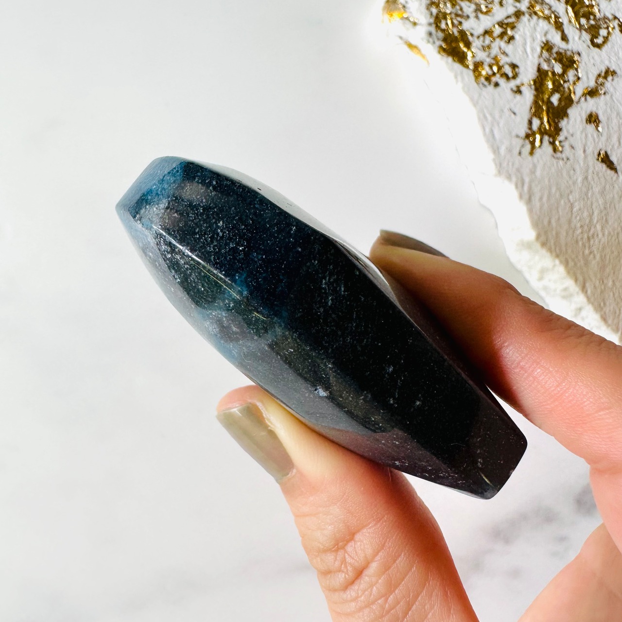 ふんわりとした抽象的な印象のあるトロレアイト。絵本の中の世界のようにメルヘンで可愛らしく、どこか懐かしい気持ちにさせてくれる不思議な雰囲気を持つ石です。こちらは宇宙のような深いブルーの中にキラキラとした微粒子が広がる神秘的なアイテムです。片面に天の川のように白い模様が浮き上がっているのが特徴的です。