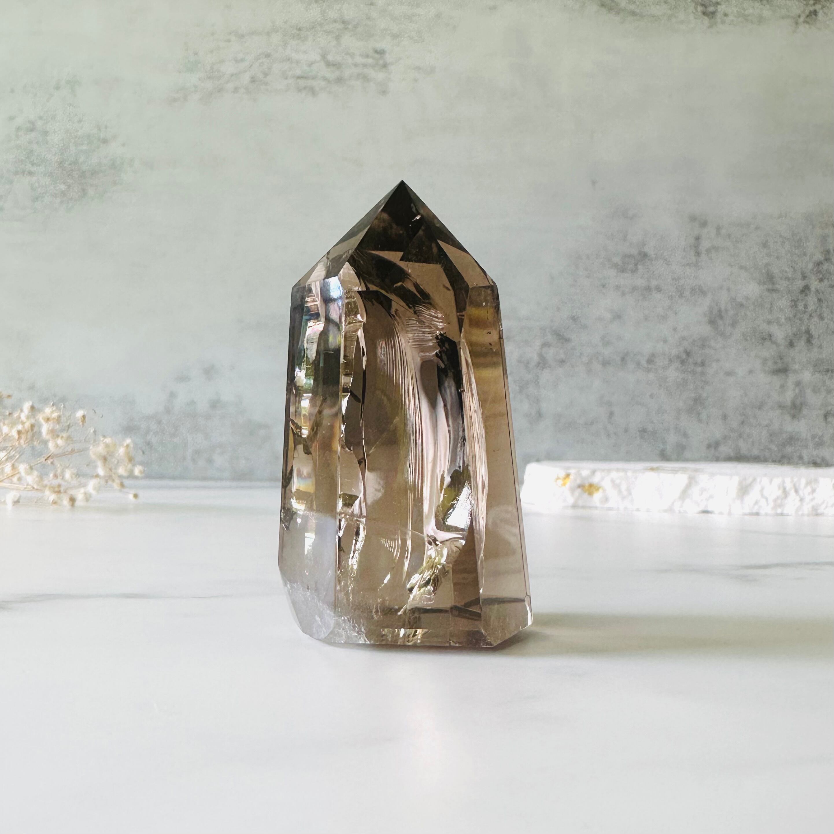 中心には氷の彫刻のようなクラックがトップから足元まで大きく入っていて大きめの虹がギラギラと輝き華やかです。一般的にはアンニュイな印象のスモーキークォーツですが、こちらは大きな虹が次々とで見られるので、ゴージャスな印象です。太さがしっかりあるので安定感も抜群です。