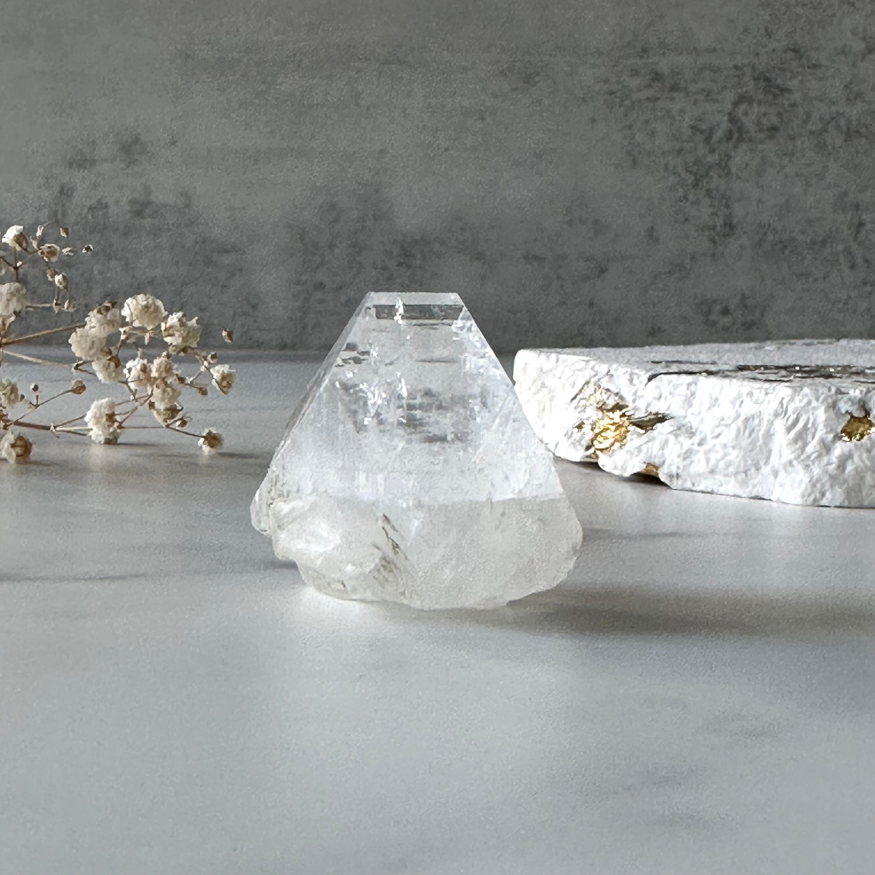 大粒の結晶はピラミッド型で、透明感がありキラキラと美しい光を放ちます。トップには虹を宿します。氷砂糖のような可愛らしさが特徴です。