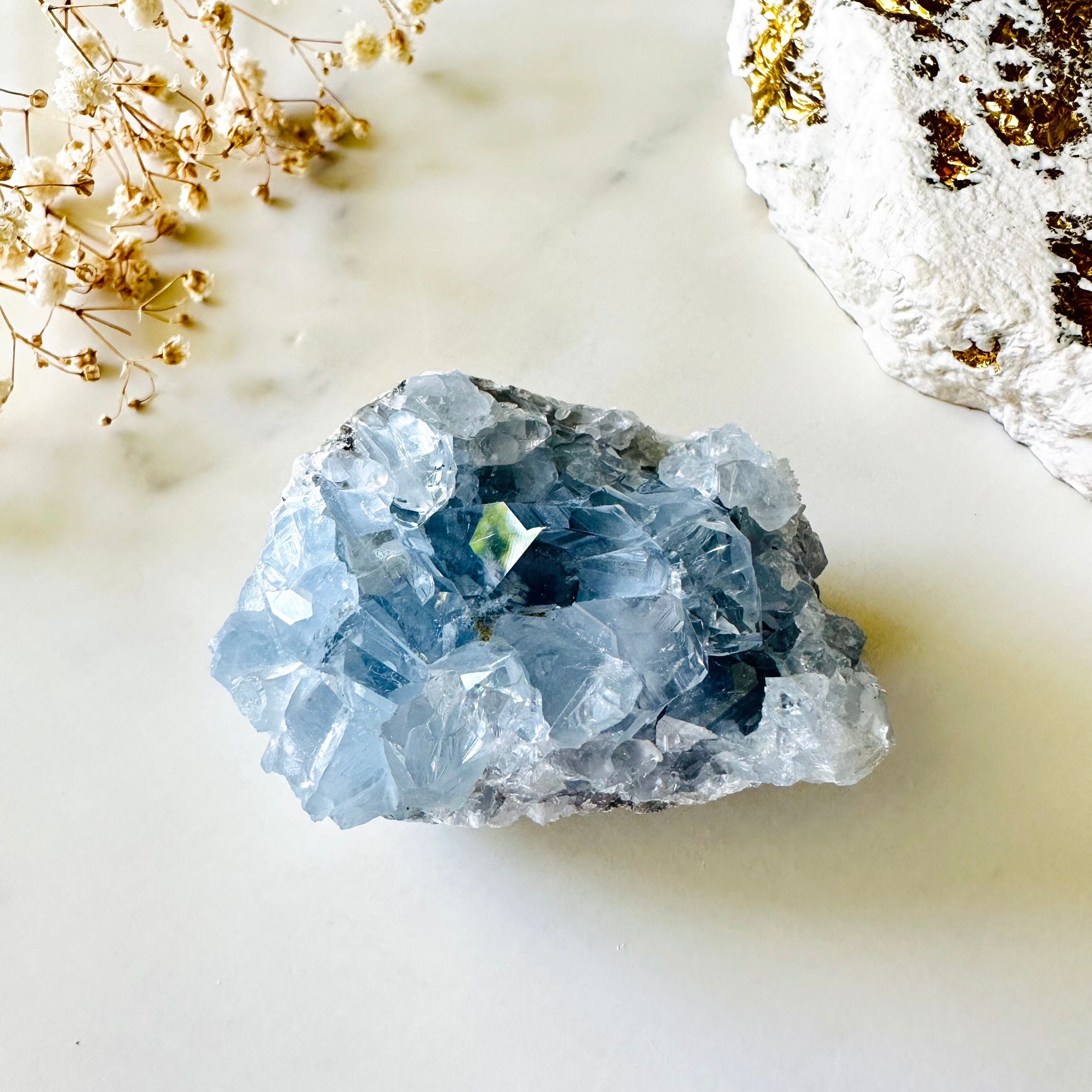 美しい氷の結晶をギュッと詰め込んだようなアイスブルーのセレスタイト。透明度の高い蒼い結晶がとても綺麗で、光を受けてキラキラ輝きます。