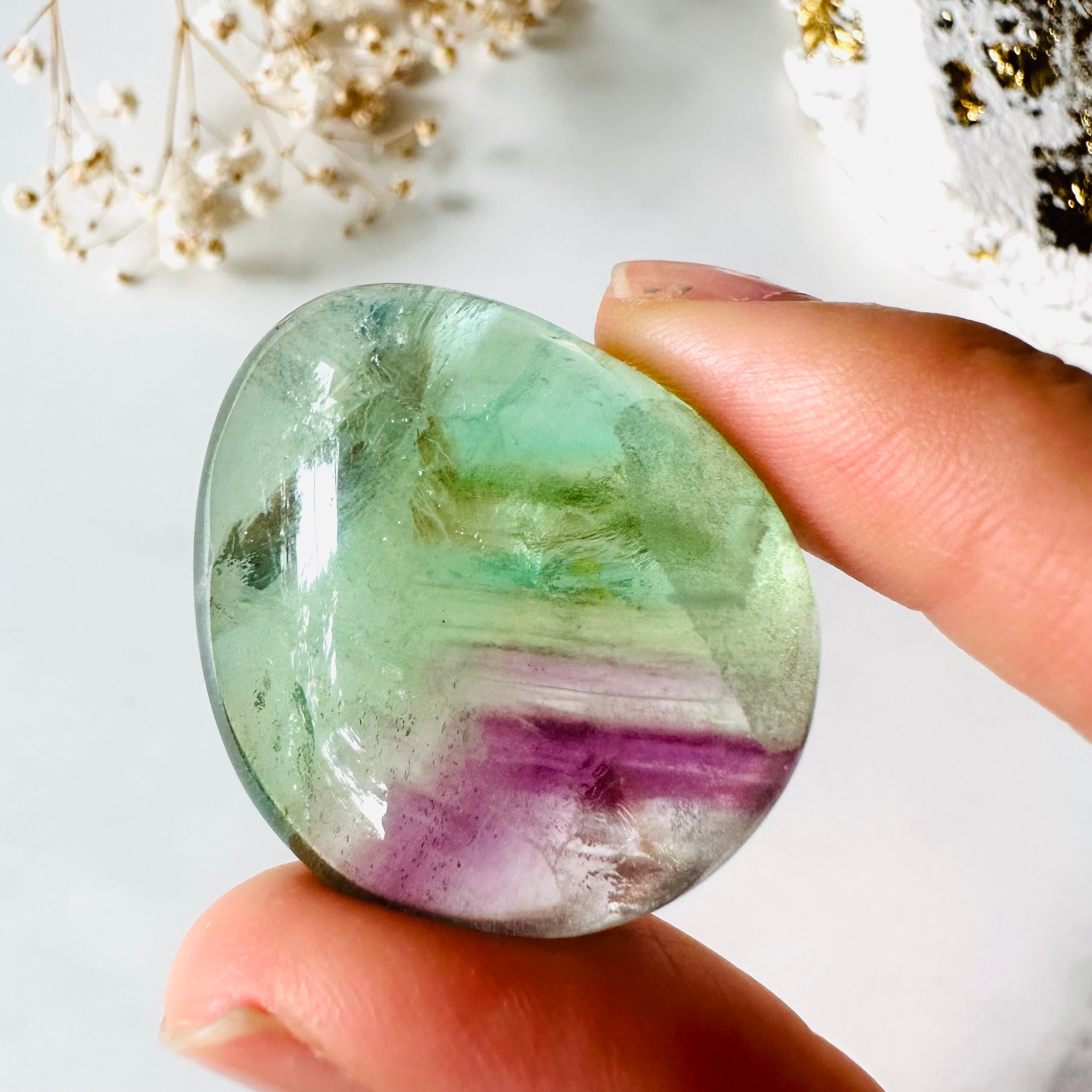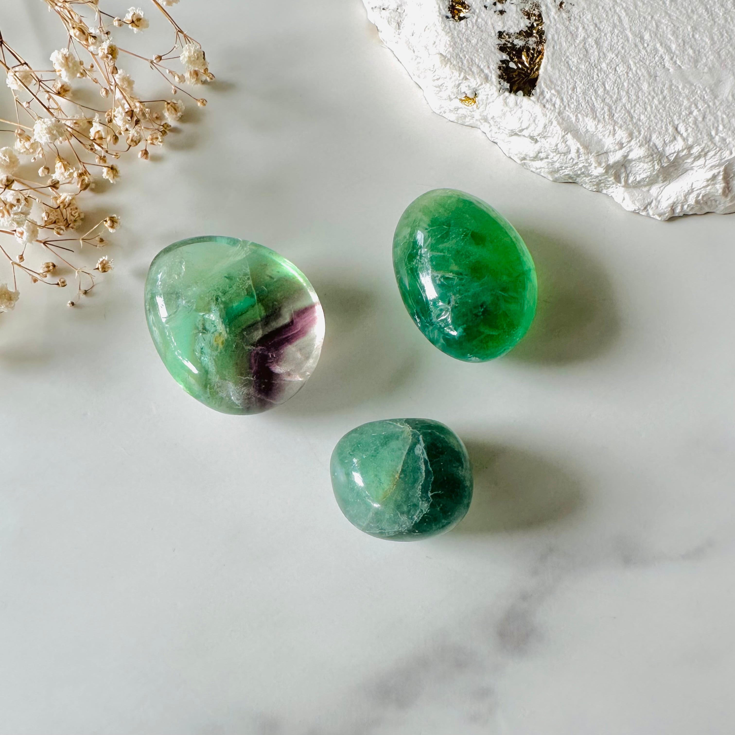 グリーンのフローライトタンブルの3個セットです。一番大きいものは卵のような形でパープルのラインが綺麗に入っています。クラックの輝きもたっぷり楽しめます。中くらいサイズのものはグリーンがしっかりと濃く、透き通っています。一番小さいものは少しスモーキーなグリーンでコロンとした形も可愛らしいです。マイナスの気をリフレッシュしれくれるフローライト。ポーチやポケットにしのばせて持ち歩くのにもいいかもしれません。
