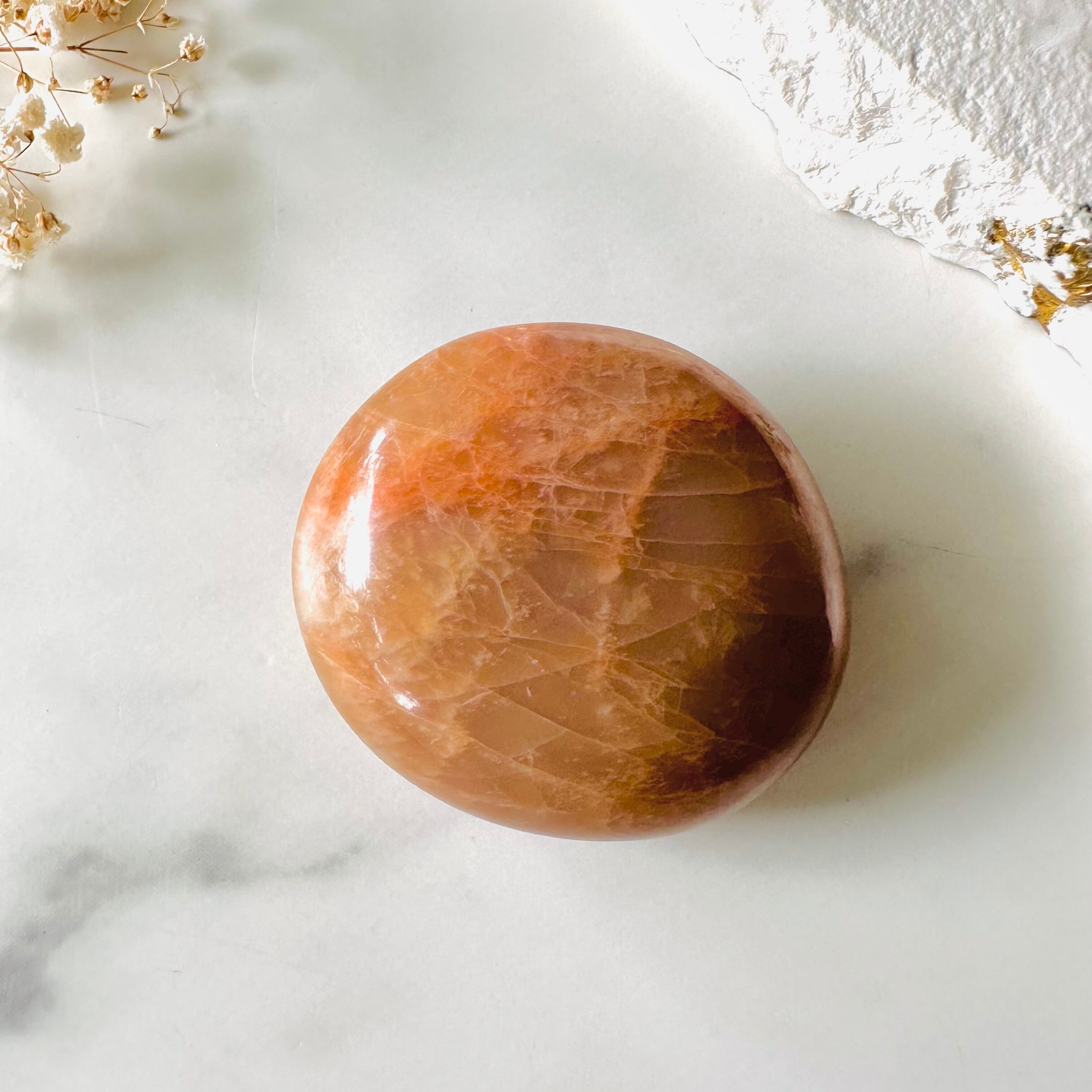 優しい色合いのピーチムーンストーンです。傾けると美しいホワイトフラッシュがたっぷりと入ります。幾重にも重なるオレンジ色の自然の模様もとても綺麗です。