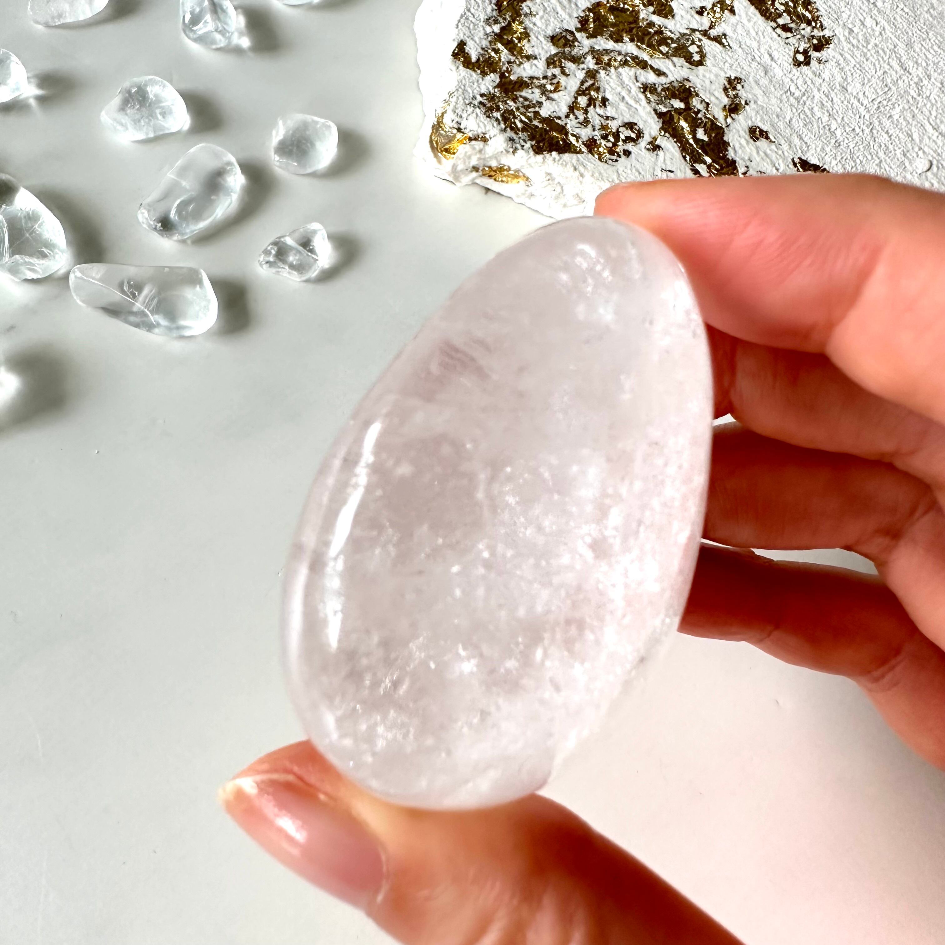太陽の光をたっぷりと含み美しい姿を見せてくれるクリアクォーツのパームストーン。