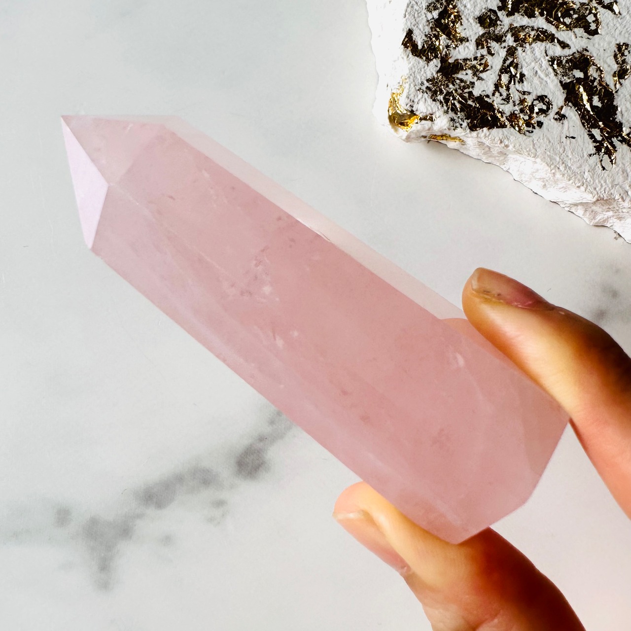 ピンクに白い模様が混じり合うローズクォーツタワーです。斜めシャリシャリとしたクラックが入っていてキラキラと輝きます。