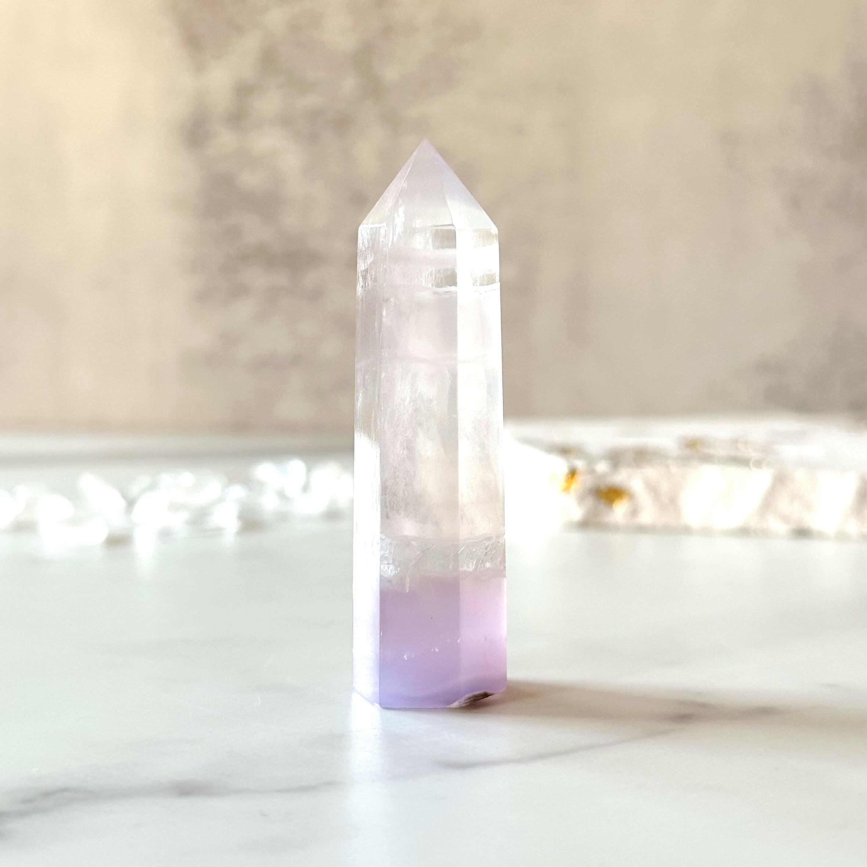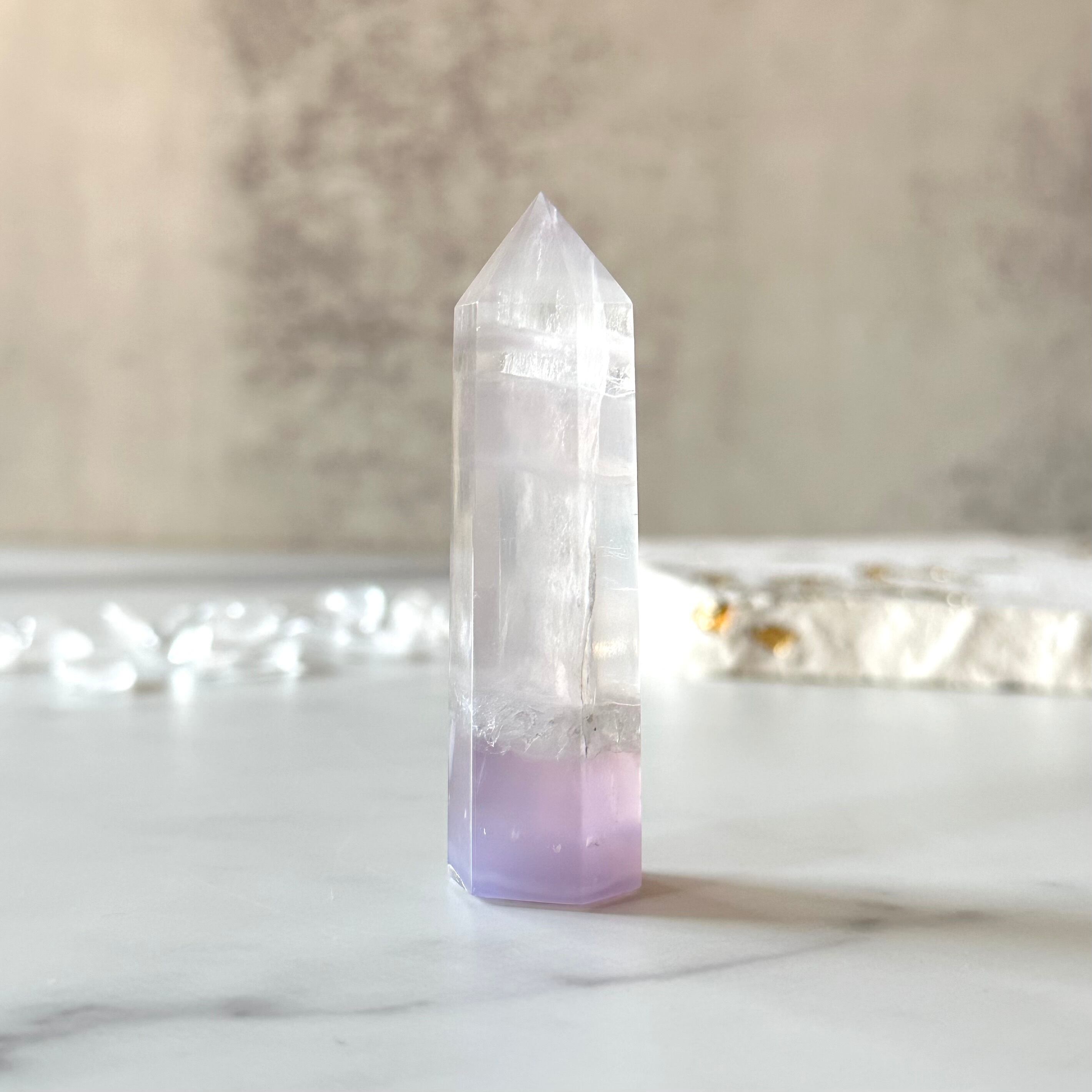 ふんわり優しい印象のイットリウムフローライトタワー。クリアなフローライトに、淡く透明感のあるラベンダーカラーが入り、とても綺麗な色合いです。