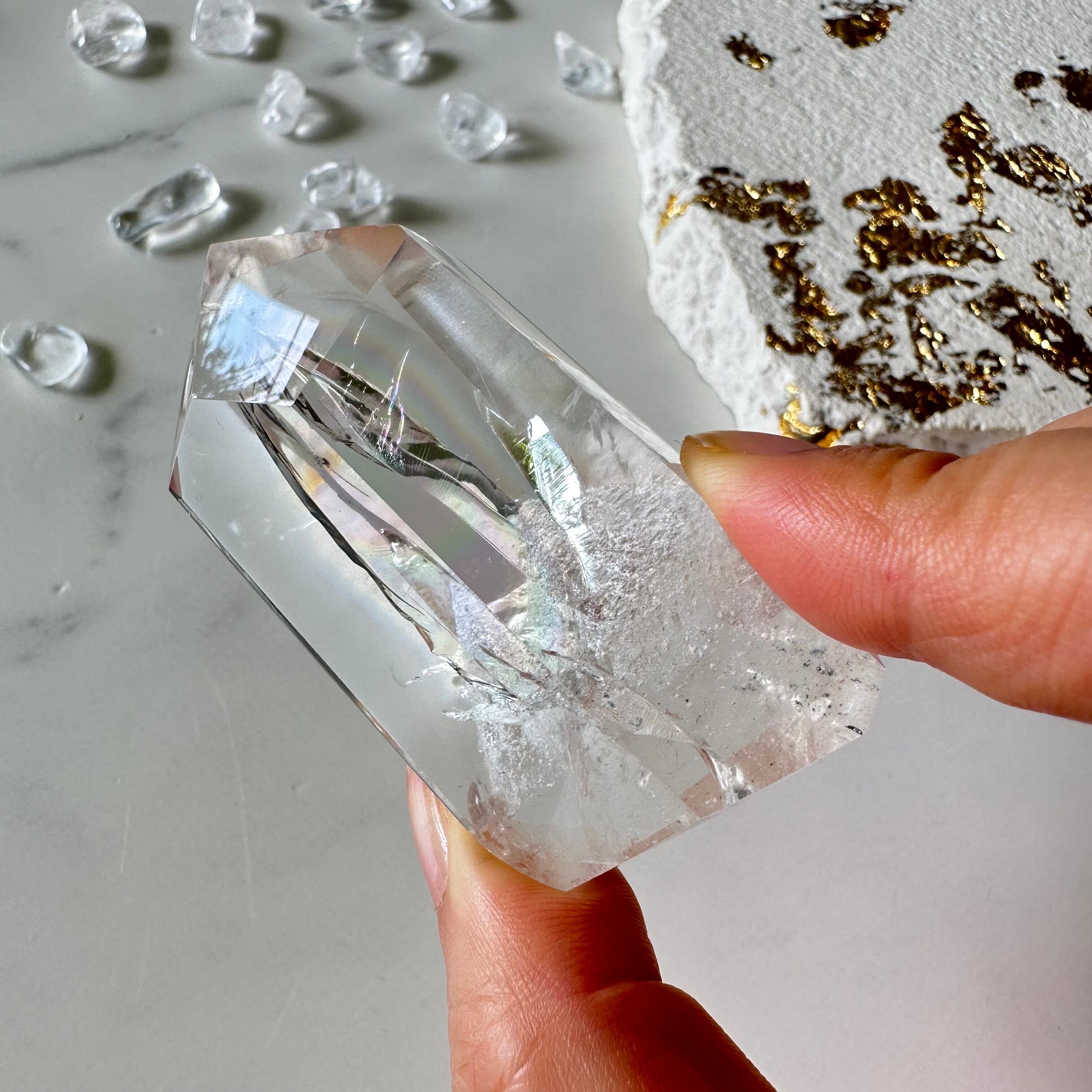 虹をたっぷりと宿すクリアなクォーツの内部には白い山の稜線が見えます。くっきりとした白いラインは大地のエネルギーを宿しながらもどこか儚く繊細で神秘的な雰囲気です。