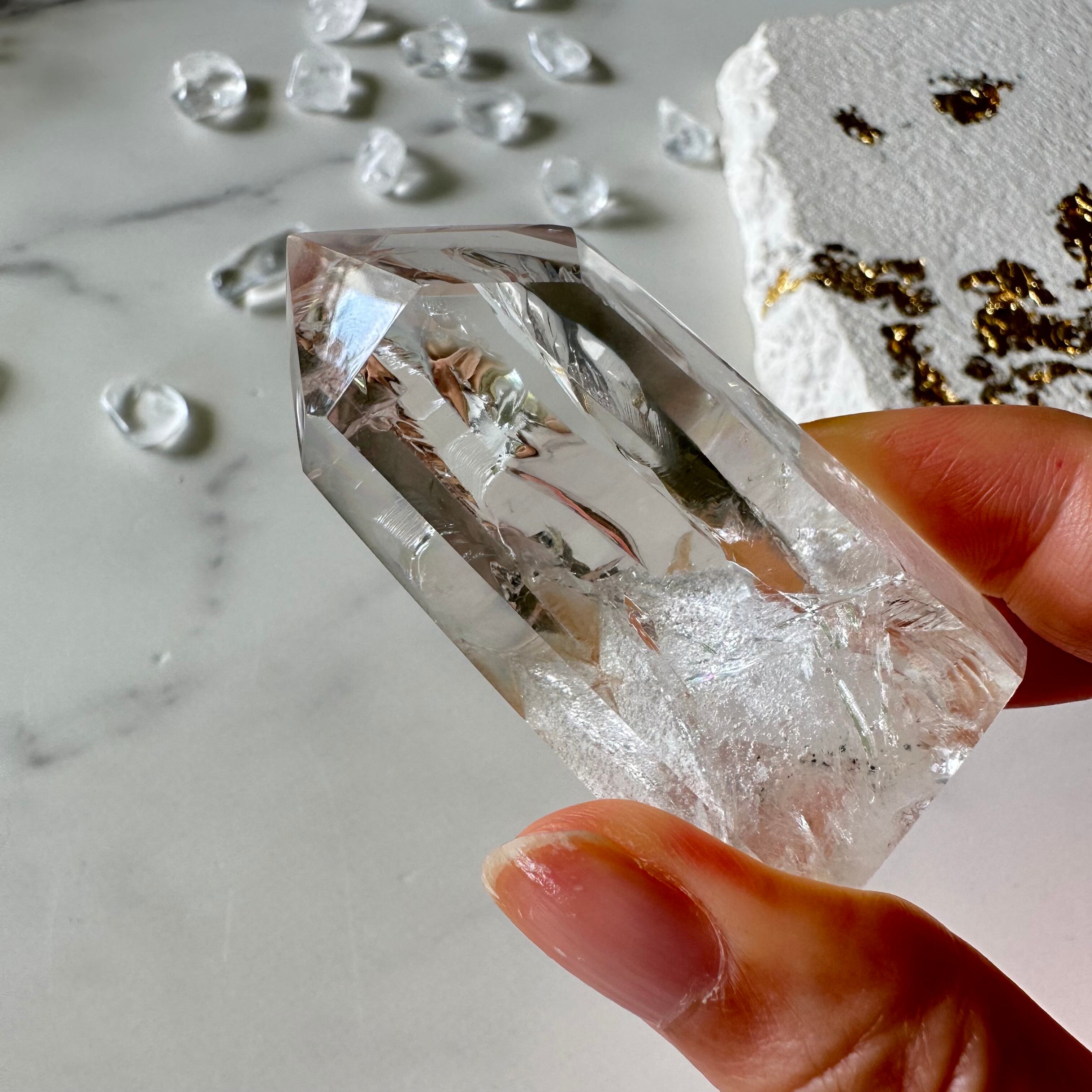透明な水晶の中に、幾重にも重なった幻影のような模様がみられる石です。「幽霊水晶(ゴーストクリスタル)」ともよばれます。成長の歴史を刻んできたことから、「成長」「前進」「向上」の象徴とされ、持ち主の能力や才能を伸ばしてくれる力があるといわれています。過去を乗り越え、停滞していたものを再び活性化させるパワーを持ち、困難の克服や信頼の回復・愛の復活などにも効果があるとされ、強いエネルギーを持つ石です。