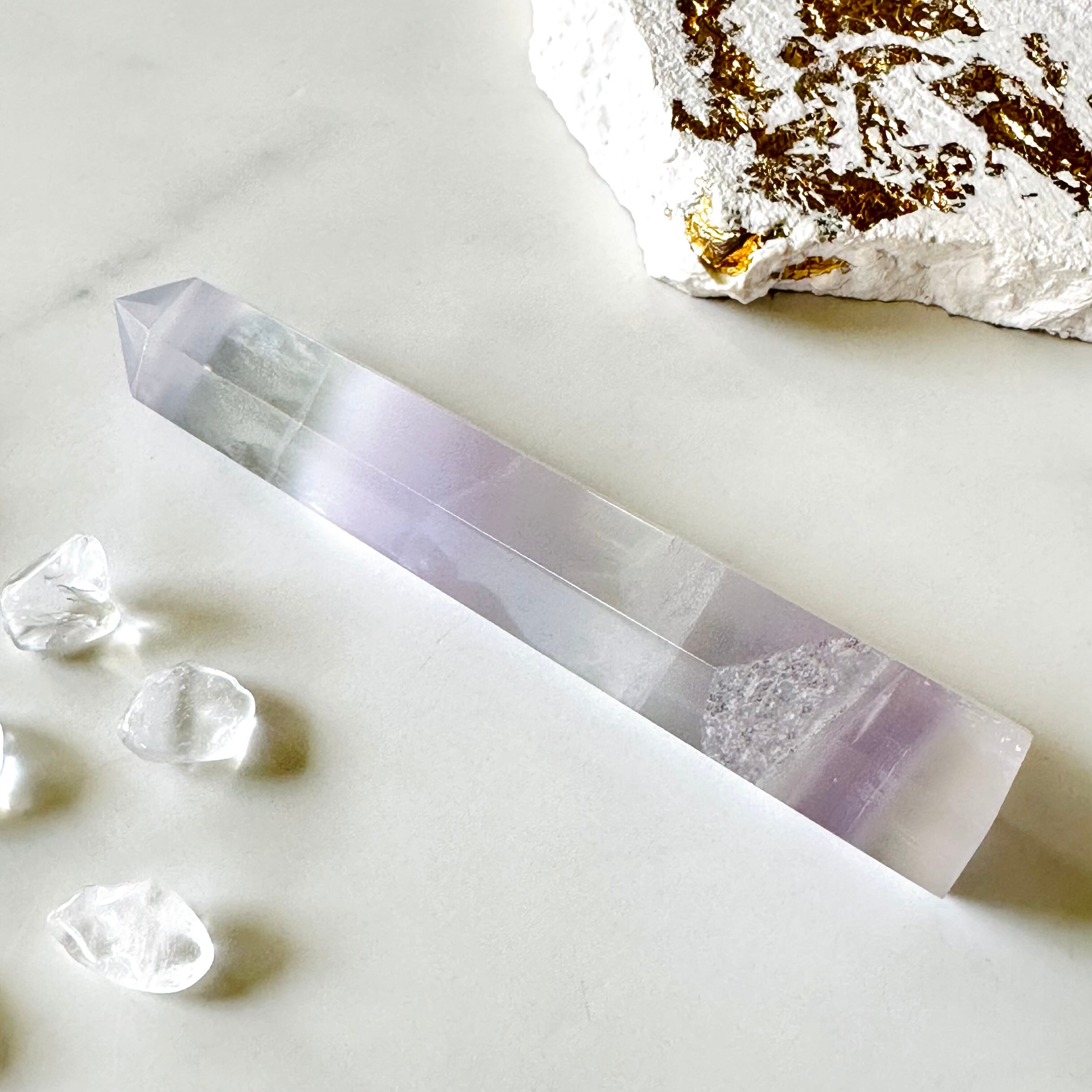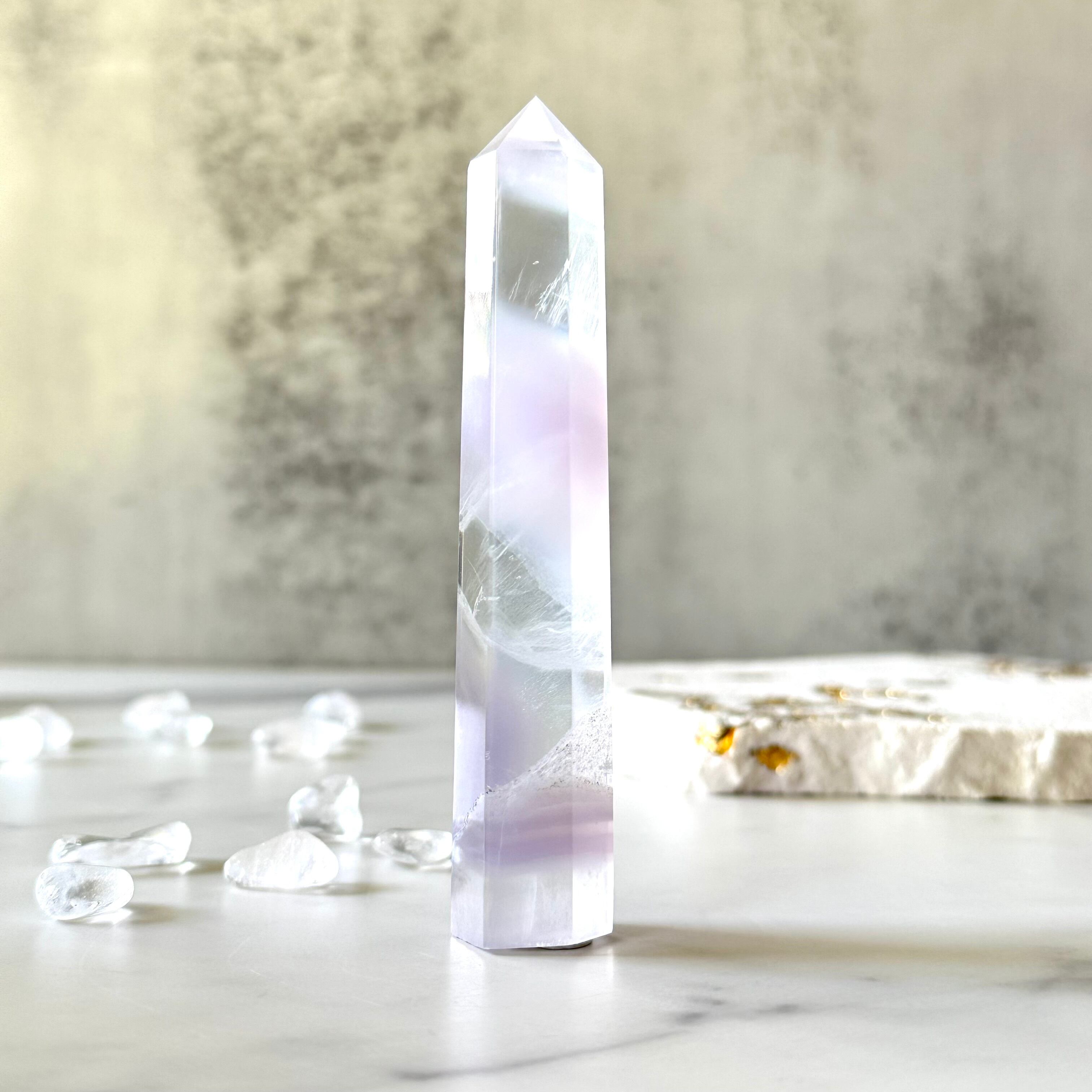 ふんわり優しい印象のイットリウムフローライトタワー。透明感のあるフローライトが美しいパープルのベールを纏っているようで幻想的な雰囲気です。
