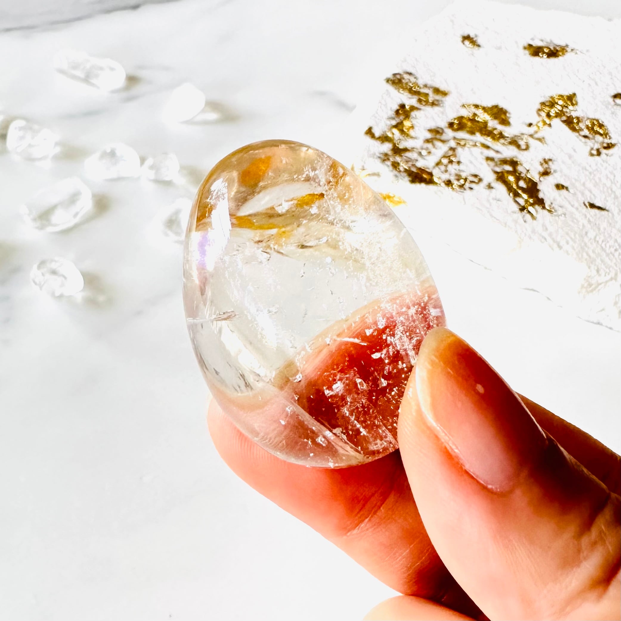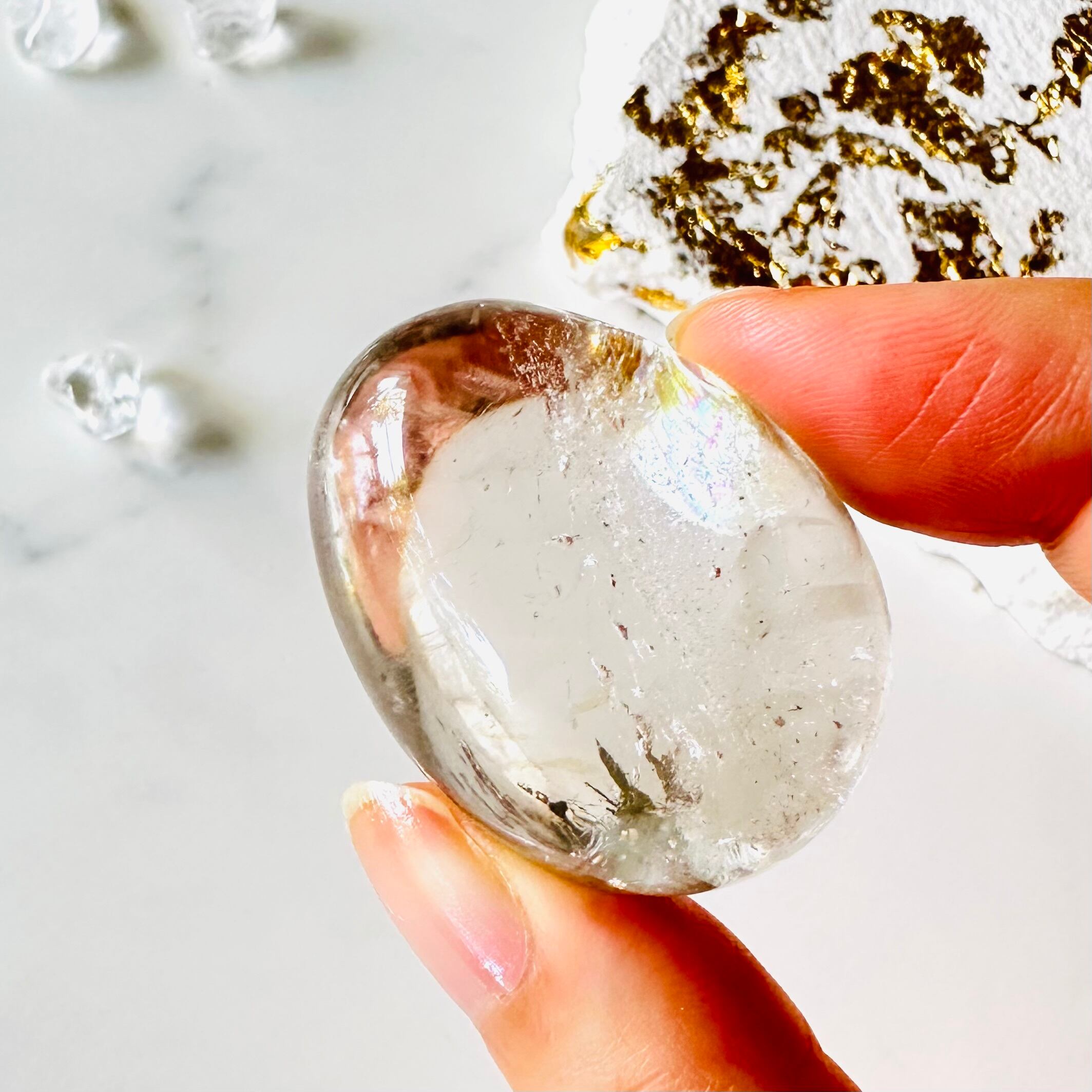 非常にクリアで質の高い水晶に、わずかに黄色いゴールデンヒーラーが閉じ込められており、美しい虹と相まって高貴な輝きを放っています。