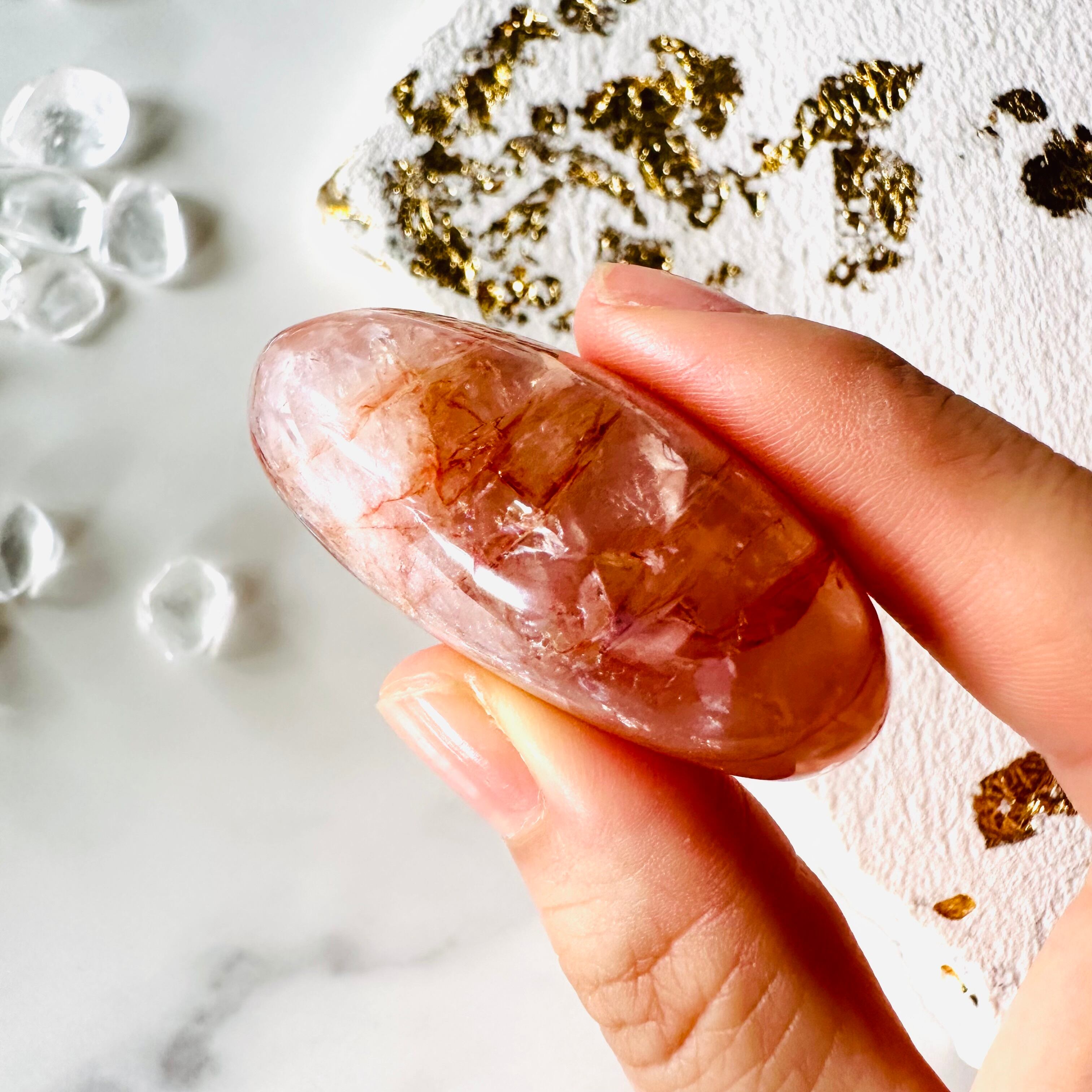 レピドクロサイトを内包した水晶で、別名「レピドクロサイト イン クォーツ」と言います。 スーパーセブンやストロベリークォーツと同じくクリスタルヒーラーに人気があるパワーストーンで、全体的に赤みを帯びていることから「情熱」「力強さ」を表し、持ち主に自信と決断力を与えると言われています。