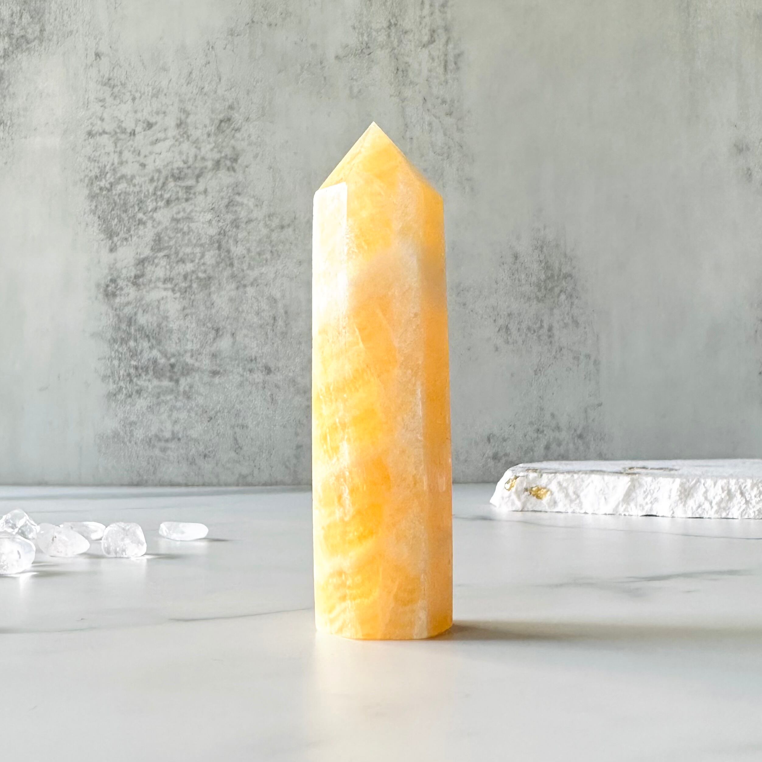 ミルキーなオレンジカラーのカルサイトタワーです。オレンジシャーベットのような軽やかで明るい色合いの石肌の内側にはシャリシャリとした氷の柱が細かく入っているようです。光にあててみると氷の柱がキラキラと煌めきとても綺麗です。