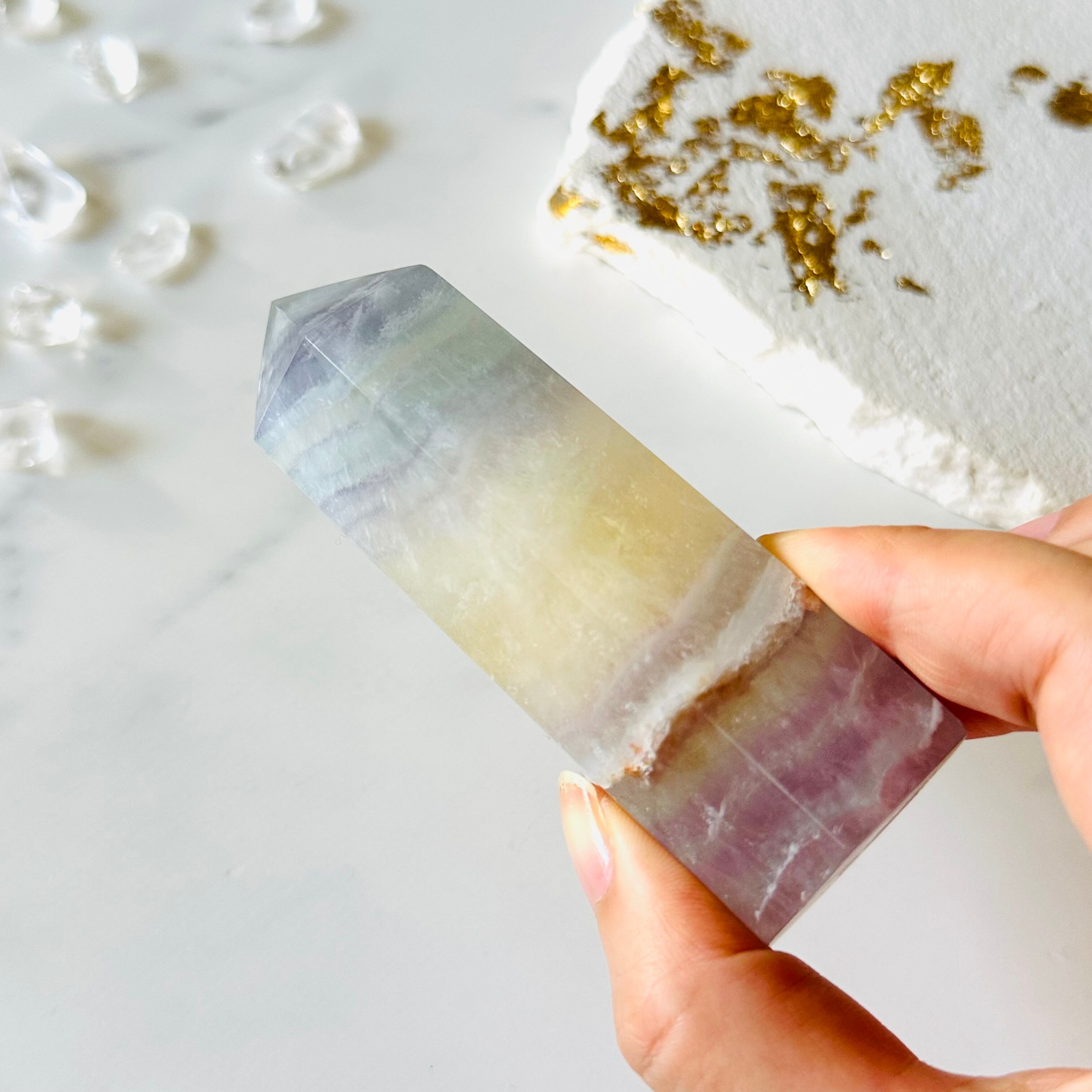 ブルー、イエロー、パープルの縞模様がとても綺麗で、パステルカラーのグラデーションがふんわり優しい印象です。十分な大きさがありますが、ソフトな色合いと透明感あるフローライトの質感で重さを感じさせないアイテムです。