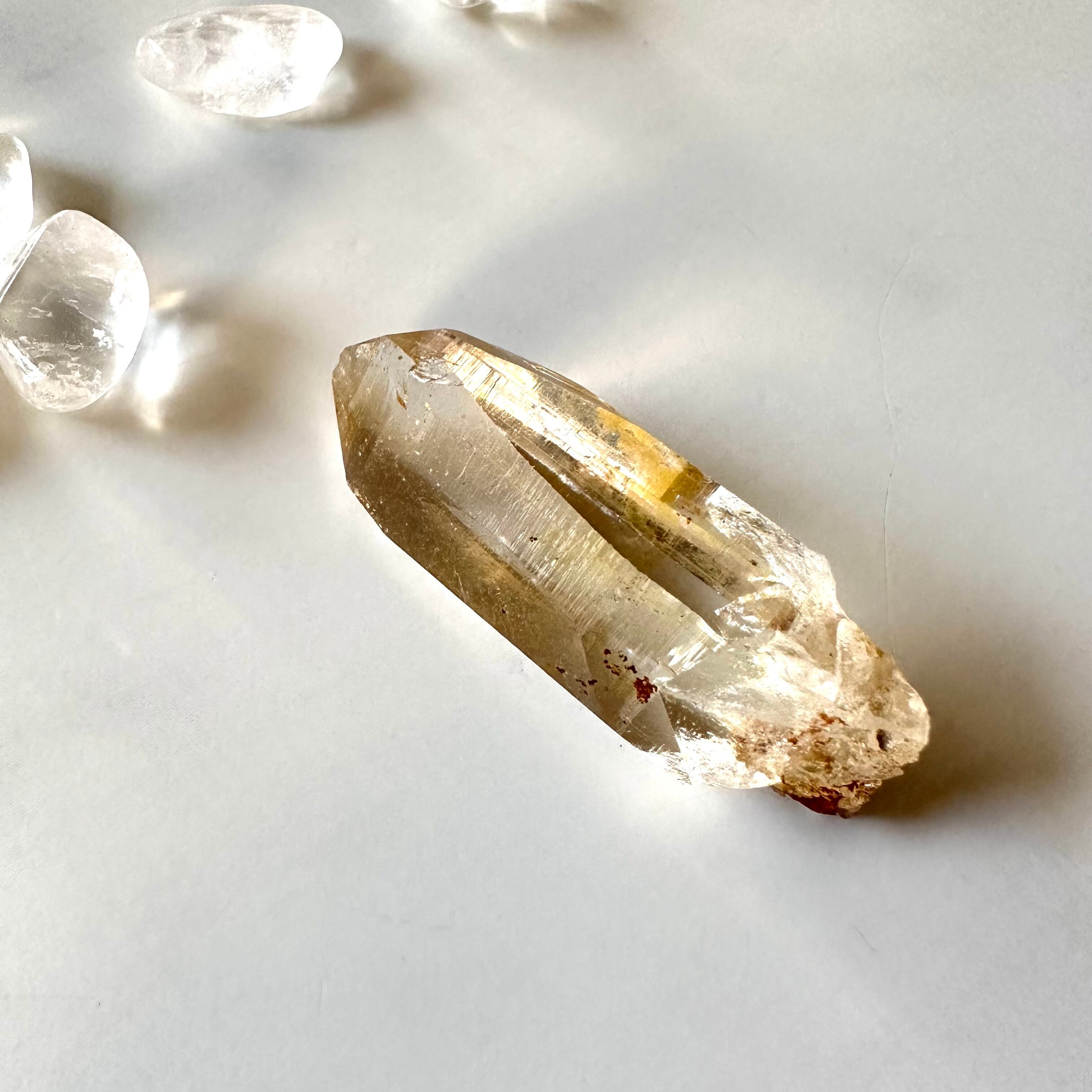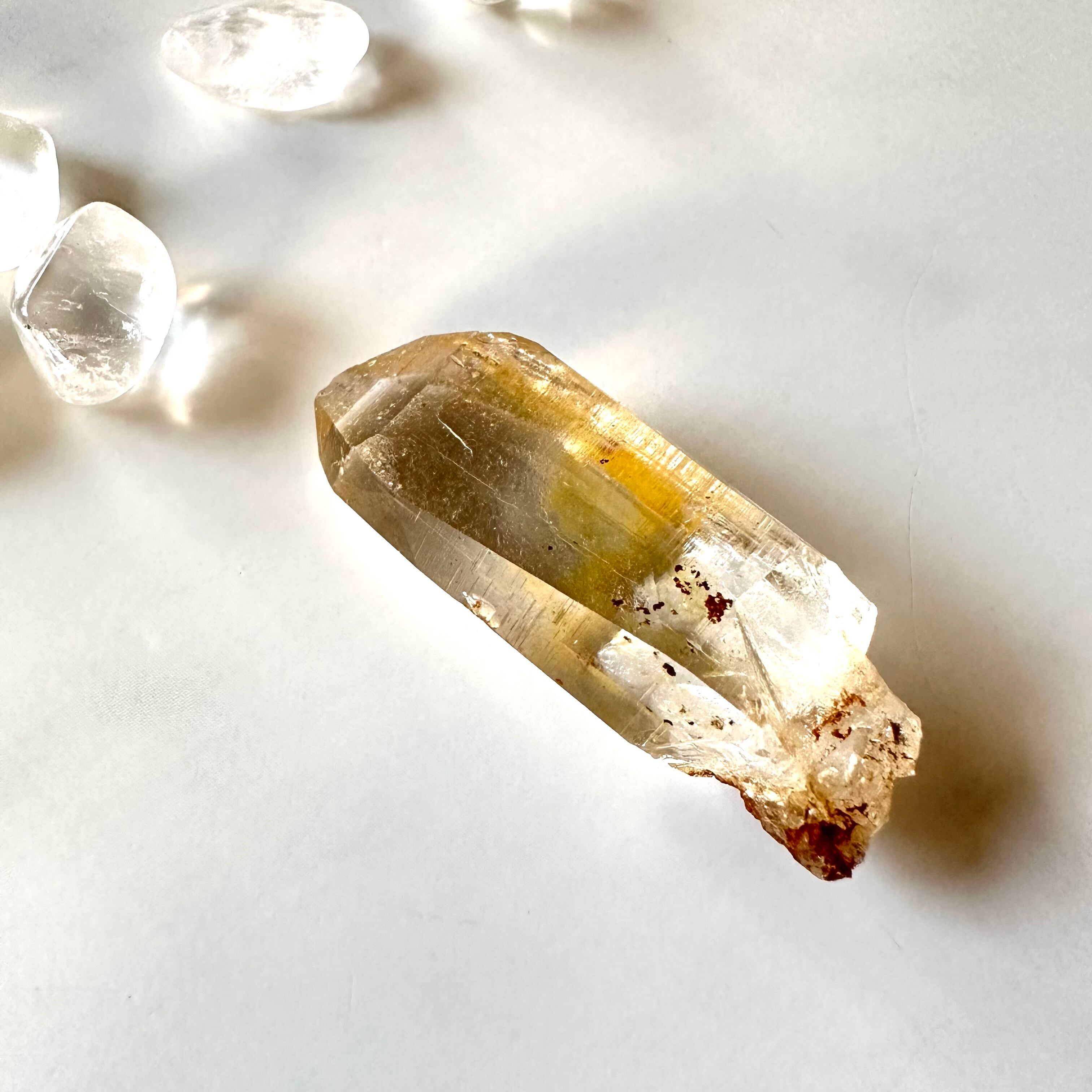 世界の屋根ヒマラヤの中でも標高7000mを超える山々、ガネーシュヒマールには学問の神様でもあり、商売繁盛の神様でもあるガネーシャが住む聖地と言われています。なかでもシェルトゥンを産地にもつ水晶は、細かいミスト状の内包物や艶テリの良い輝き、美しい色合いで一際に存在感を放ちます。この美しいゴールデンカラーはアイロンオキサイド(酸化鉄)による自然由来のものです。