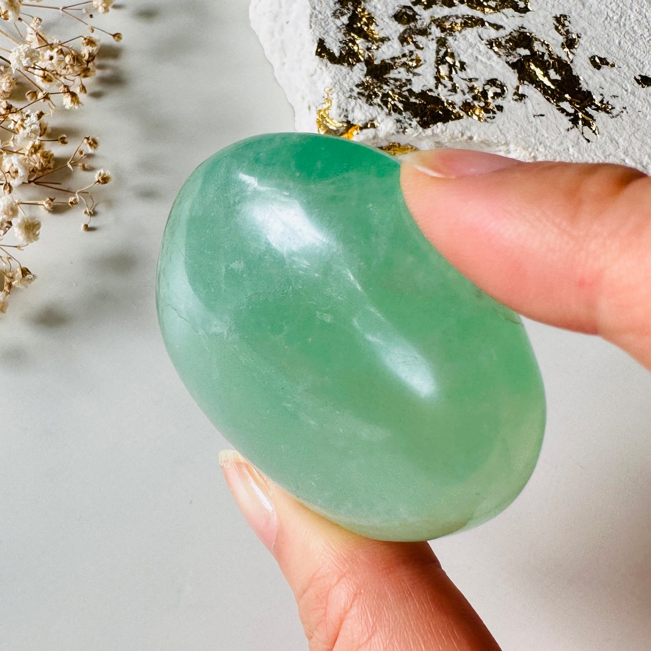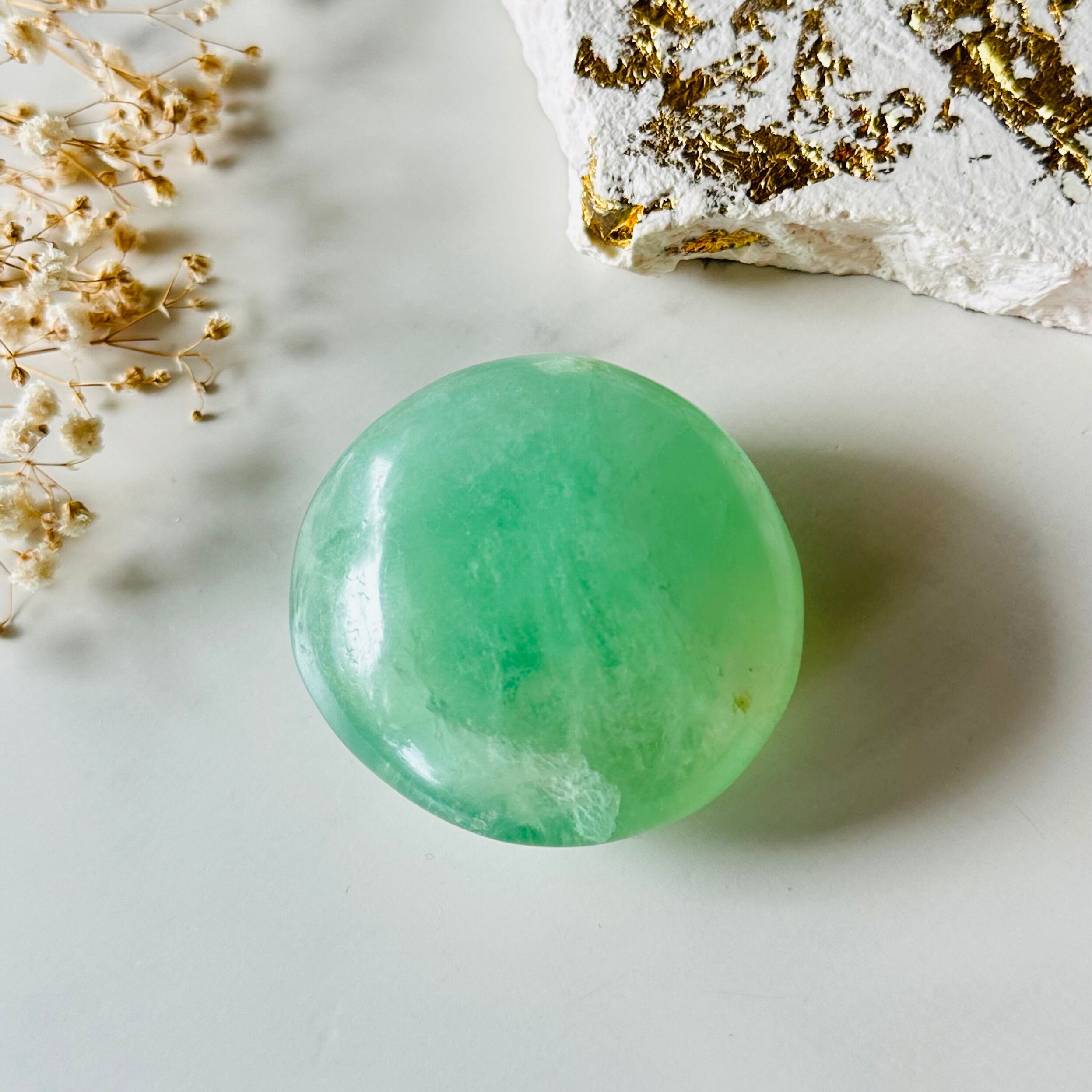 明るく優しい色合いが綺麗なグリーンフローライトのパームストーンです。透き通ったグリーンの中には秋の高まる空にうっすらと白い雲を吹き流したような模様が見えて、フローライトの美しい質感を楽むことができます。手のひらにちょうどよく馴染む程よい大きさのパームストーンです。