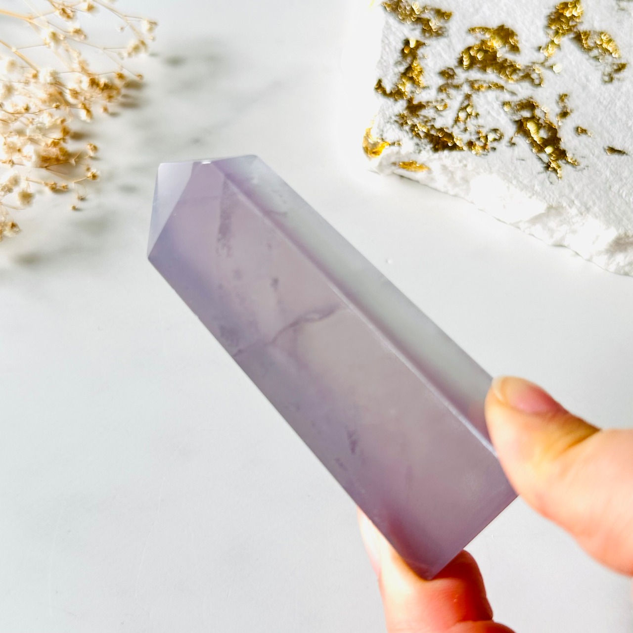 ふんわり優しい印象のイットリウムフローライトタワー。ラベンダーカラと水色が層になって混じっています。四角柱のため正面の表面積が広く、横から見るとラベンダーと水色の二層の分れ目をくっきりと見ることができます。