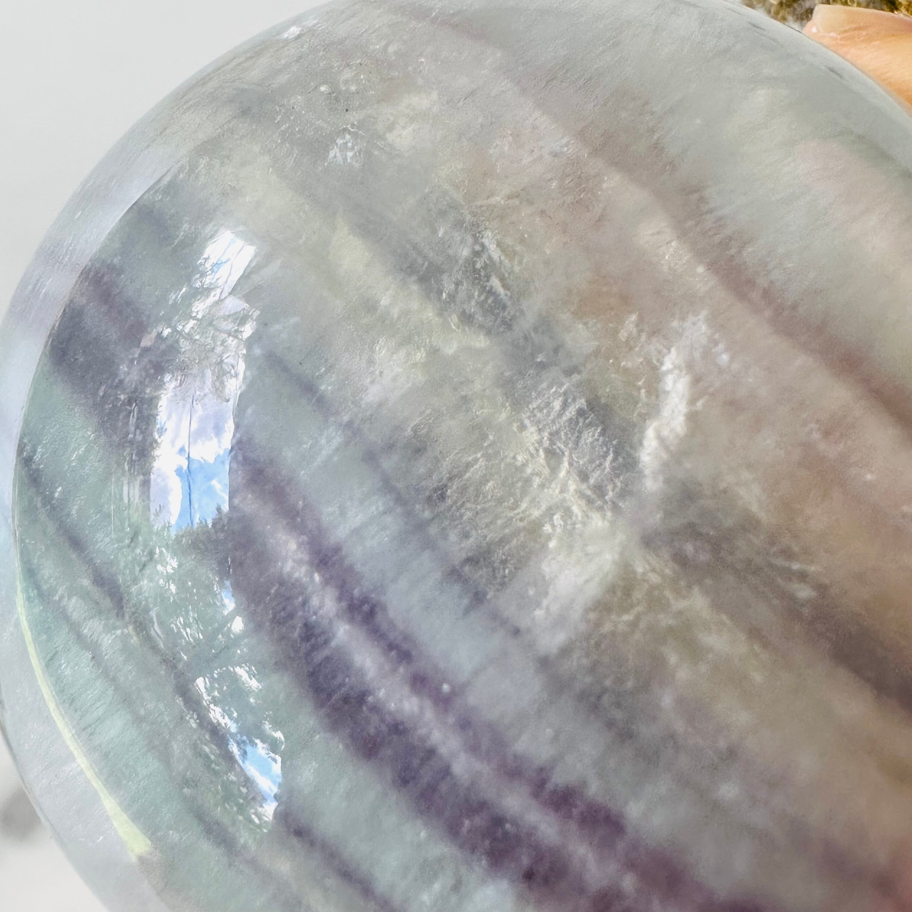 優しい明るい水色にパープルが地層のように重なる幻想的で美しいスフィアです。中央部分には年輪のような美しい模様が見られます。シャリシャリとした氷のような内包物もとても美しく、角度を変えて見ていると優しい時間が流れていきます。