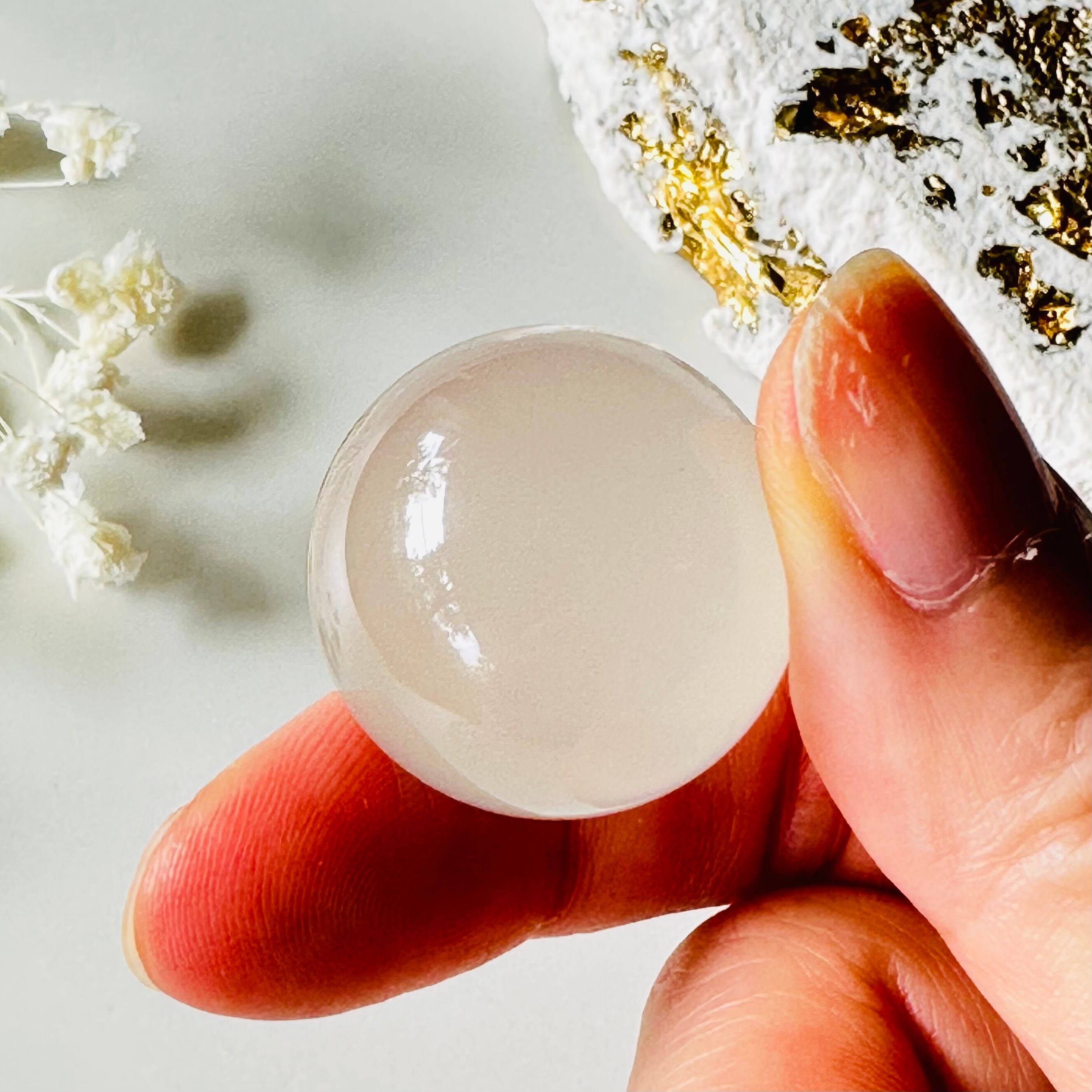 優しい透明感のある色合いは、クォーツの内部にある微細な気泡によるものです。月光のような控えめな輝きと、透けて見えるクォーツの質感が魅力です。日々の暮らしにそっと優しい癒しをもたらしてくれるアイテムです。