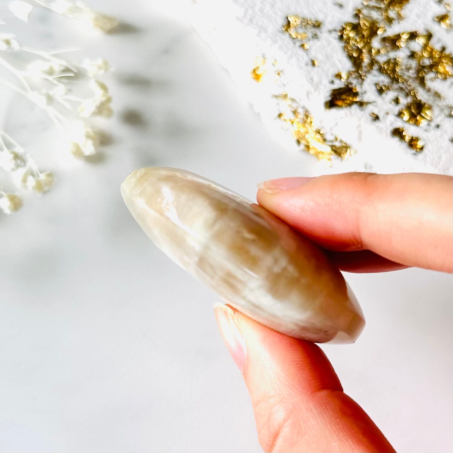 石の表面に、月の光を思わせる神秘的な光(シラー)が浮かぶことから、ムーンストーンと呼ばれます。月は女性性を司り、女性がムーンストーンを持つとより柔らかく女性らしい魅力が花開き、美しさが増すといわれています。