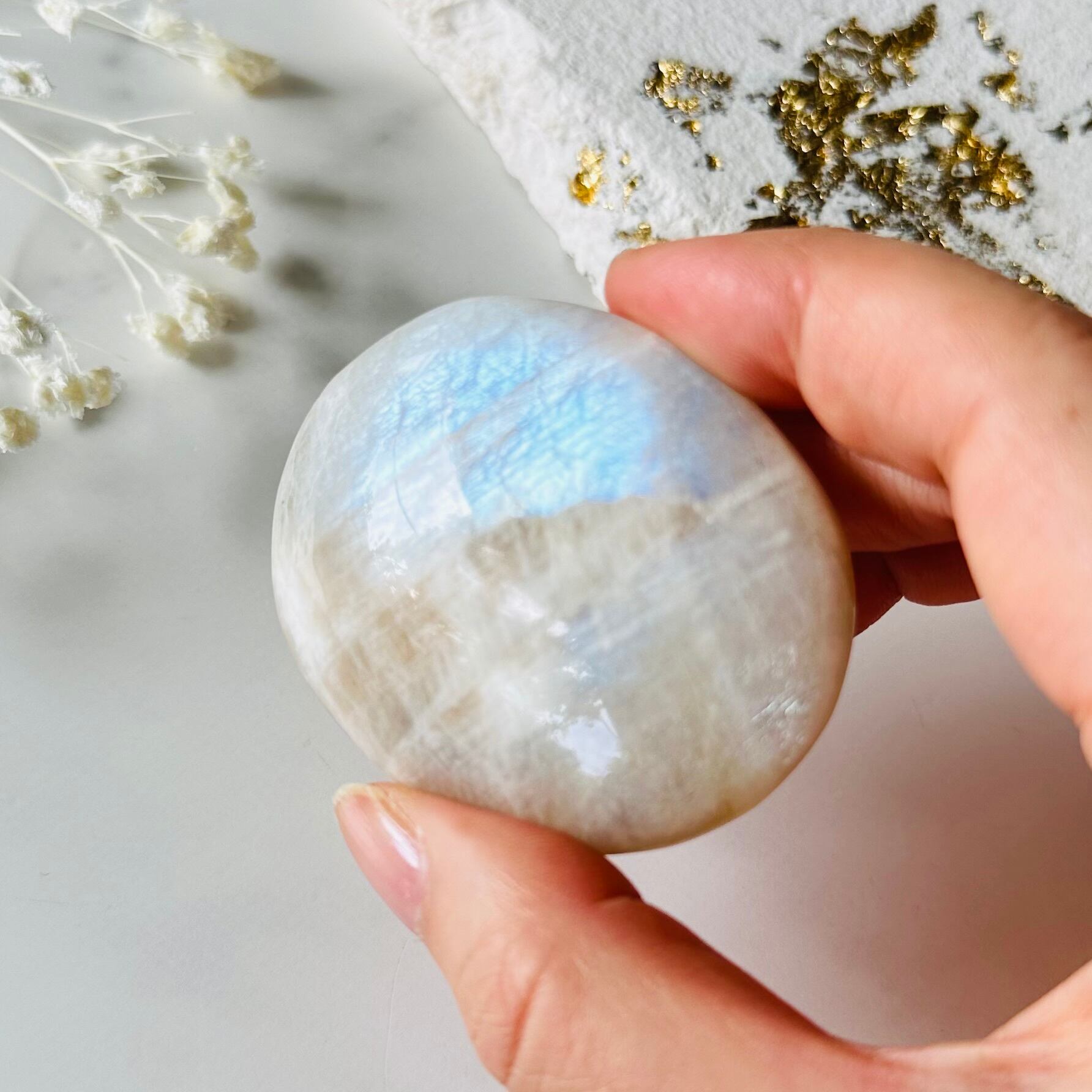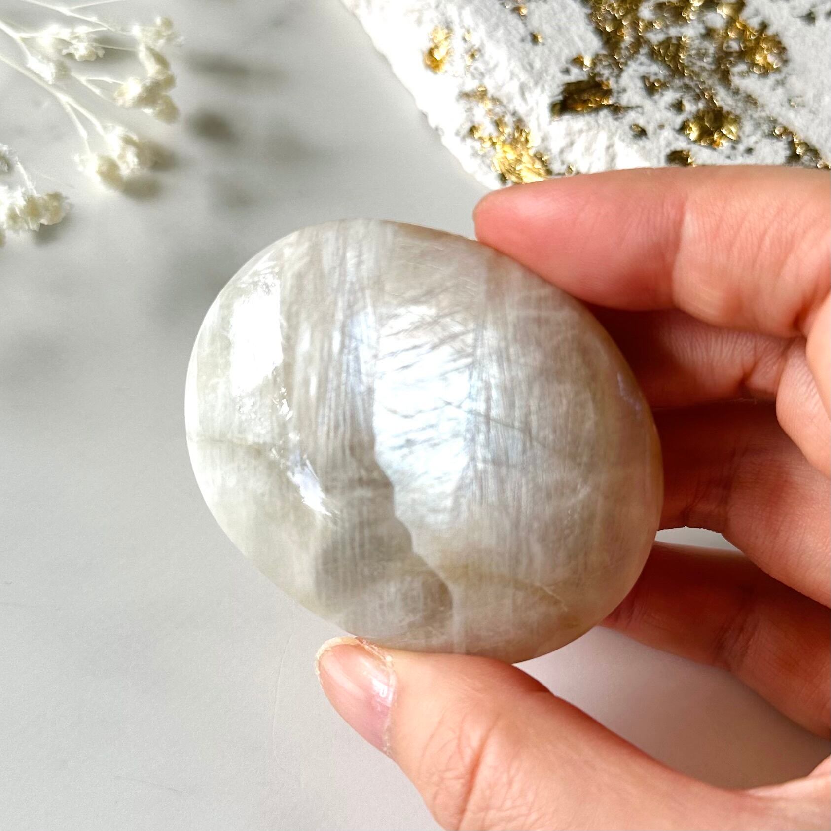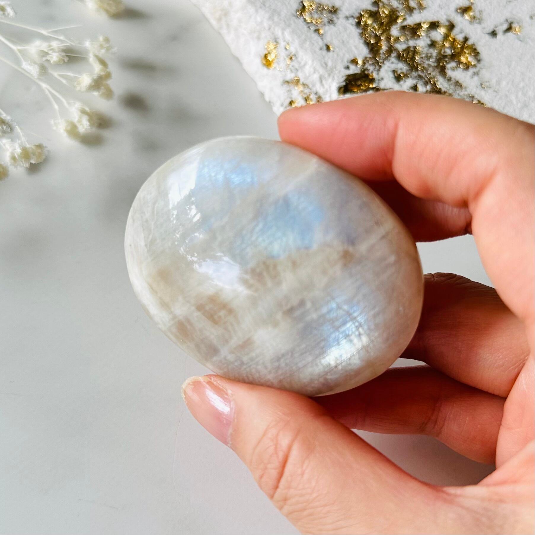 上品な青いシラーが美しい幻想的なムーンストーンのパームです。