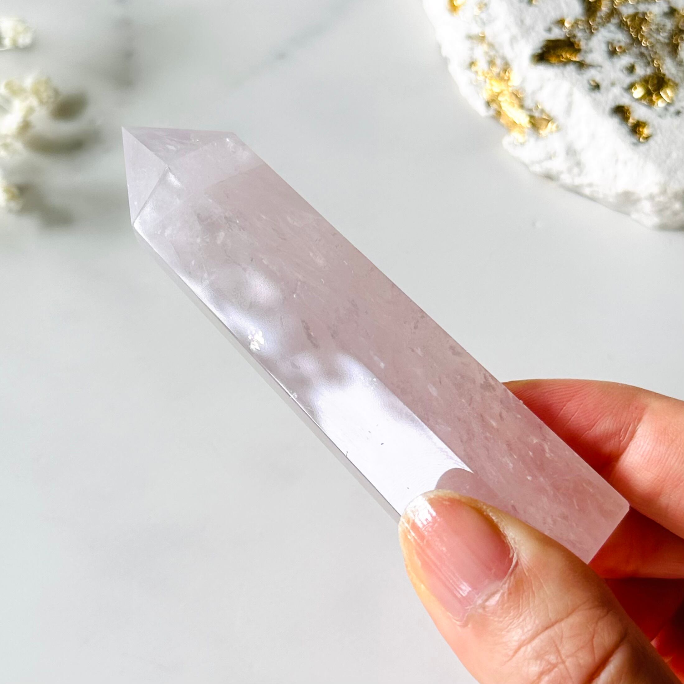 薄いラベンダーピンクのペリウィンクルローズクォーツのタワーです。淡いラベンダーピンクのタワーの中にはシャリシャリとした虹入りのクラックが入っていてくるくる回すと眩い光を放ちます。淡いピンクにラメのようなキラキラが輝く、女性のときめく要素がたっぷり詰まったアイテムです。