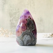 シェブロンアメジストのフリーフォームです。別名ドリームアメジストとも呼ばれています。明るいパープルのアメジストにホワイトクォーツが混ざり、クレージーレースアゲートの共生も見られます。自然の模様がアートのようです。内部のクォーツがキラキラと繊細に煌めきます。カッティングもとても美しいアイテムです。