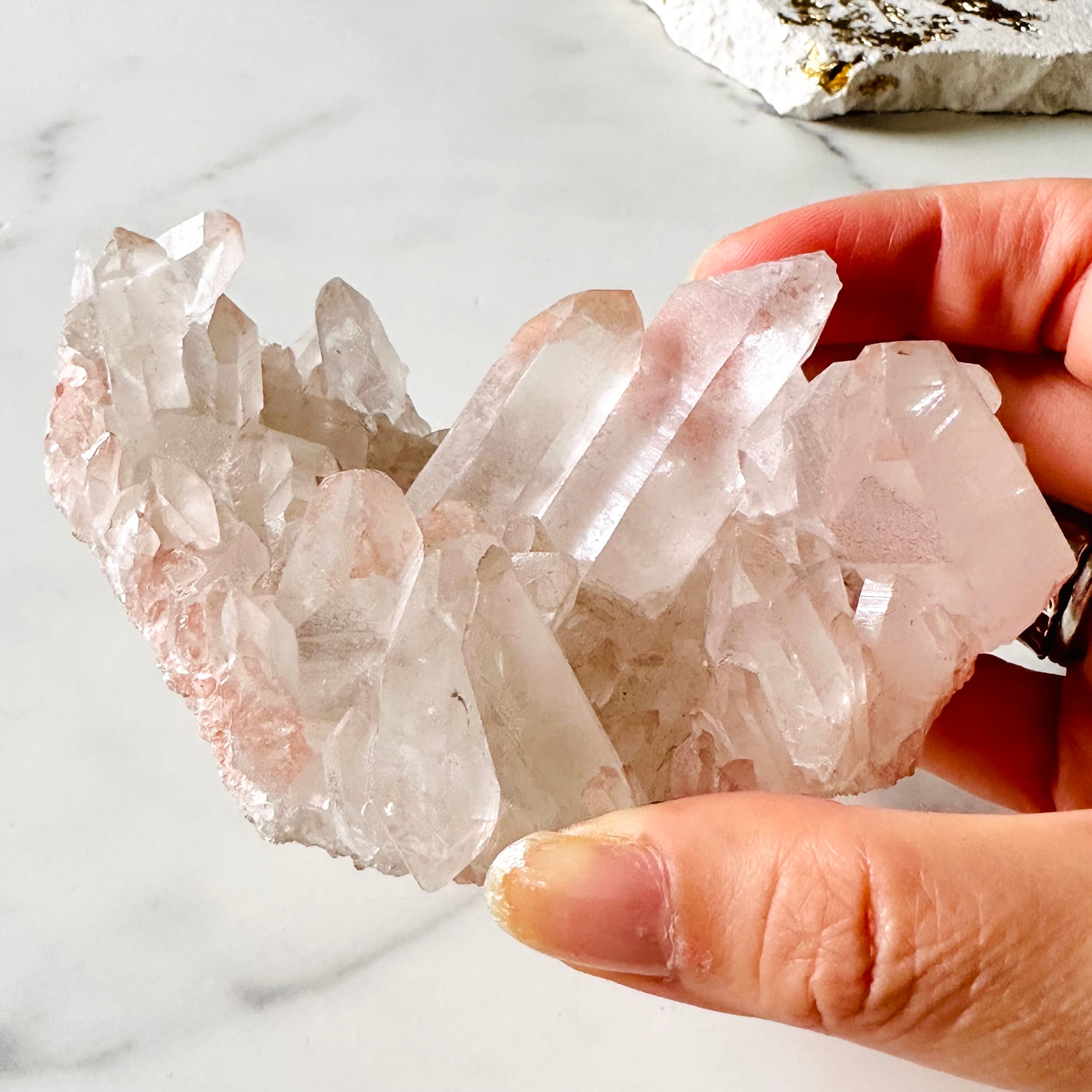 ほんのりピンク色が可愛いピンク水晶のクラスターです。この色合いは酸化したヘマタイトで、ピンクの色味が濃く多いほど人気です。