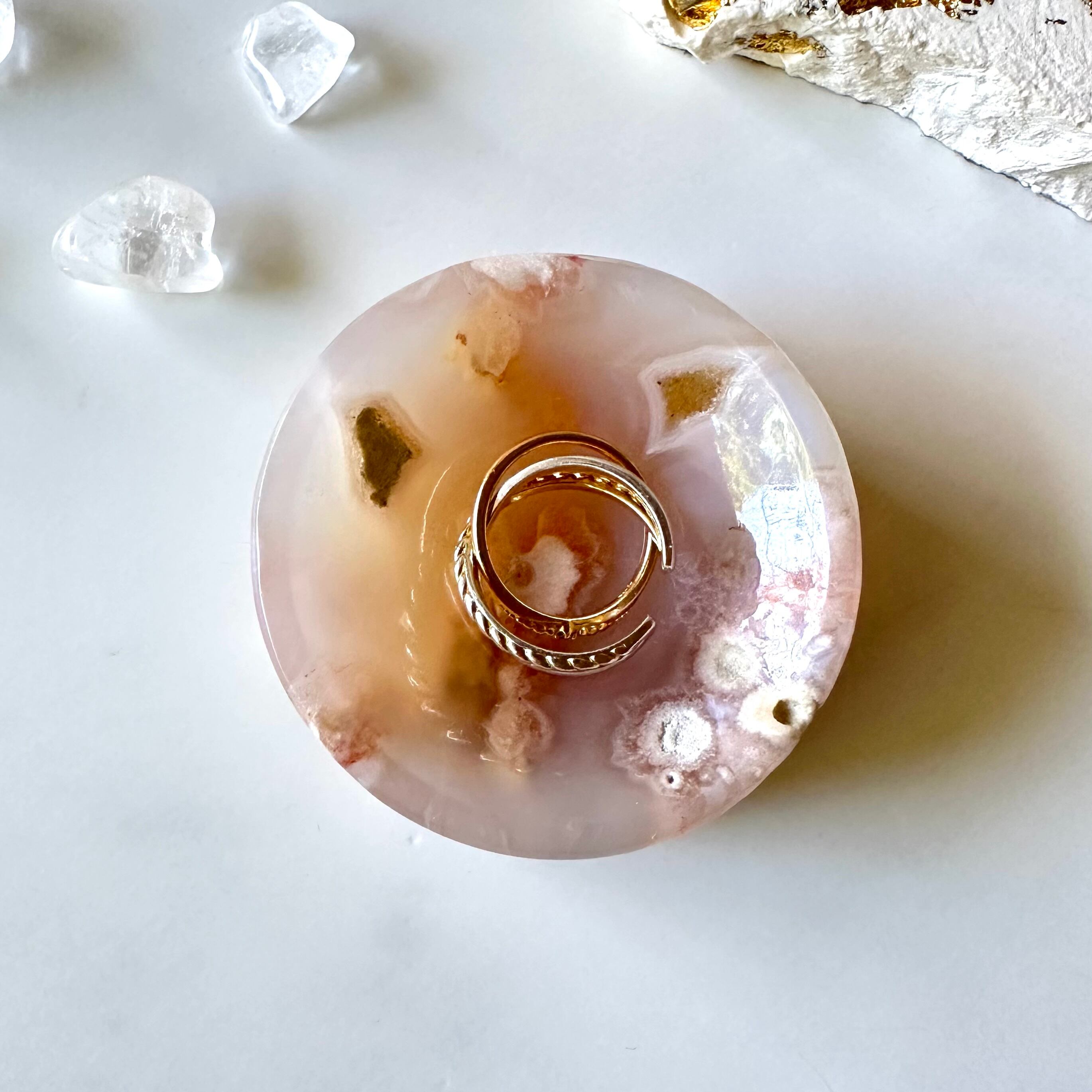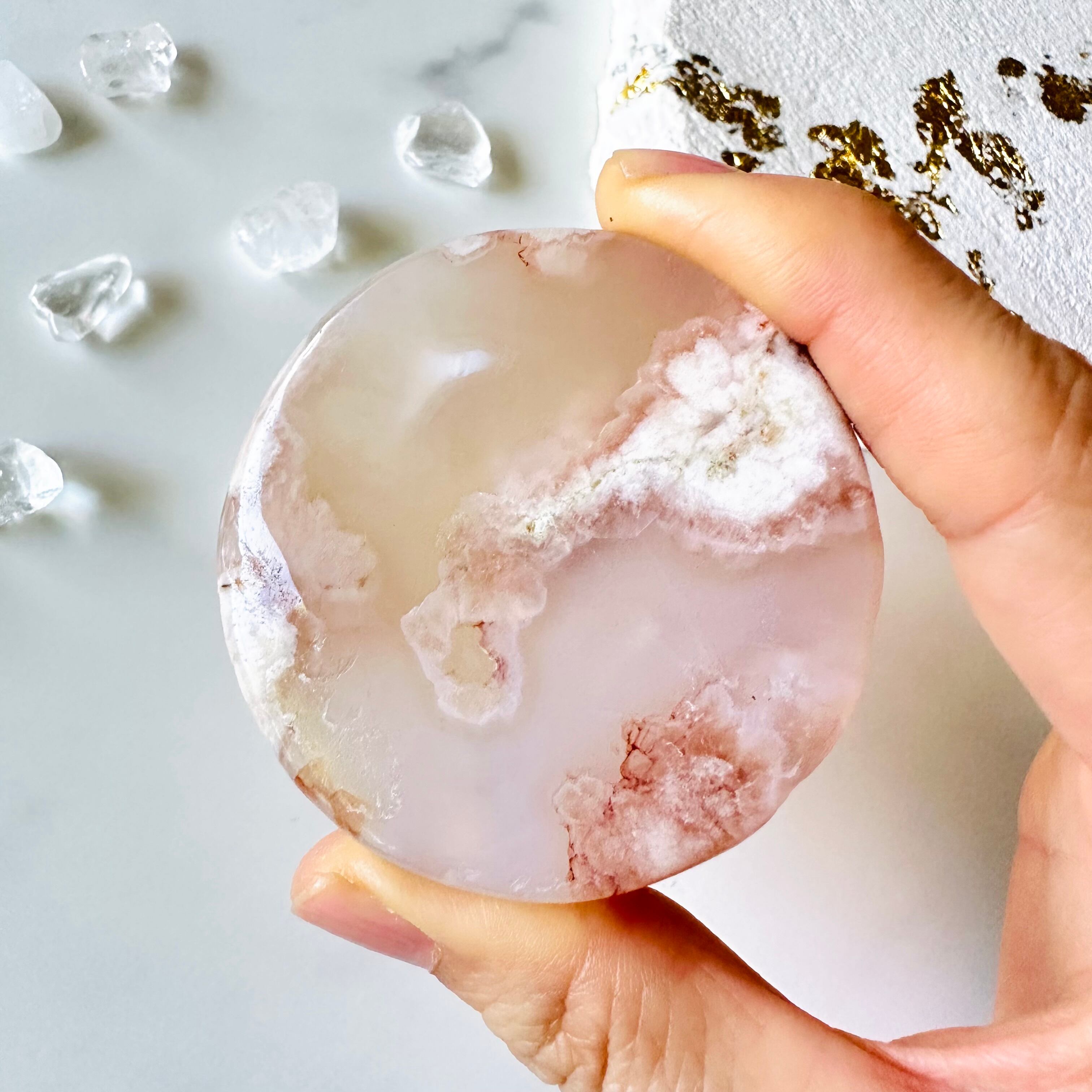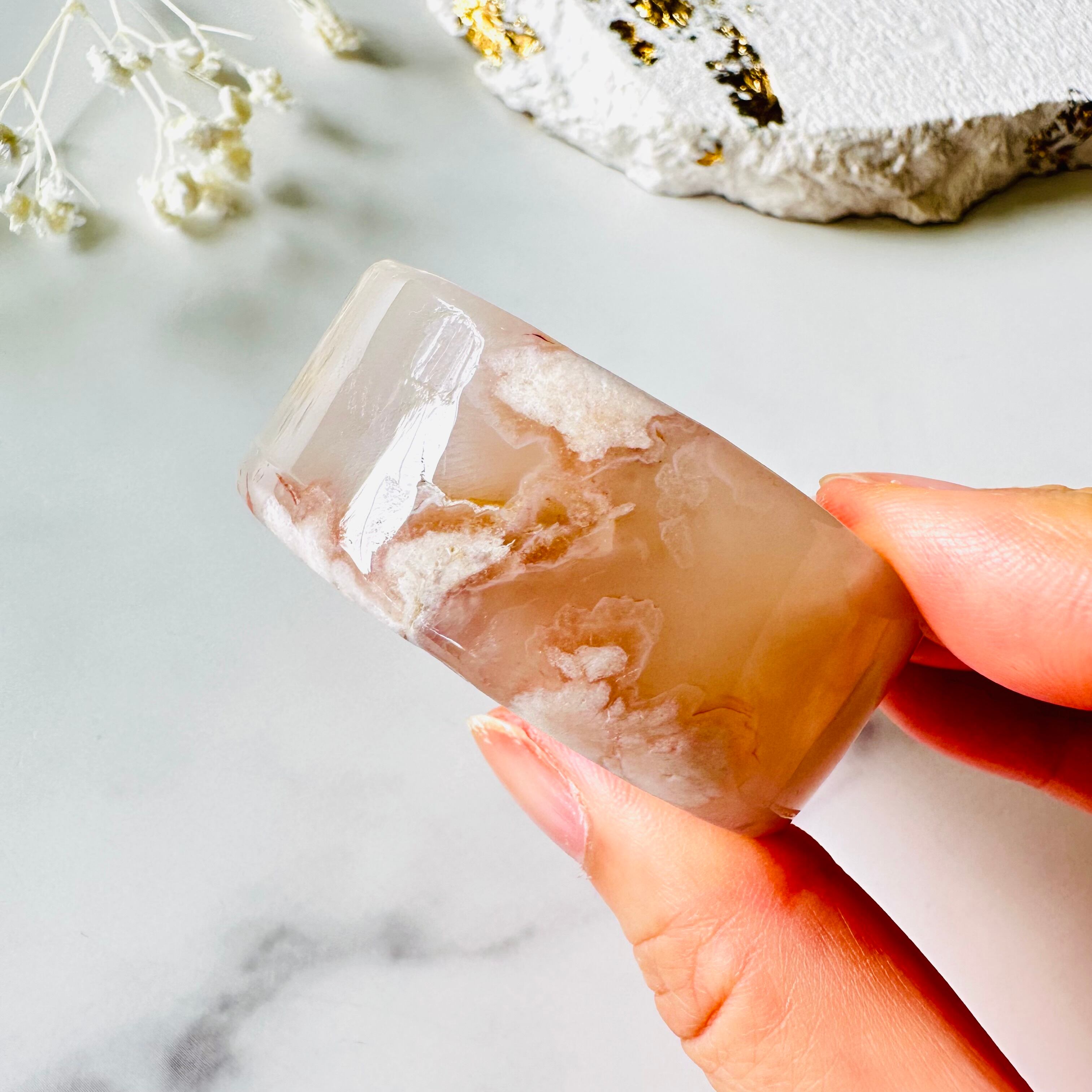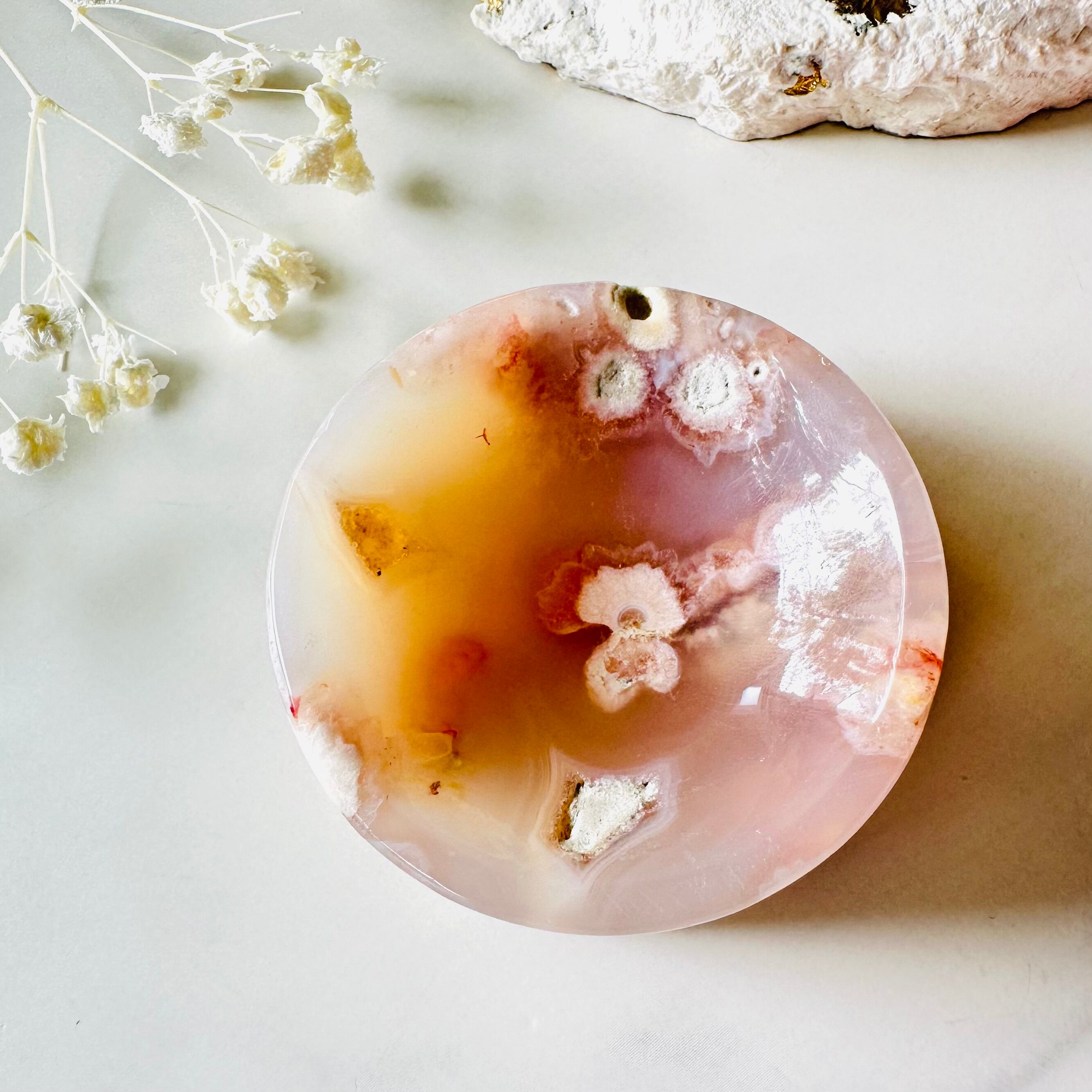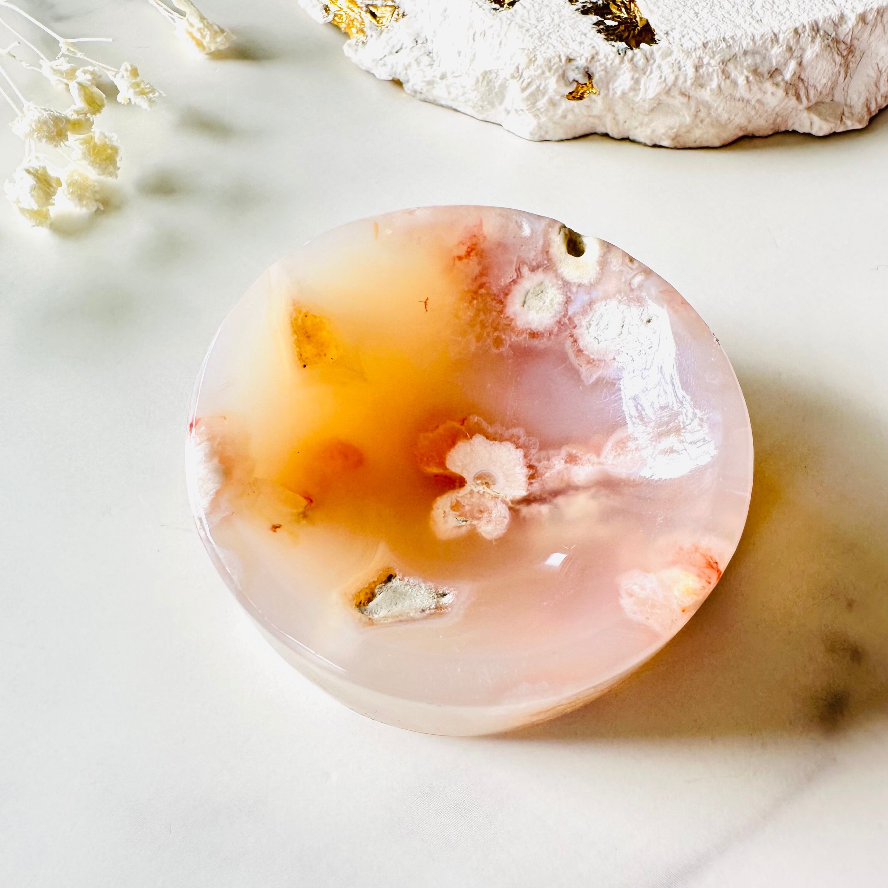 アゲートの中に独特の内包物を持ち、それが桜の花の模様のように見えることから、別名サクラメノウとも呼ばれます。大人っぽいニュアンスのあるピンク色で、リングやピアスなどのアクセサリーを入れてもよさそうです。