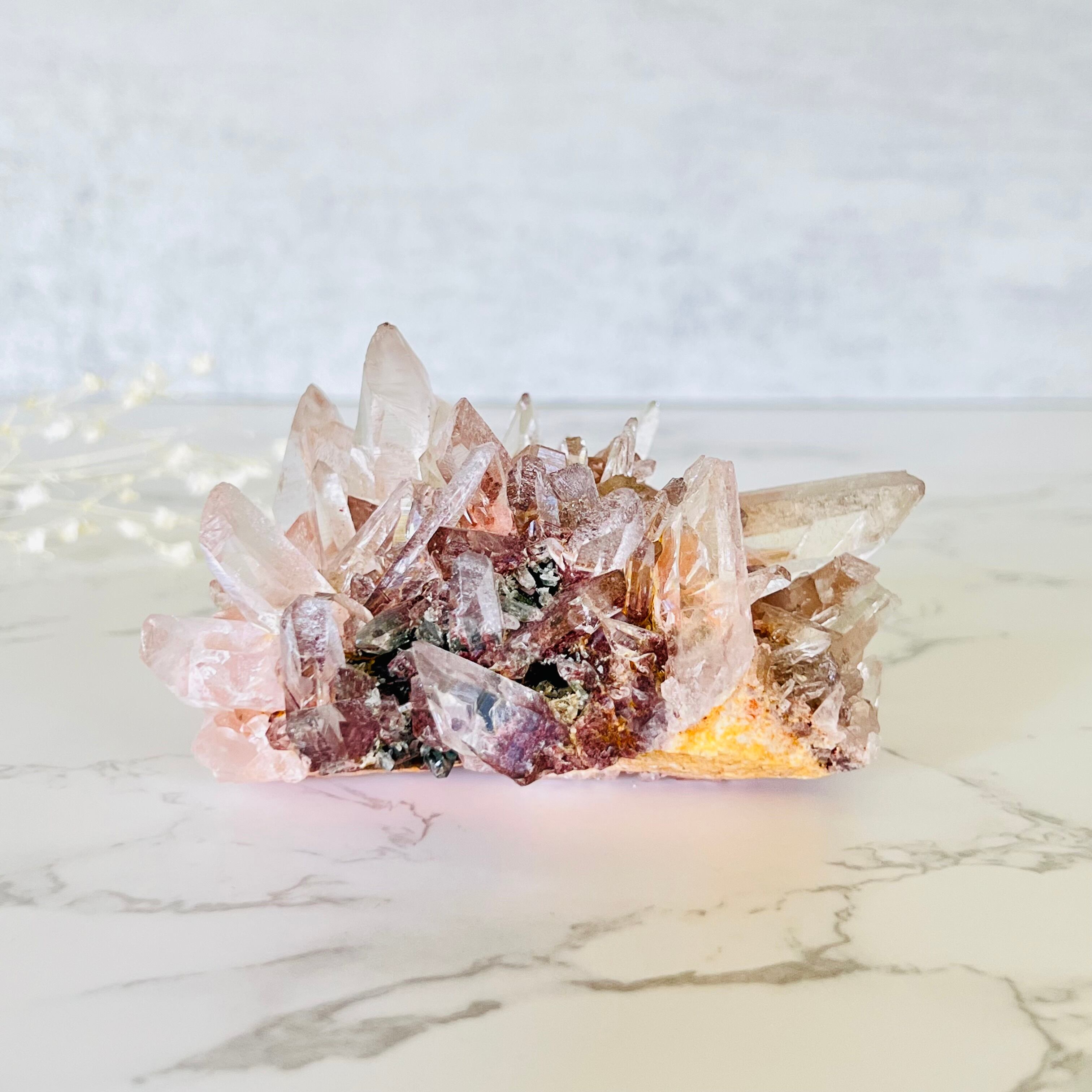 しっかりと濃いピンク色が特徴的なマ二カラン産水晶のクラスターです。