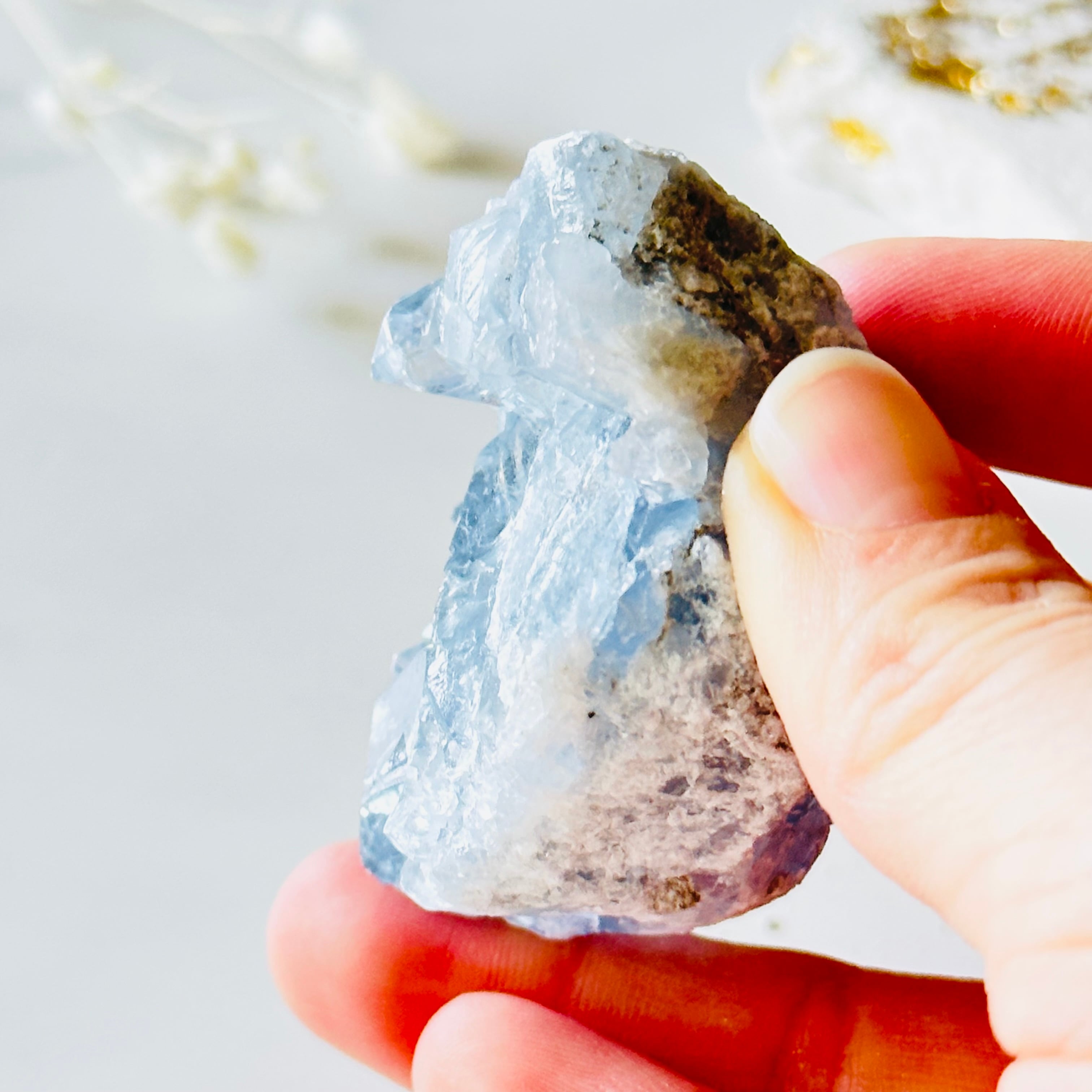 美しい氷の結晶をギュッと詰め込んだようなアイスブルーのセレスタイトです。透明度の高い蒼い結晶がとても綺麗で、光を受けてキラキラ輝きます。