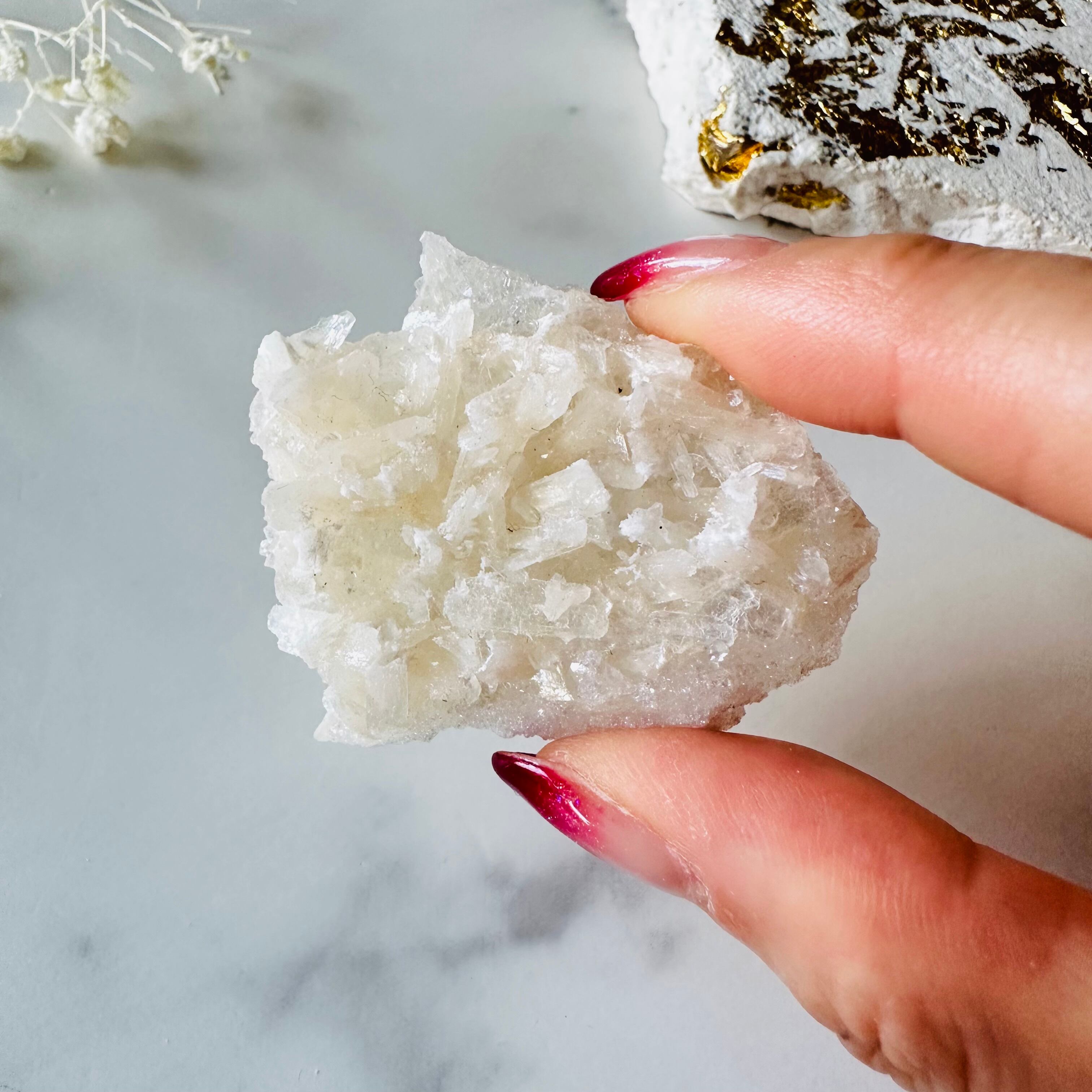 薄いシート状でキラキラした姿は、グラニュー糖をまぶした砂糖菓子のようでもあり、手のひらに乗せたらスッと溶けてしまう儚い雪の結晶のようでもあります。ほんのりベージュピンク色のスティルバイトが共生していて思わずきゅんとなるアイテムです。角度を変えるとスティルバイトがキラキラと繊細に煌めきます。裏面側もお砂糖のようにキラキラとしています。