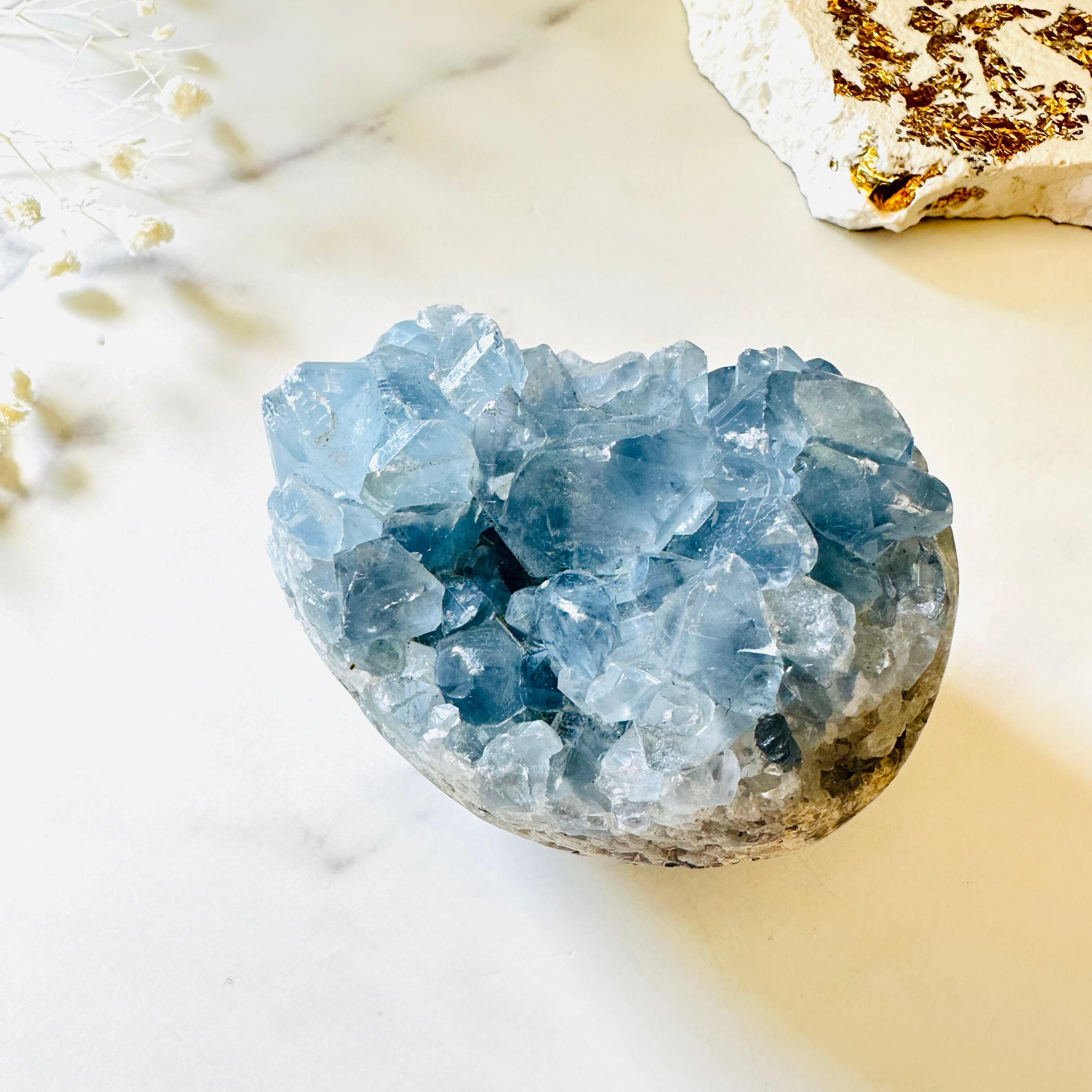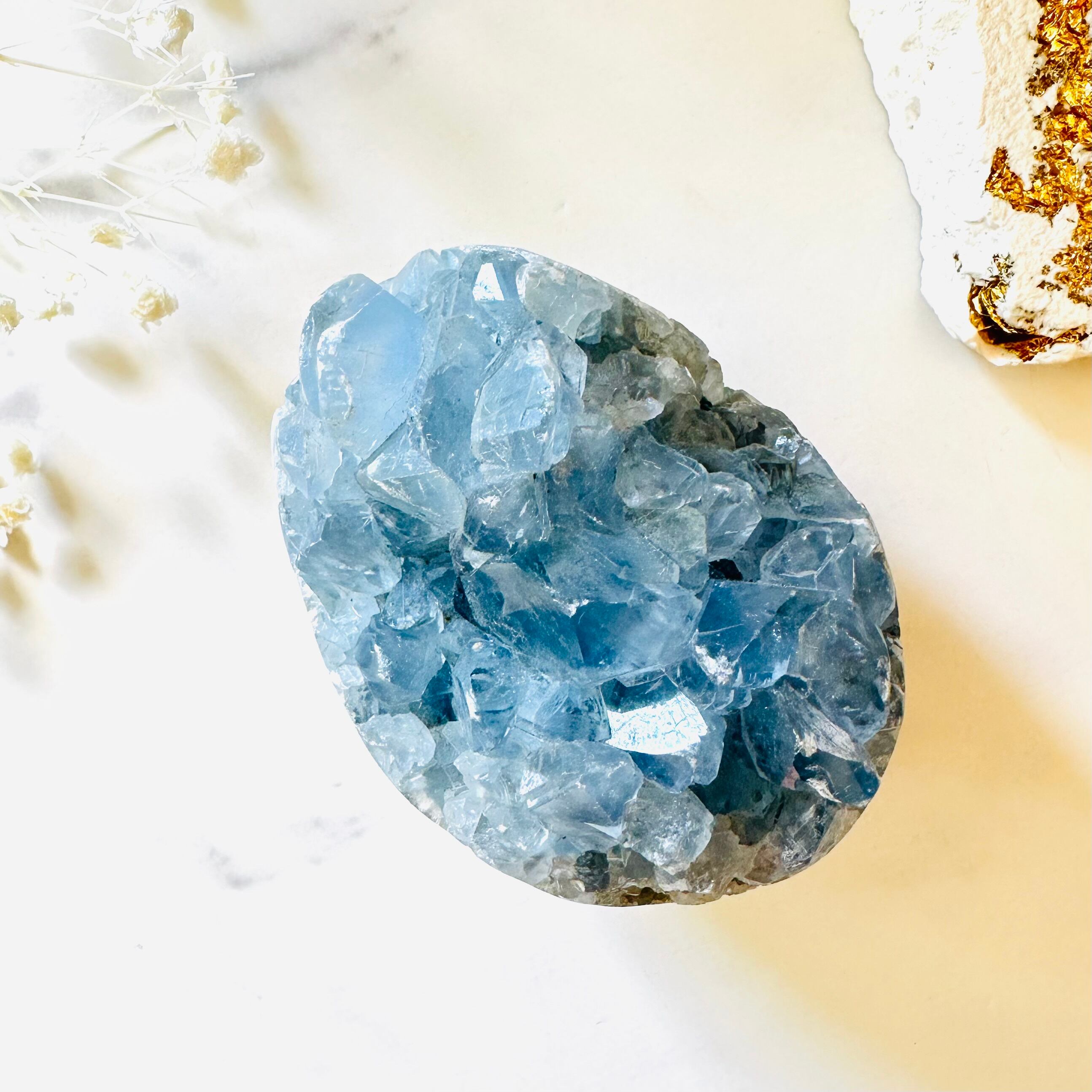 優しい青と癒しの波動で、心が解けていきます。卵から飛び出した結晶のクラスターが光を受けてキラキラ輝きます。セレスタイトは脆い石ですが、底面も母岩が少なく結晶をよく磨いてありますのでこぼれにくく扱いやすいです。光に当てるとキラキラとしてとても綺麗です。