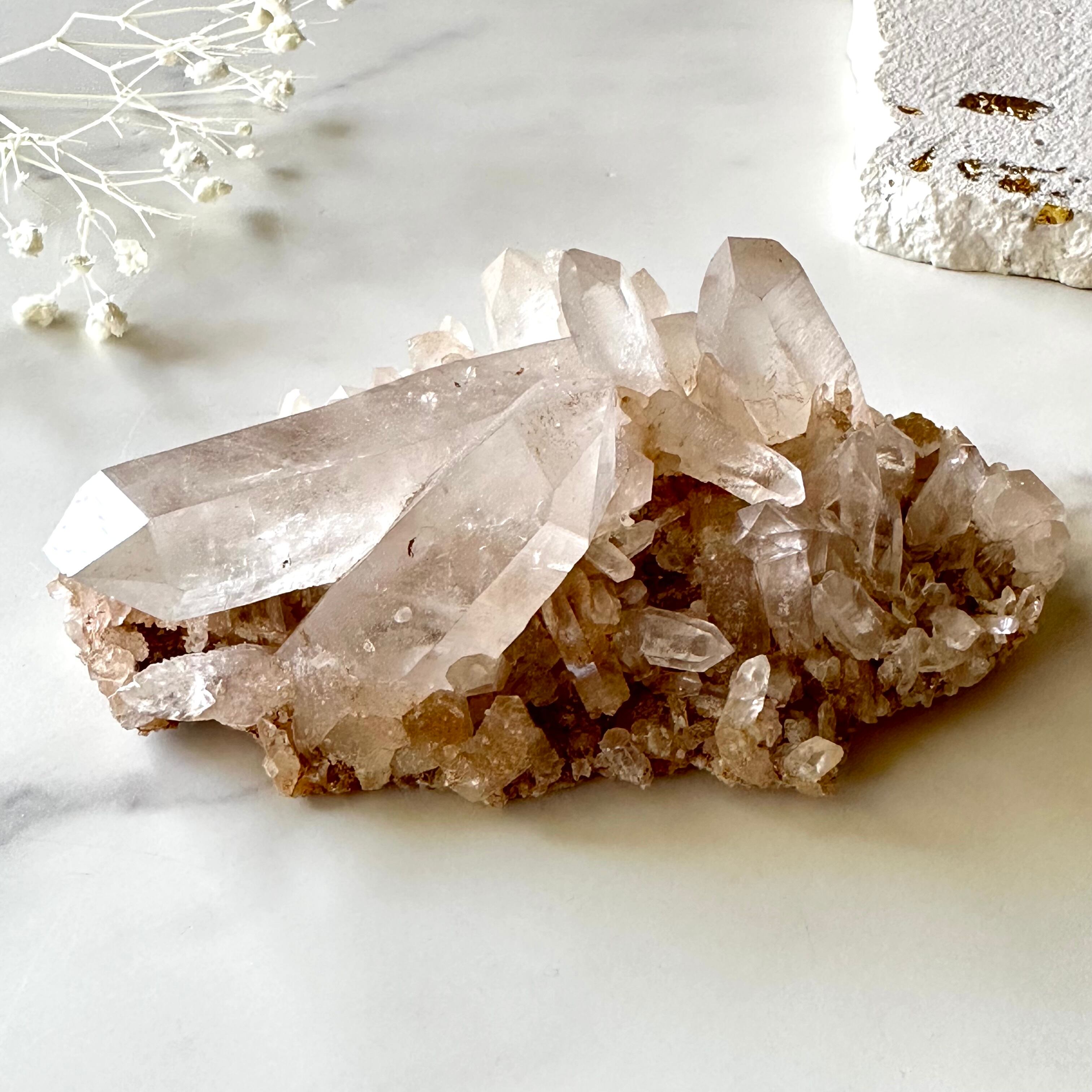 ピンクに色づいたマ二カラン産水晶のクラスターです。