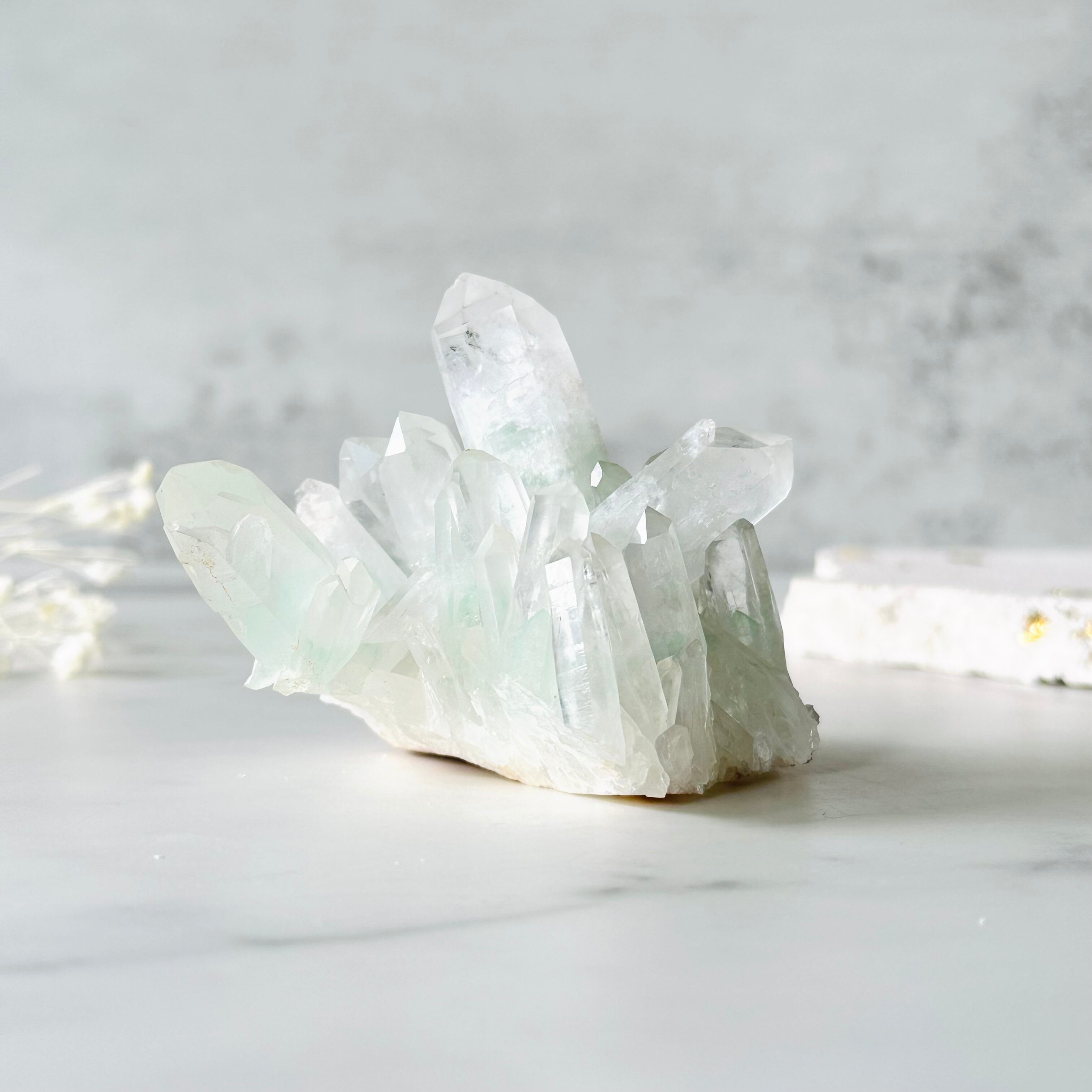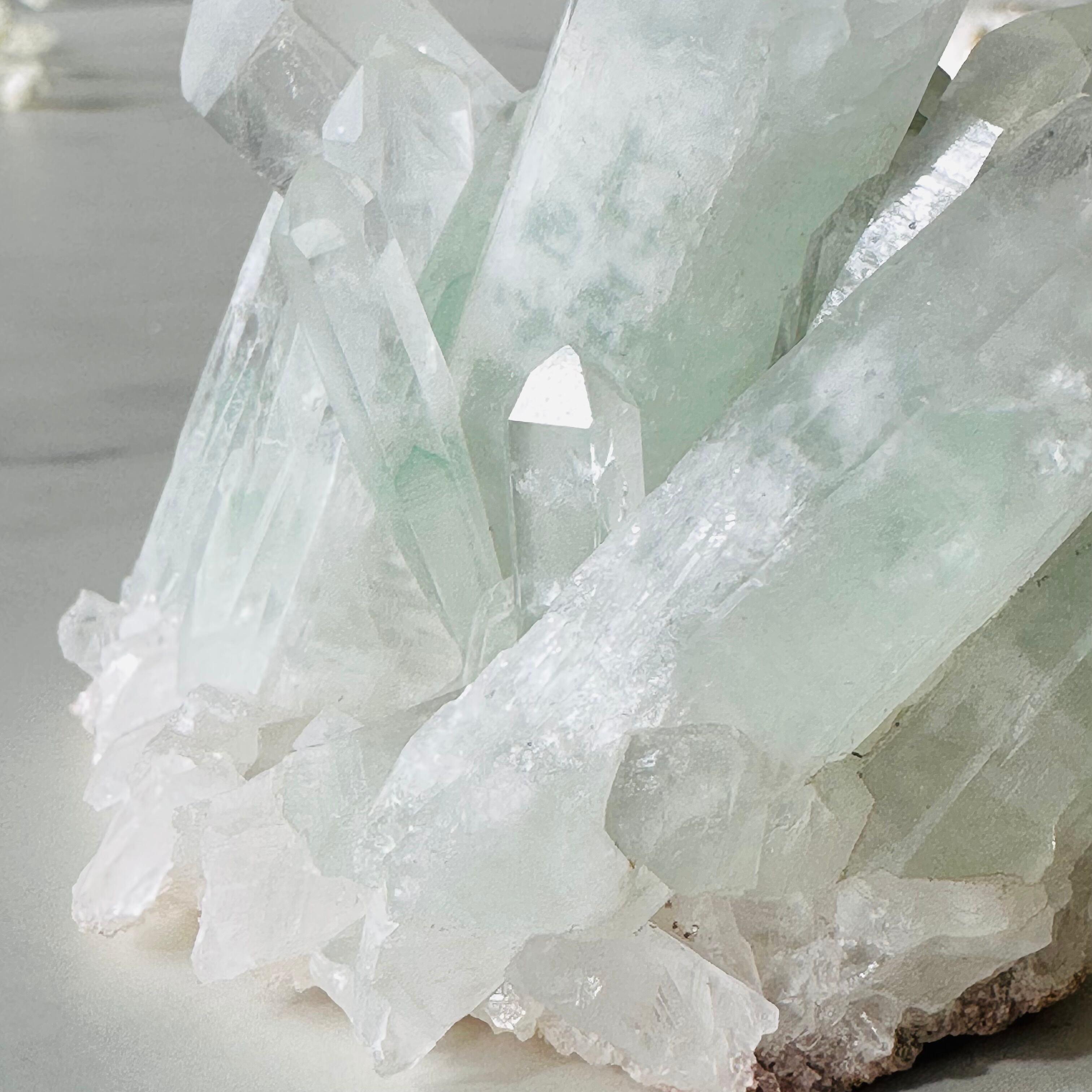 白いすりガラスのようなクォーツの質感と、パステルカラーのグリーンファントムが優しい雰囲気です。この緑色はフックサイトによるもので大変希少価値のあるものです。今や入手困難となったグリーンファントムのクラスター。高価ではありますが、今回は比較的お求めやすいお値段で、綺麗な個体を入手することができました。この機会にぜひお手に取ってみてください。