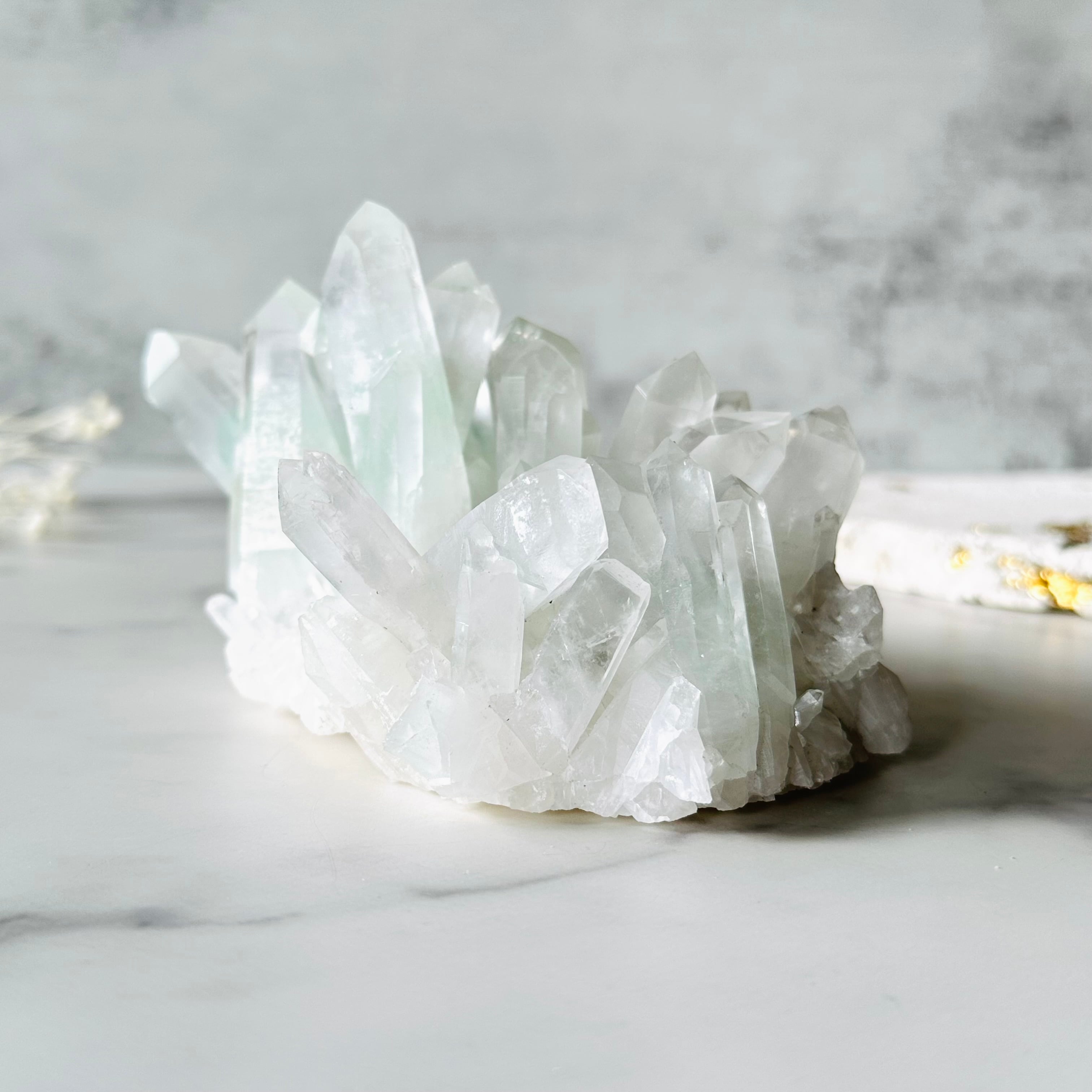 白いすりガラスのようなクォーツの質感と、パステルカラーのグリーンファントムが優しい雰囲気です。この緑色はフックサイトによるもので大変希少価値のあるものです。今や入手困難となったグリーンファントムのクラスター。高価ではありますが、今回は比較的お求めやすいお値段で、綺麗な個体を入手することができました。この機会にぜひお手に取ってみてください。