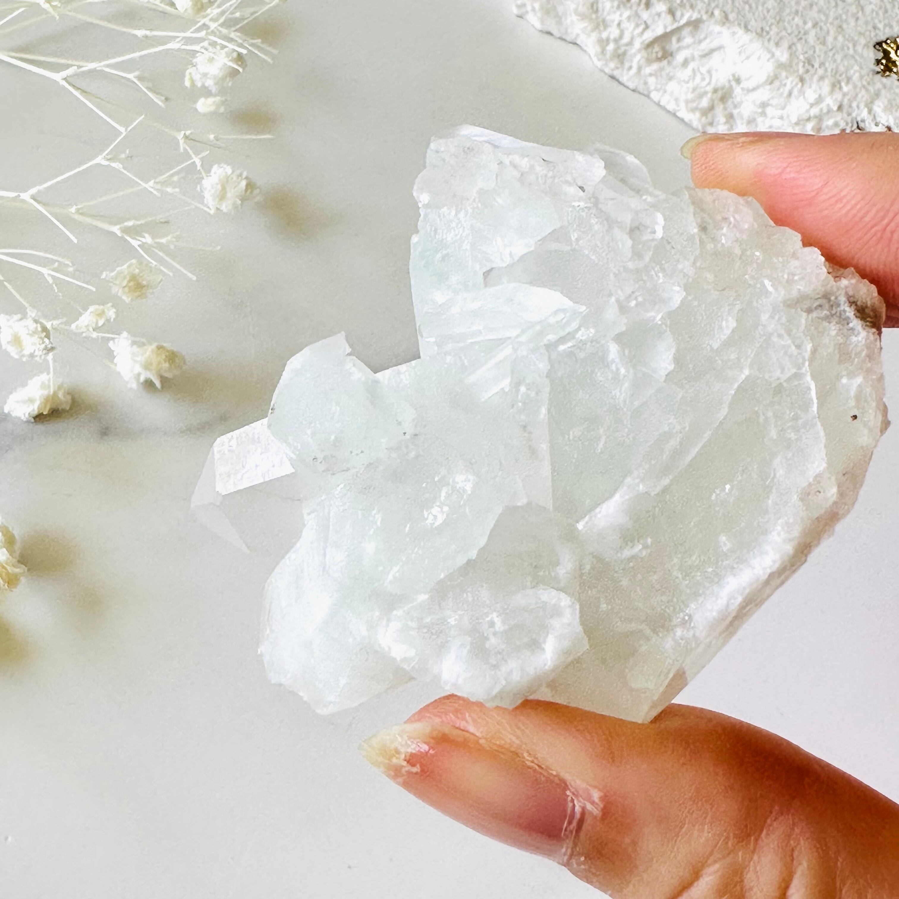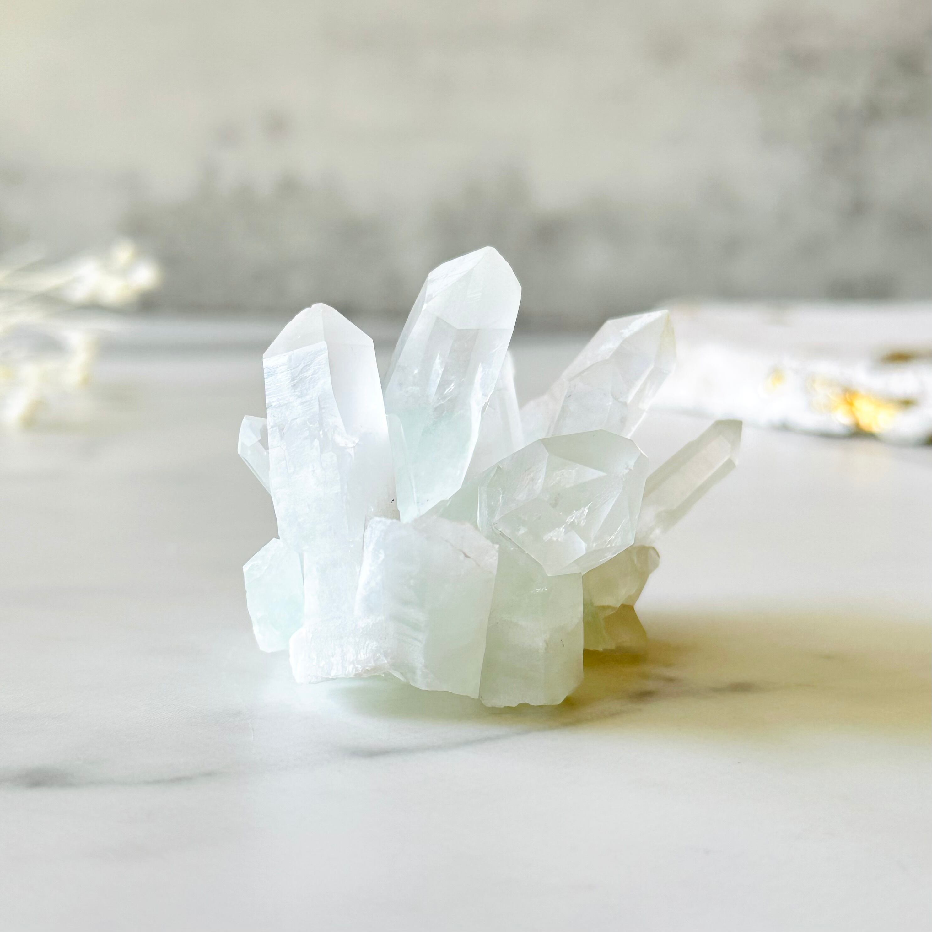 白いすりガラスのようなクォーツの質感と、パステルカラーのグリーンファントムが優しい雰囲気です。この緑色はフックサイトによるもので大変希少価値のあるものです。今や入手困難となったグリーンファントムのクラスター。高価ではありますが、今回は比較的お求めやすいお値段で、綺麗な個体を入手することができました。この機会にぜひお手に取ってみてください。