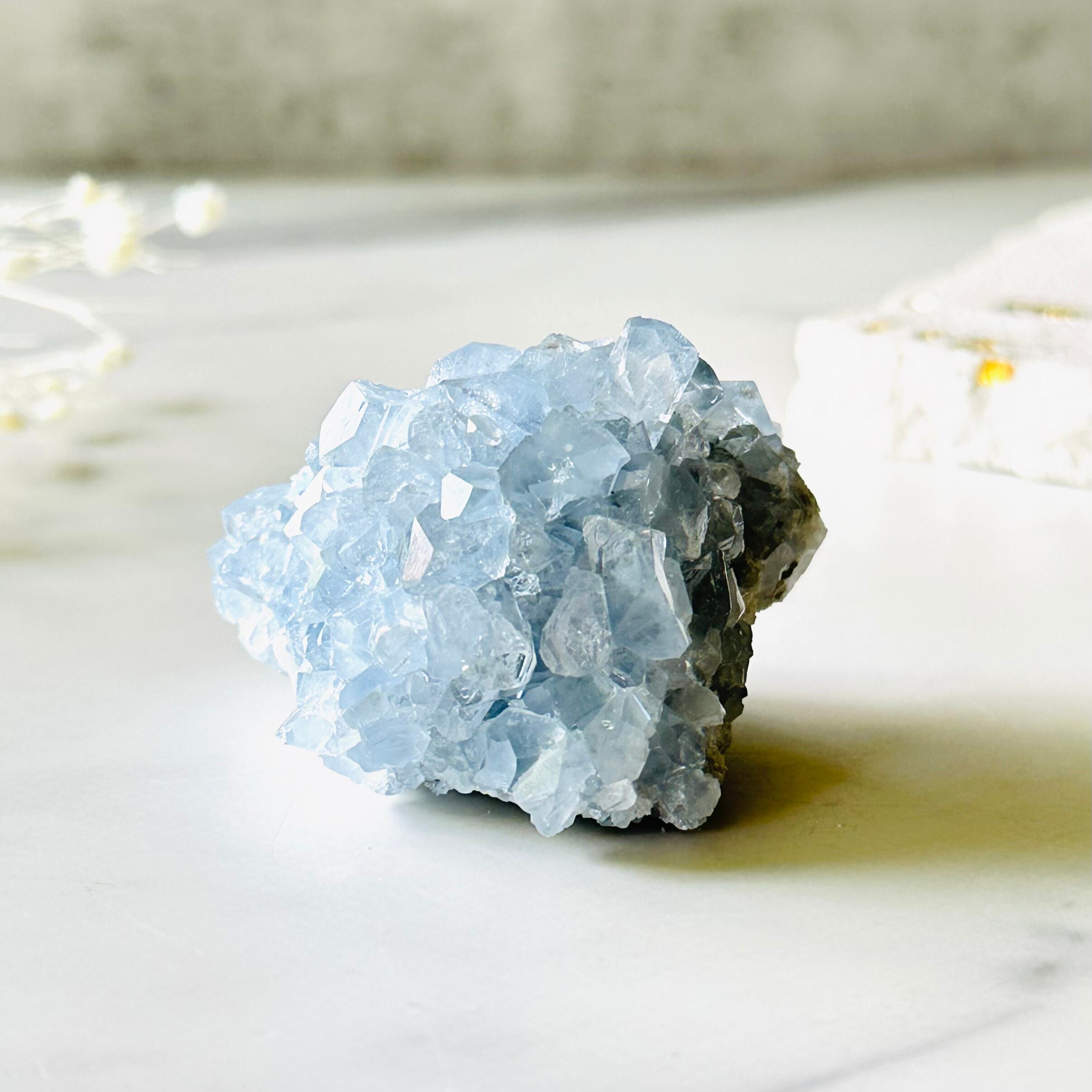 美しい氷の結晶をギュッと詰め込んだようなアイスブルーのセレスタイトです。透明度の高い蒼い結晶がとても綺麗で、光を受けてキラキラ輝きます。