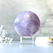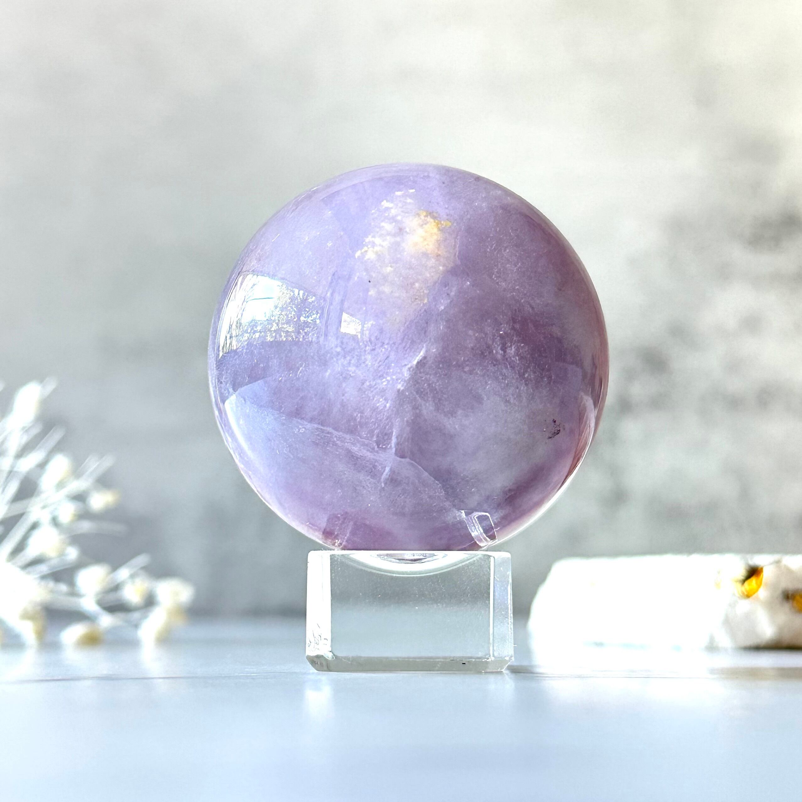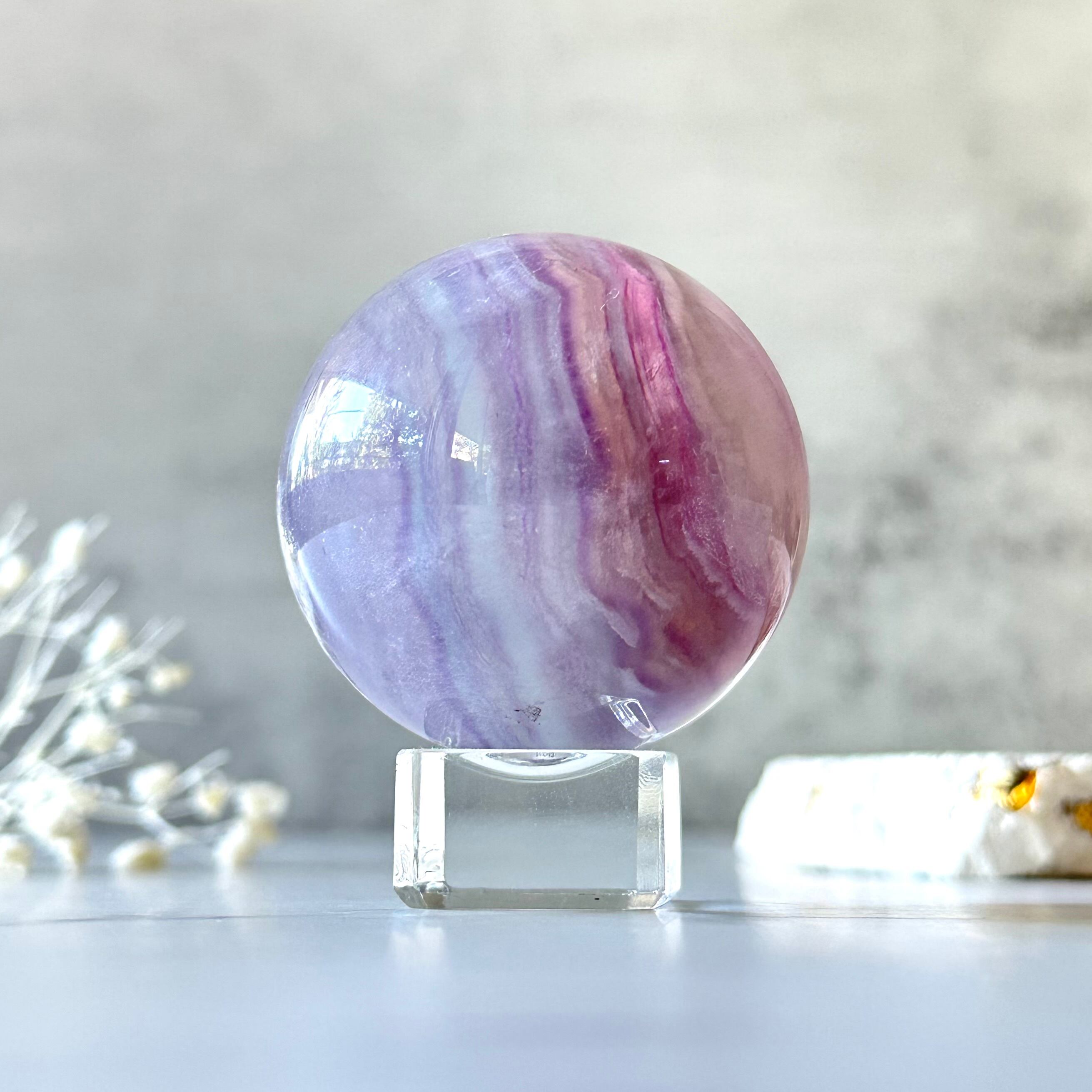 優しいパープルと水色が地層のように重なり、溶け込みあっていて幻想的で美しいスフィアです。中央部分には年輪のような美しい模様が見られます。虹もたっぷり楽しめます。氷のようなシャリシャリ部分がキラキラと輝き、角度によって色合いが変わるので見ていて飽きることがありません。