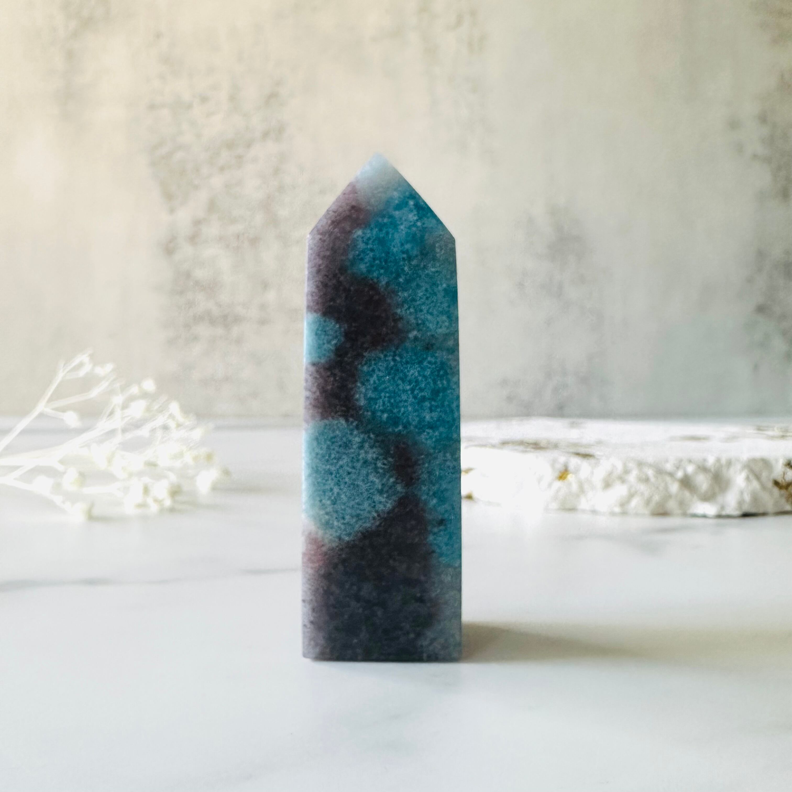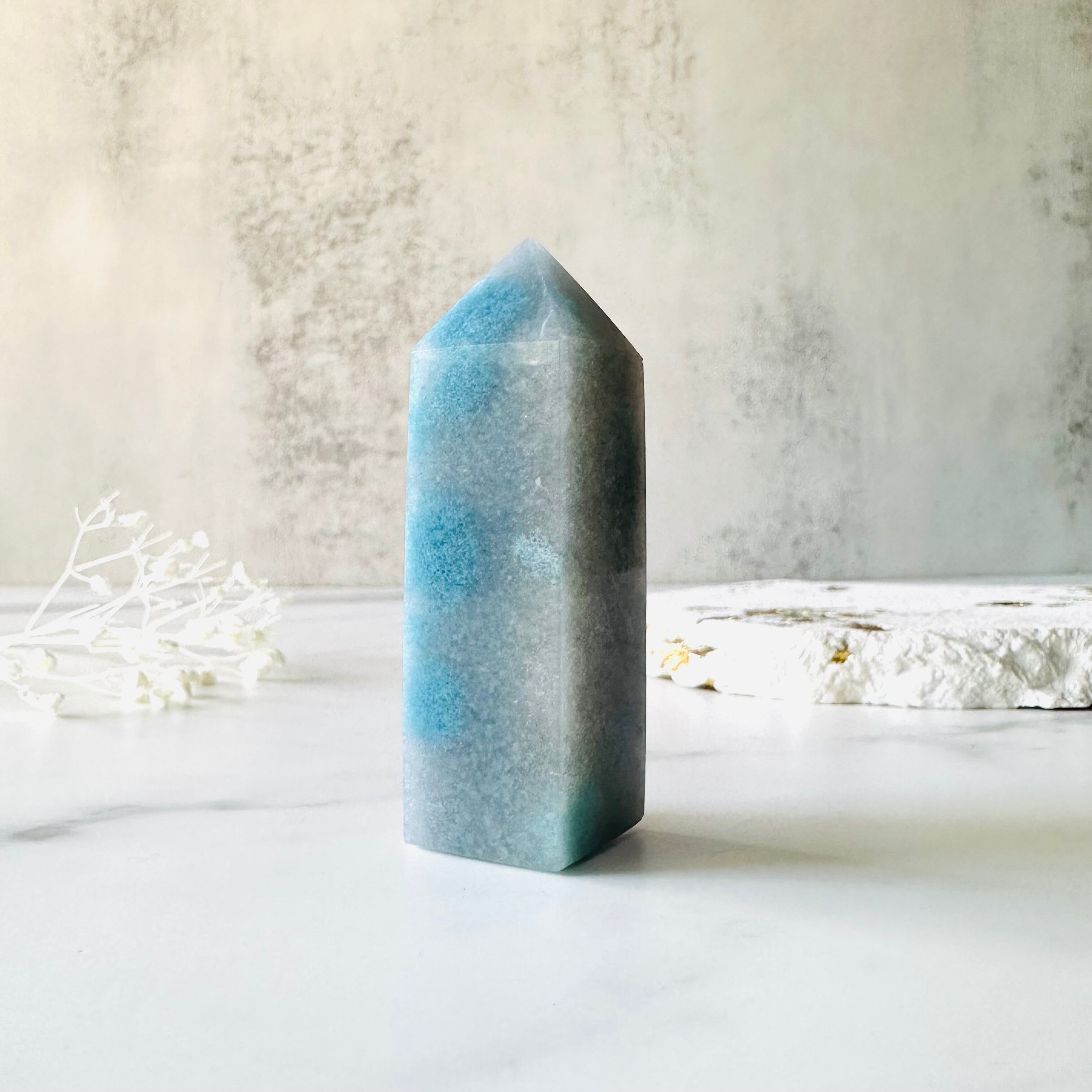 ふんわりとした抽象的な印象のあるトロレアイト。絵本の中の世界のようにメルヘンで可愛らしく、どこか懐かしい気持ちにさせてくれる不思議な雰囲気を持つ石です。明るい水色が綺麗で赤みを帯びた藍色が水玉模様のようです。回すと砂浜のようなサンドグレーも魅力的です。