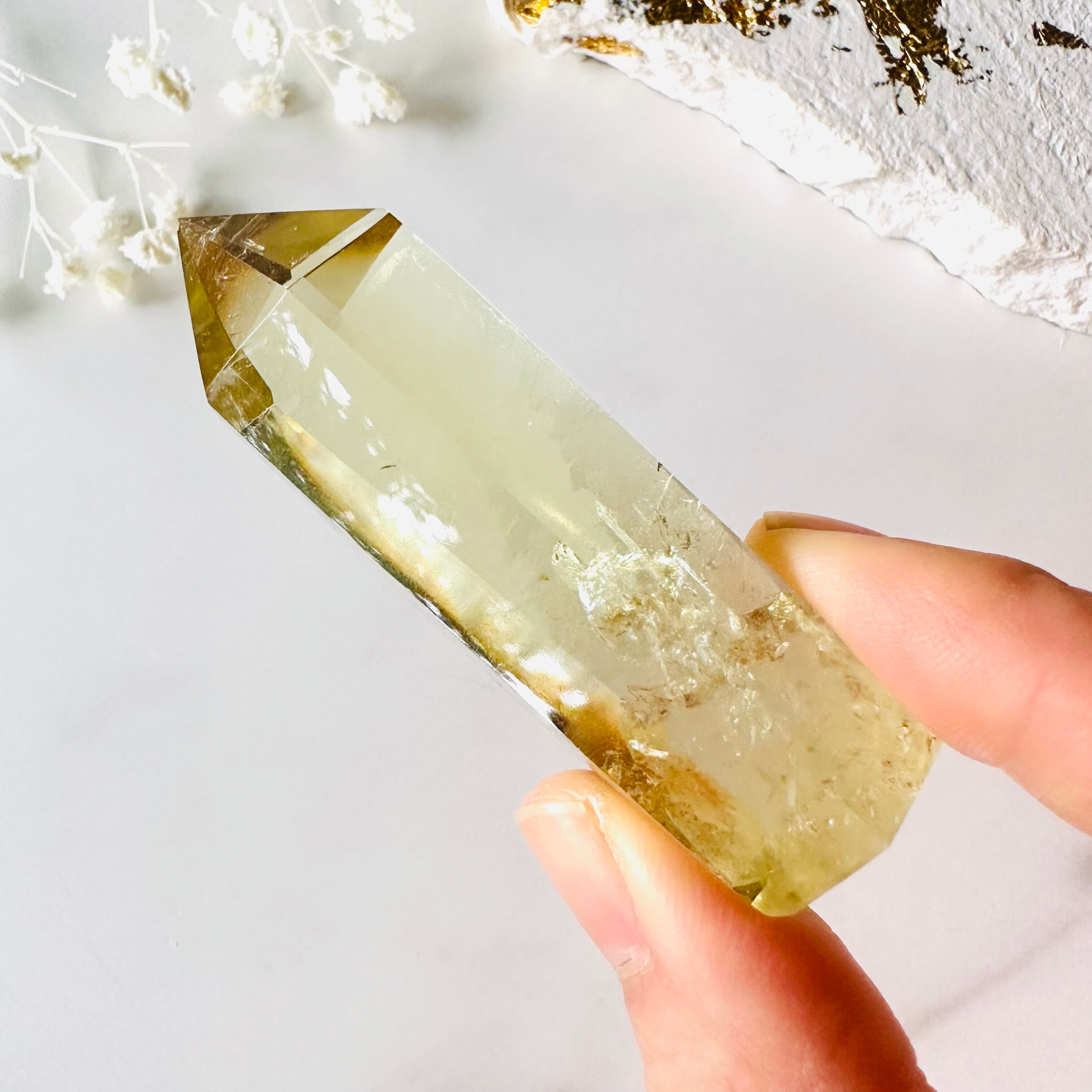 透明度の高いすっきりとした黄色のボディの内側には銀色に輝く内包物が入り、くるくる回すとキラキラと眩しいほどに輝きます。黄色の色は濃いめで内側に蝶の羽のように繊細な虹を閉じ込めています。