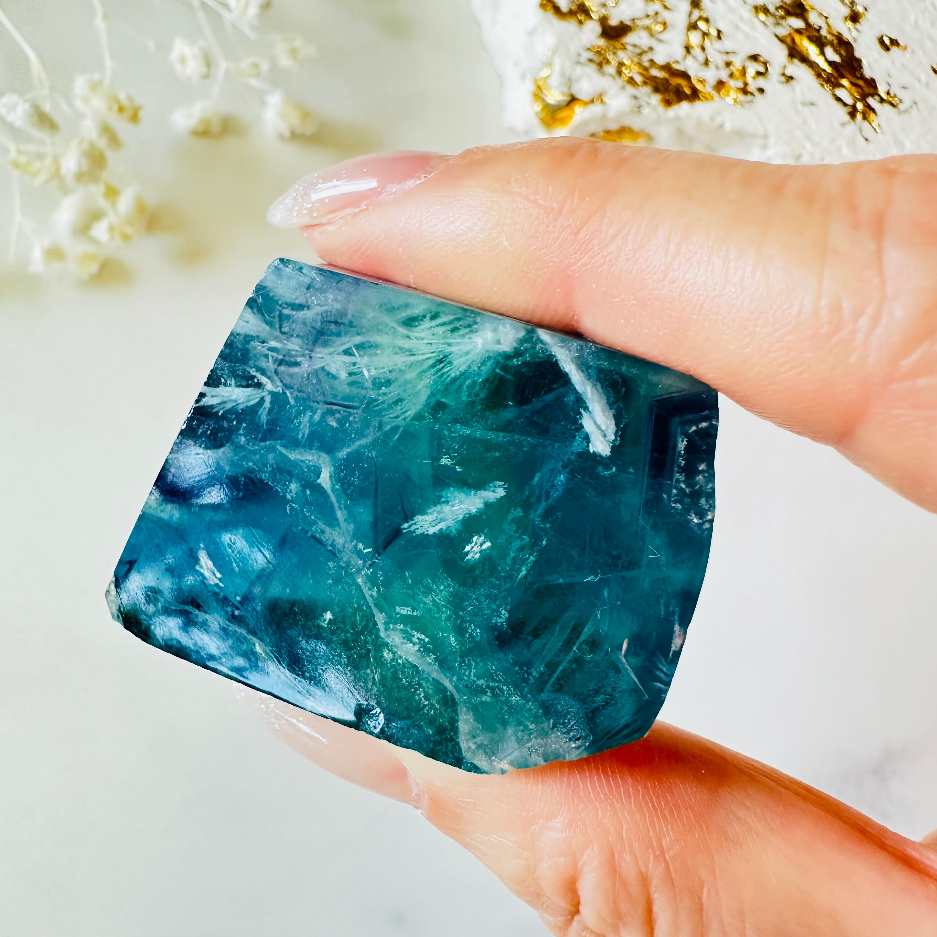 別名をスノーフレイクフローライトともいいます。海のような深いブルーグリーンの中に天使の羽のような白く儚く繊細な模様がキラキラと輝き、その美しさに胸がときめきます。光を当てると深い青とエメラルドグリーンのグラデーションも楽しめます。