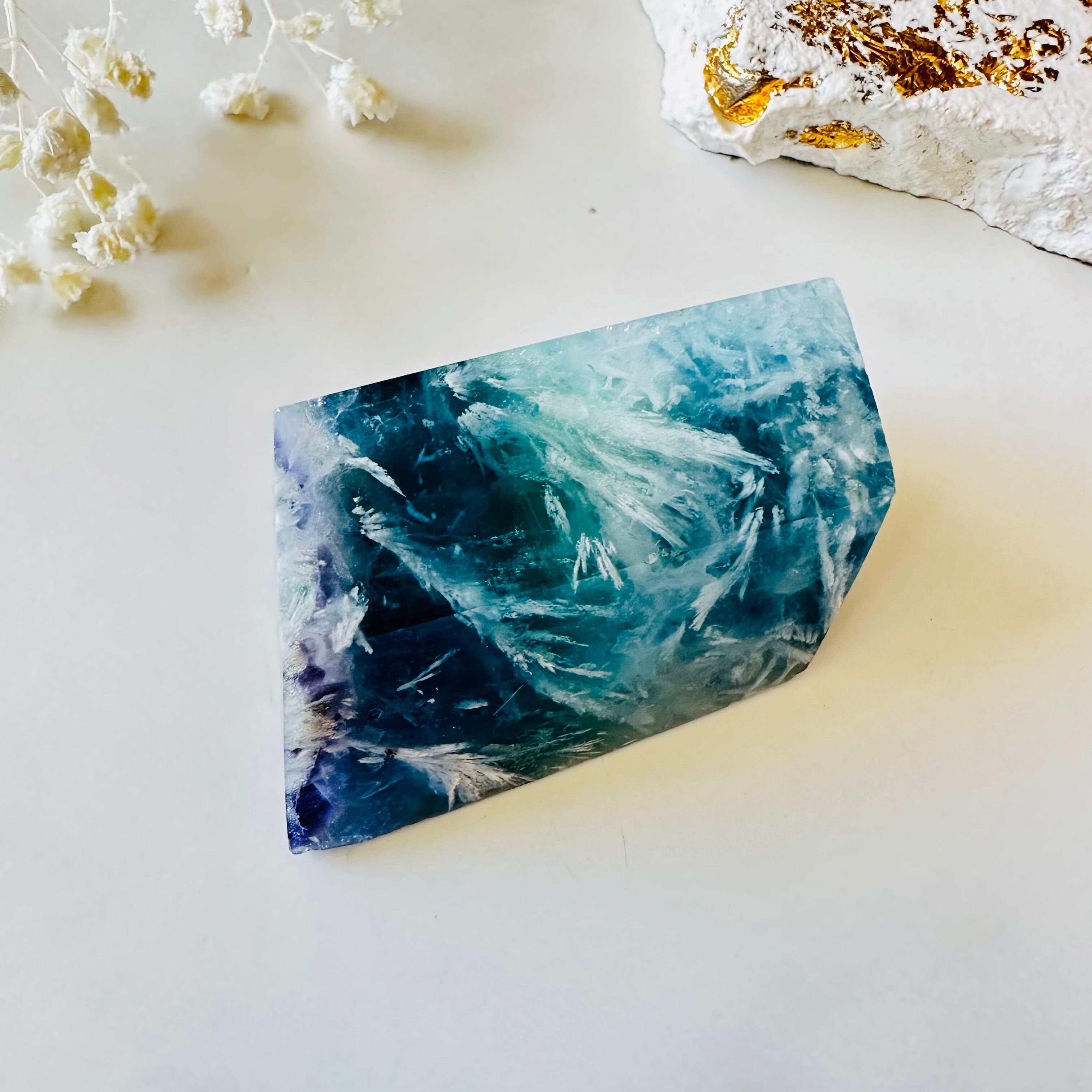 別名をスノーフレイクフローライトともいいます。海のような深いブルーグリーンの中に天使の羽のような、あるいは雪の結晶のような白く儚く繊細な模様がキラキラと輝きその美しさに魅了されます。パープル、ホワイト、グリーンが織りなす絶妙なバランスが世界にたったひとつのアイテムです。